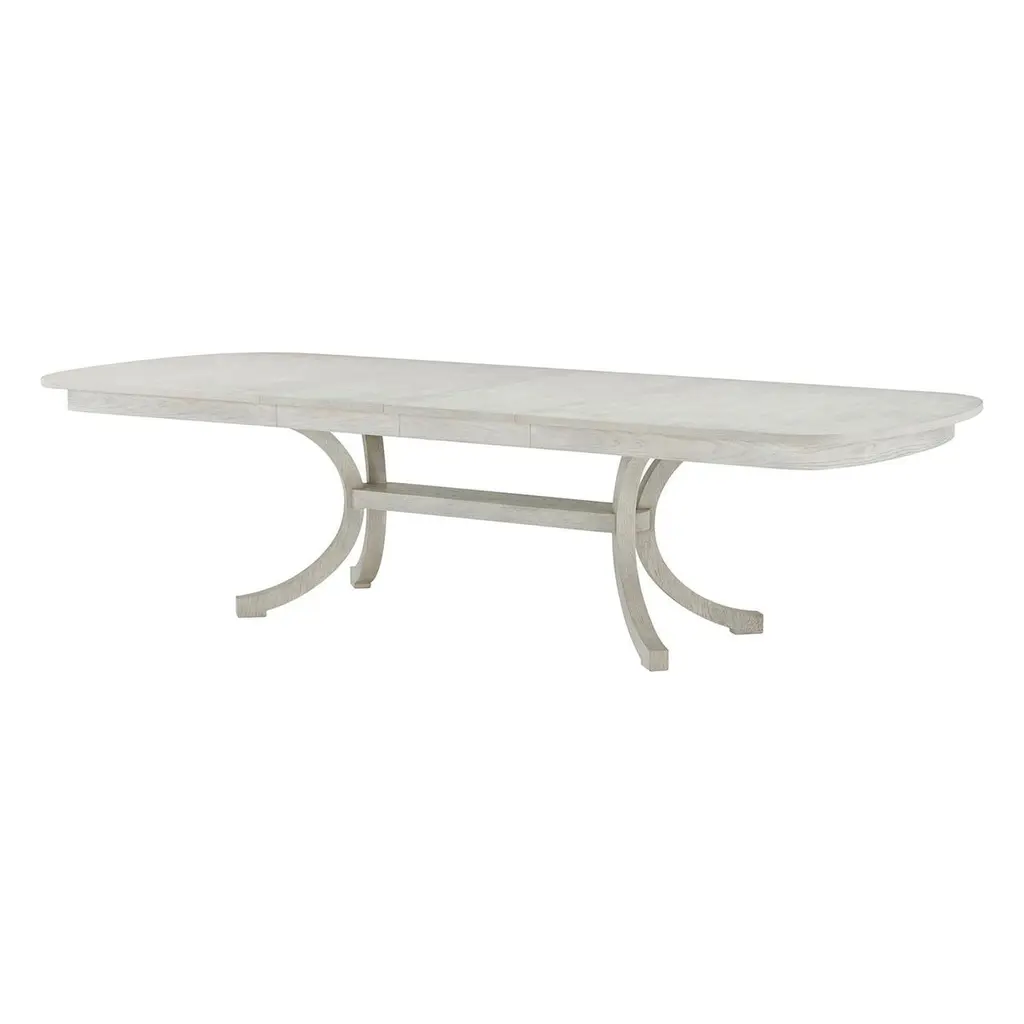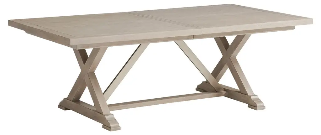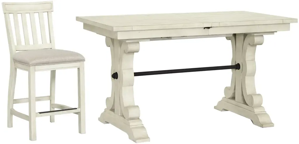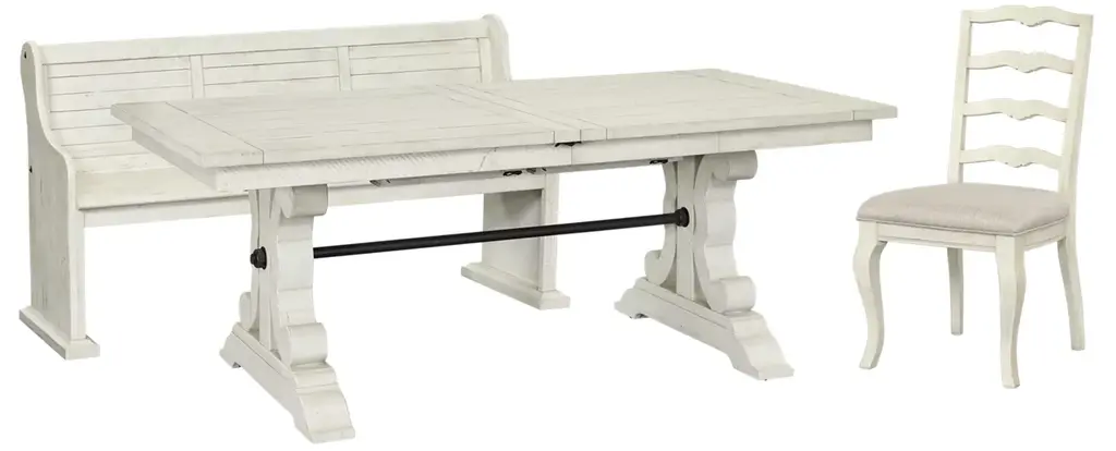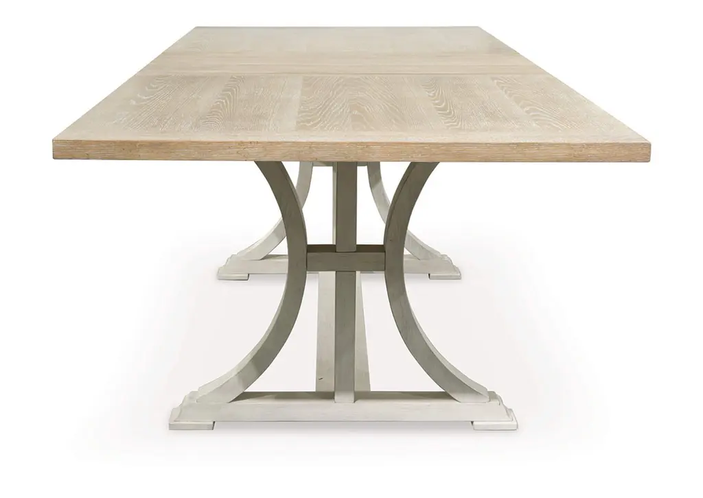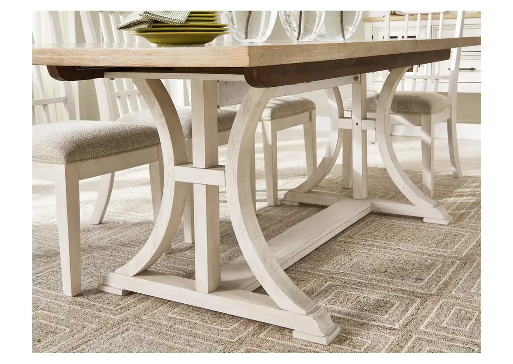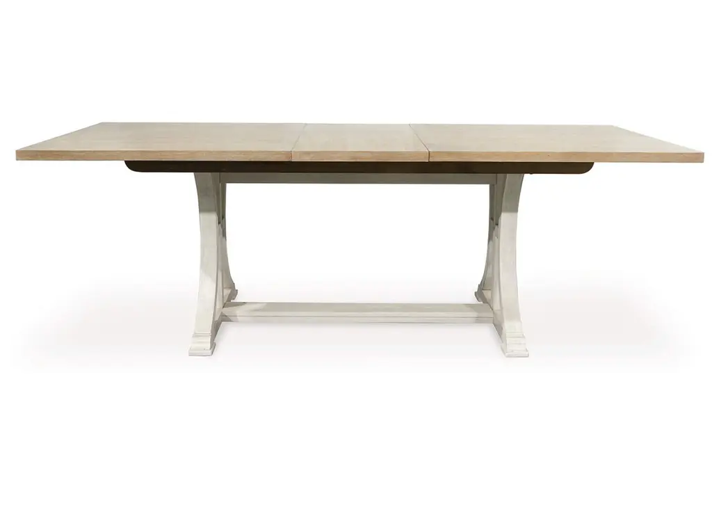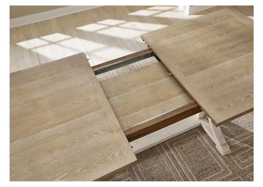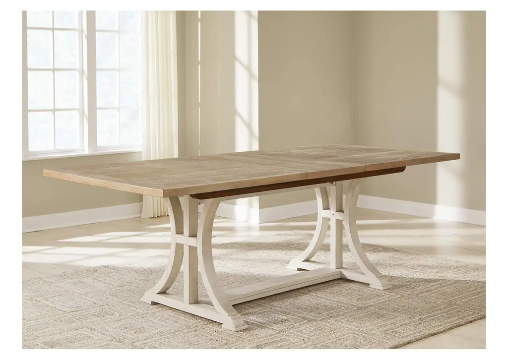 The Shaybrock extension dining table elevates the art of modern farmhouse design. Its charming two-tone aesthetic blends antiqued white and light grayish brown finishes for a feeling of relaxed comfort, while the stylish double trestle base adds a distinctive touch. An extension leaf means there's always room for more guests. Now your only worry is what to serve for dinner. Weight 165.000 lbs. (74.25kgs.)