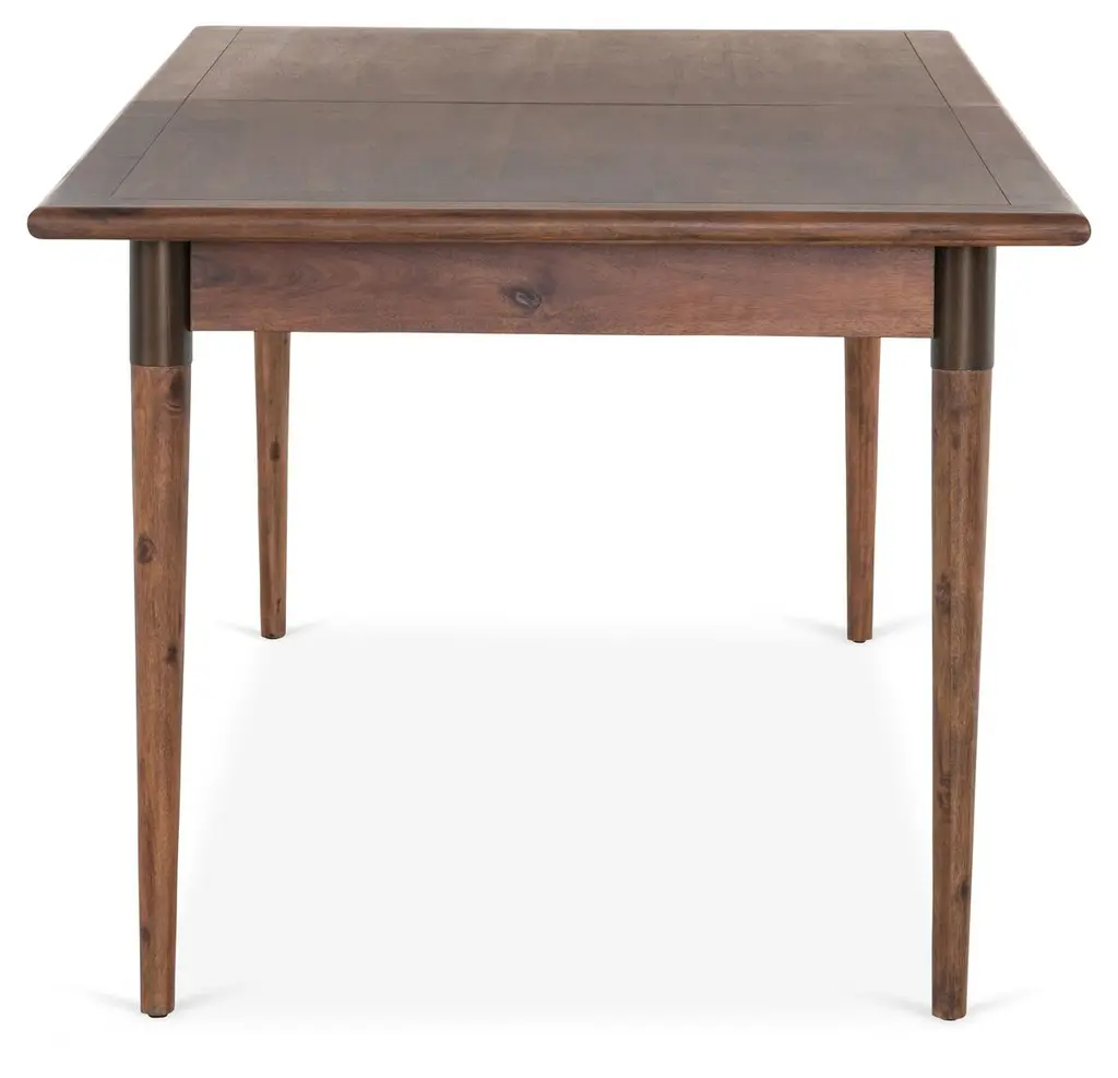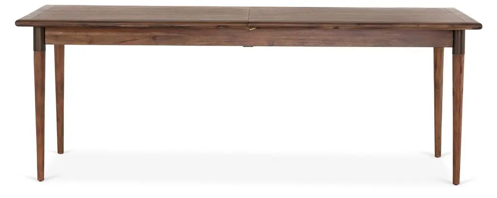 Framed in acacia veneers in a toasted walnut finish with rounded, tapered legs and iron detailing, this dining table includes an extension leaf that allows it to extend to accommodate up to ten guests.