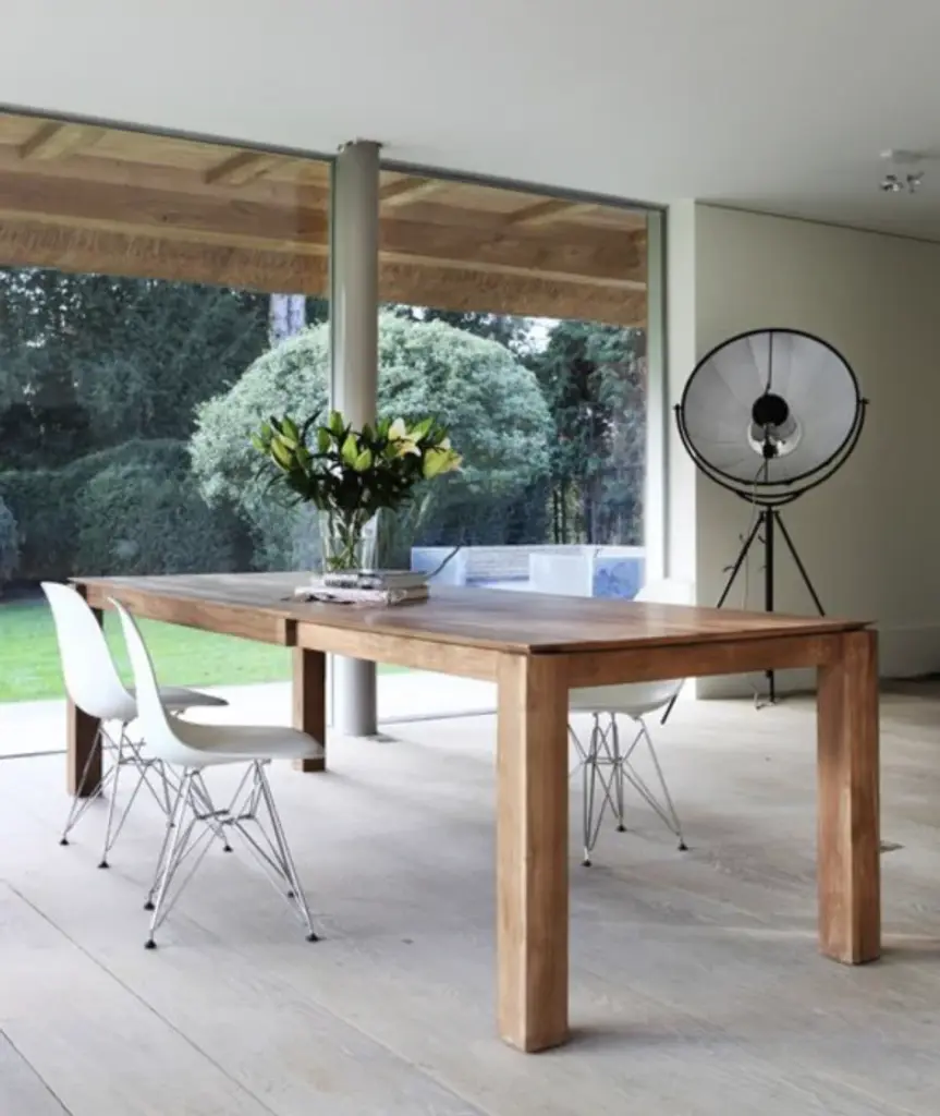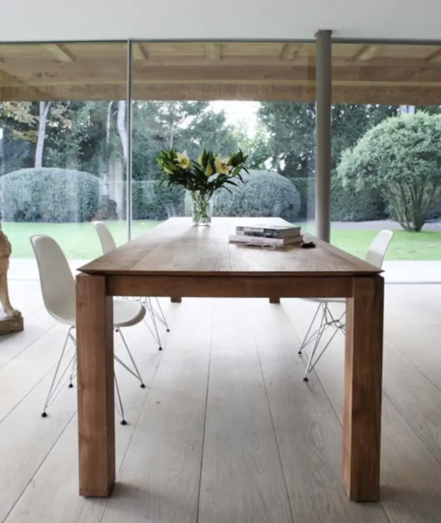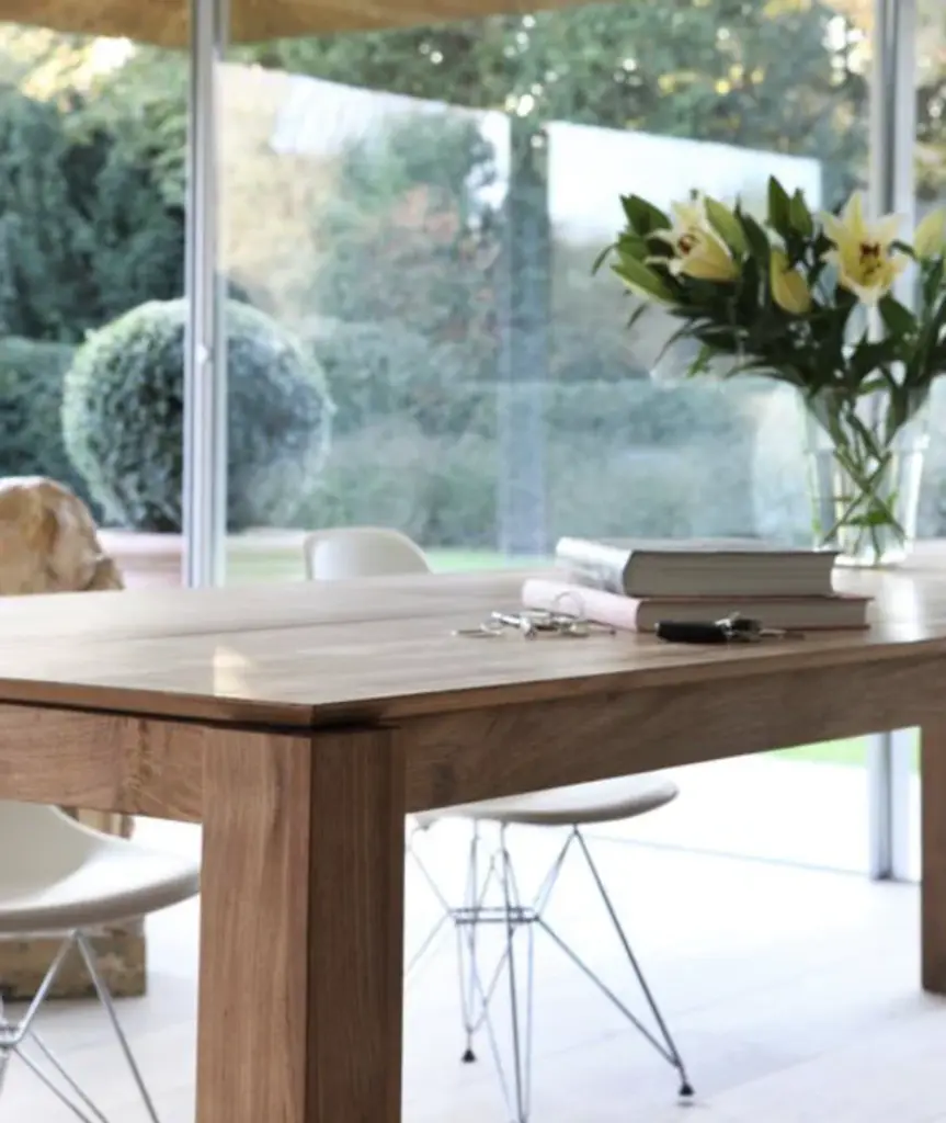Slice is a dining table with a unique character, with a little extra. This table can easily be extended without interruption of the wood grain pattern. Robust legs of the Slice extendable table move with the extension, allowing you to keep seating space at a maximum.