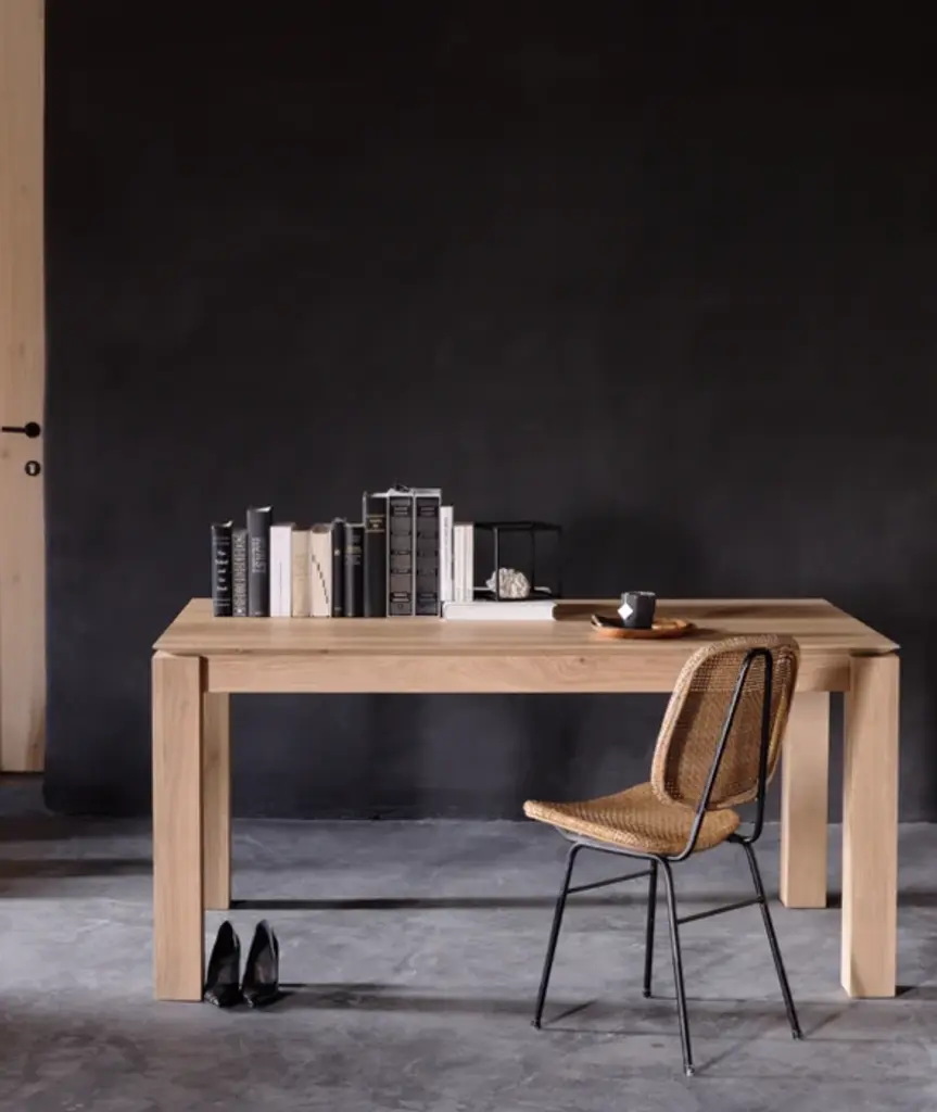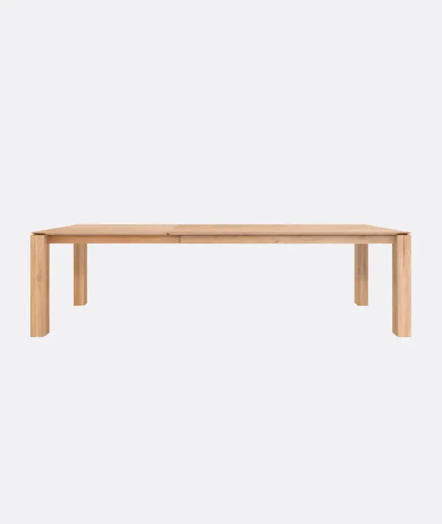 Slice is a dining table with a unique character, with a little extra. This table can easily be extended without interruption of the wood grain pattern. Robust legs of the Slice extendable table move with the extension, allowing you to keep seating space at a maximum.