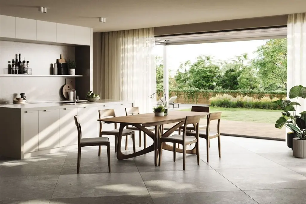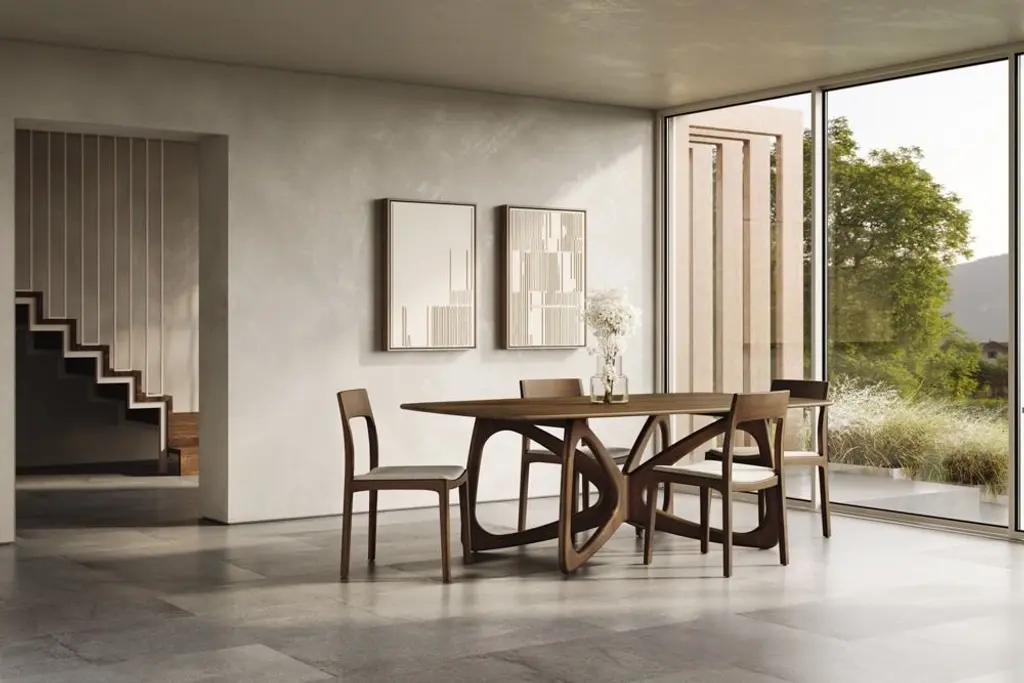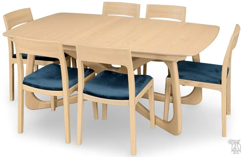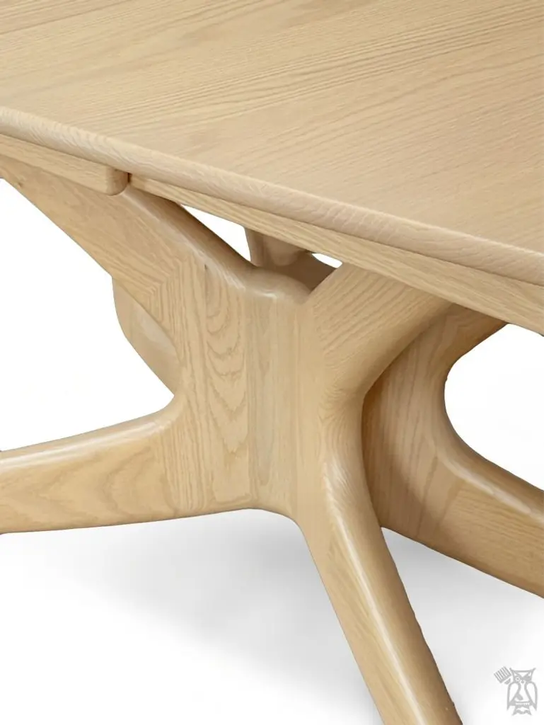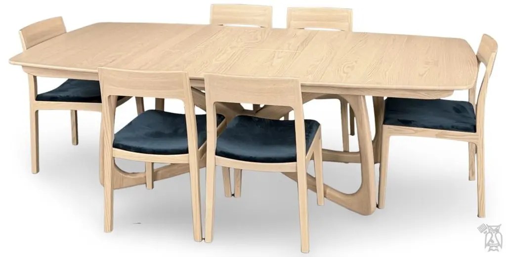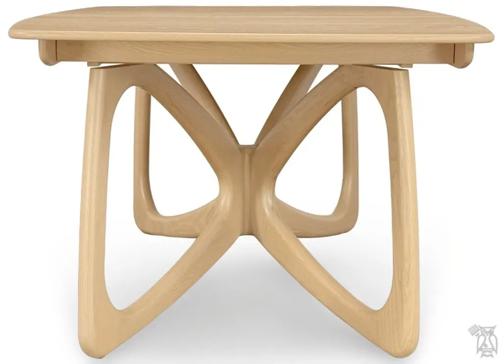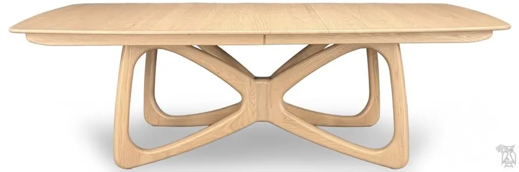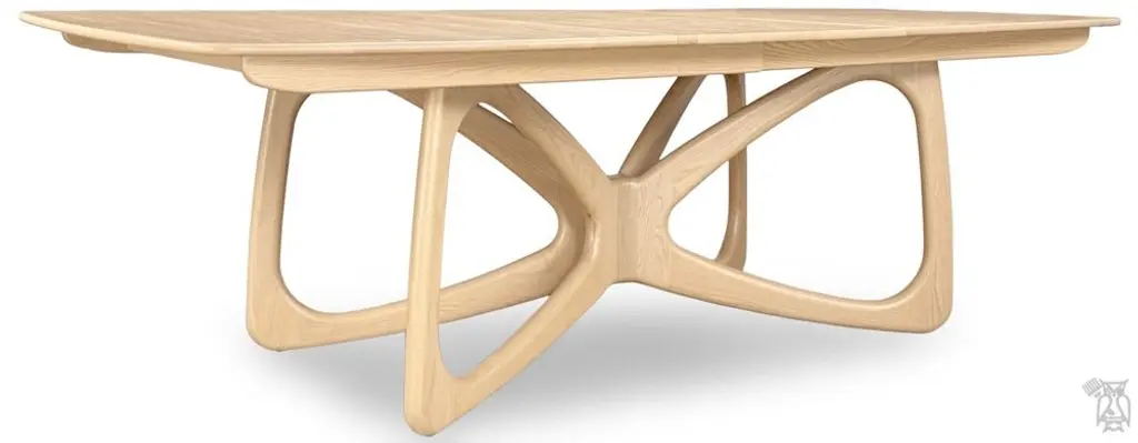 Solid White Oak Wood Butterfly 96" Long Extension Dining Table in Natural Finish. This table is stocked in Natural Oak or order in other sizes, woods and colors. Blending modern aesthetics with natural inspiration, the Butterfly Dining Room is a striking addition to any space. Whether for everyday use or as a conversation piece at lively gatherings, Butterfly will elevate your living environment. The Butterfly Dining Room is crafted in solid American black walnut hardwood with natural finish and solid Oak in a range of finishes. Dining items in walnut are finished with a low sheen (10 sheen) topcoat. The finish is GREENGUARD Certified for low chemical emissions. The table is available as a solid top or with a single self-storing leaf with single-handed operation. This table features easystow extension and leaf storage. Contact store for more information on wood and color options. Butterfly Table Options: 46"w x 72" with 24" self-store leaf = 96" long 50"w x 84" with 24" self-store leaf = 108" long 48"w x 84" long fixed top table 42"w x 72" long fixed top table 60" Round fixed top table 54" Round fixed top table 48" Round fixed top table 48"w x 84" long glass top table 42"w x 72" long glass top table 60" Round glass top table 54" Round glass top table 48" Round glass top table 48"w x 84" long Sintered Stone top table (4 colors) 42"w x 72" long Sintered Stone top table (4 colors) 60" Round glass Sintered Stone top table (2 colors) 54" Round glass Sintered Stone top table (2 colors) 48" Round glass Sintered Stone top table (2 colors) Available in 5 finishes on solid Oak wood Available in Natural finish on walnut wood Matching benches, chairs and servers available Contact showroom for alternative pricing Copeland features the highest level of construction in the industry. Asymmetrical English dovetails - the traditional gold standard in joinery - are used in drawer construction. Drawers are made completely of solid hardwood; fronts are 3/4" thick, sides and backs are 5/8". Drawer bottoms are "jet welded" firmly in place adding to overall rigidity while minimizing vibration and rattling. Drawer box interiors are sanded smooth and fully finished. Glides are adjustable to keep proper alignment and guarantee proper function in any climate. Pivot stops prevent drawers from being pulled out of the case. Self-locking dovetail joints are used for cross rails, keeping them from separating from side panels and adding strength. Solid hardwood interior corner blocks stabilize bed, case, table, and chair legs. Bed side rails are joined to the headboard and footboard with a rigid inserted bolt. Case backs are made of selected veneer panels and are sanded and finished to match the entire piece. All pieces are finished with pre-catalyzed lacquer or water borne finish that resists stains, moisture rings and spots, heat damage (from hot beverages, etc.), and abrasions. Finishes are formulated to meet Kitchen Cabinet Manufacturers Association (KCMA) standards and provides lasting protection. Tables require assembly in room. Matching pieces sold separately. No particle board. Made in Vermont. Northern California delivery extra. Manufacturer: Copeland Furniture.