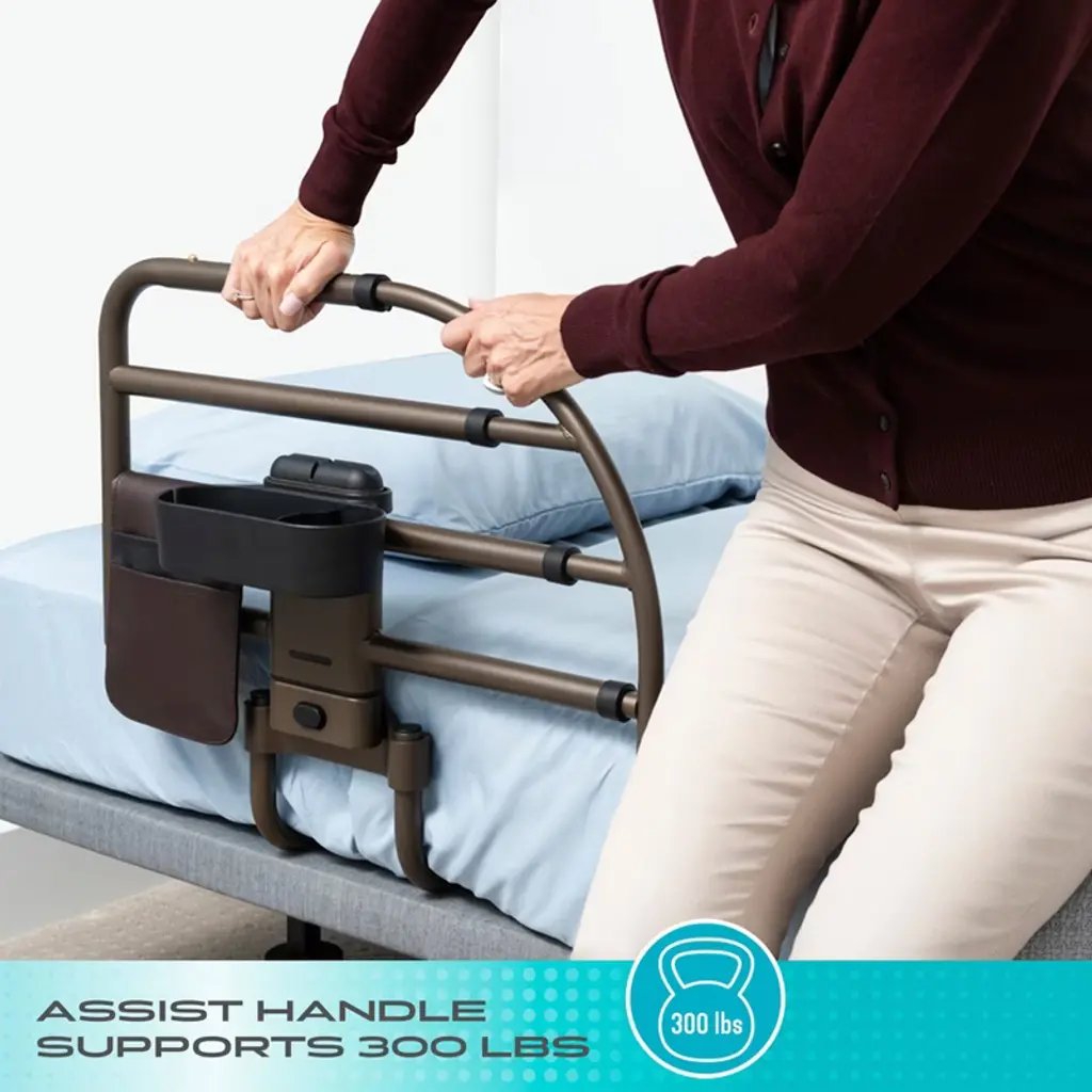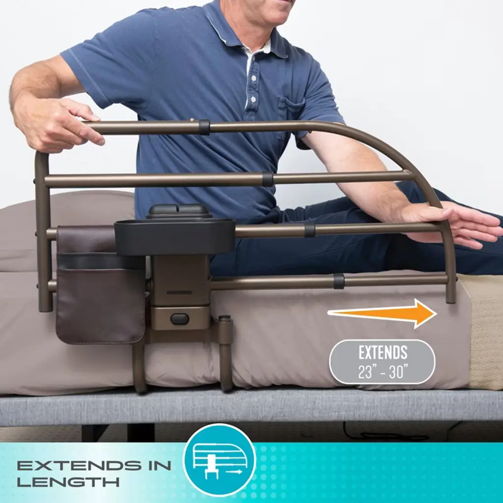 With an innovative design geared toward preventing entrapment, the Wonder Click Extendable Bed Rail from Stander is one of the only bed rails approved for use on both regular and adjustable platform beds. Supporting weights up to 300 pounds, the bed rail for seniors extends in length from 23 to 30 inches to prevent nighttime falls out of bed and and can also be used as a stand assist to protect against falls while transferring to and from a walker, wheelchair, or bedside commode. Caregivers will love the easy-to-remove safety handle when needing to change the linens, make the bed, or transfer a loved one from bed. To install the bed assist bar, slide the base underneath the mattress. For regular beds, attach the bed railing with the included safety strap. For installation on adjustable base beds, use the provided hardware to attach the bed rail to the base of the bed. The Wonder Click Bed Rail is perfect for elderly seniors who are experiencing a lack of mobility, a fear of falling, or who need assistance while recovering from injury or surgery.
