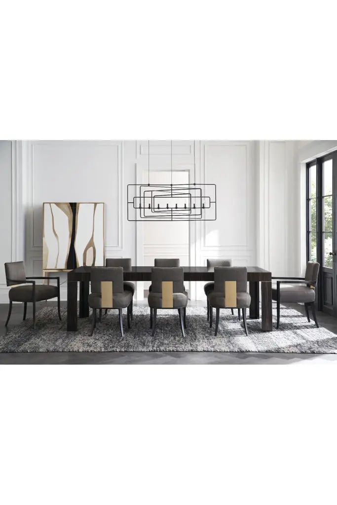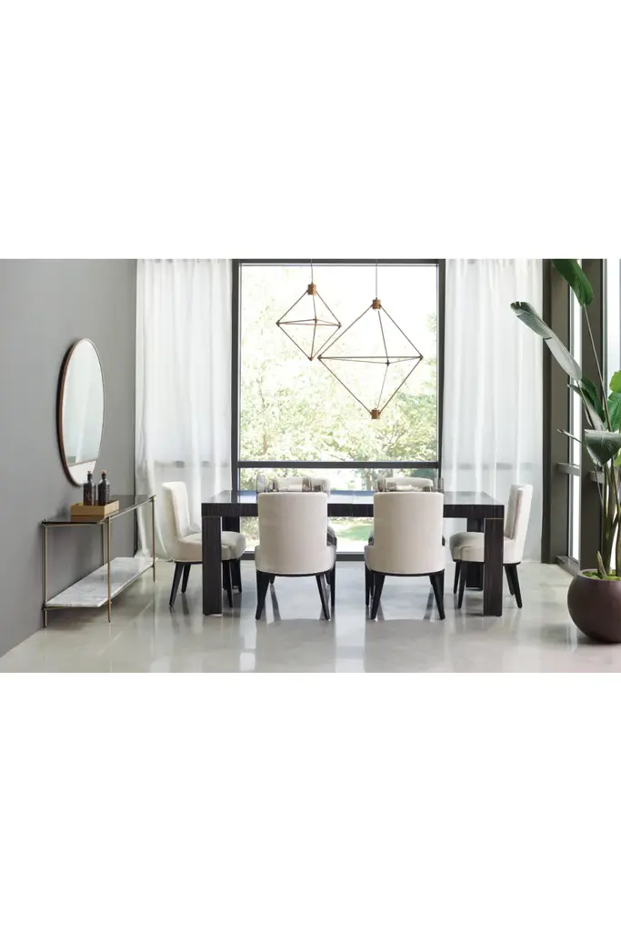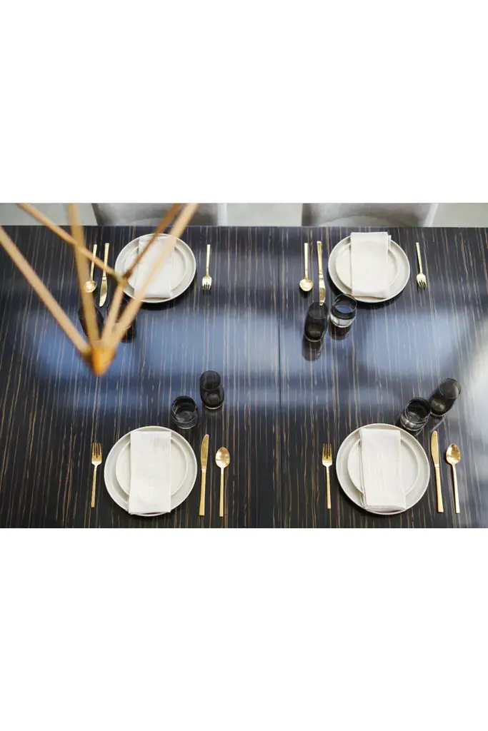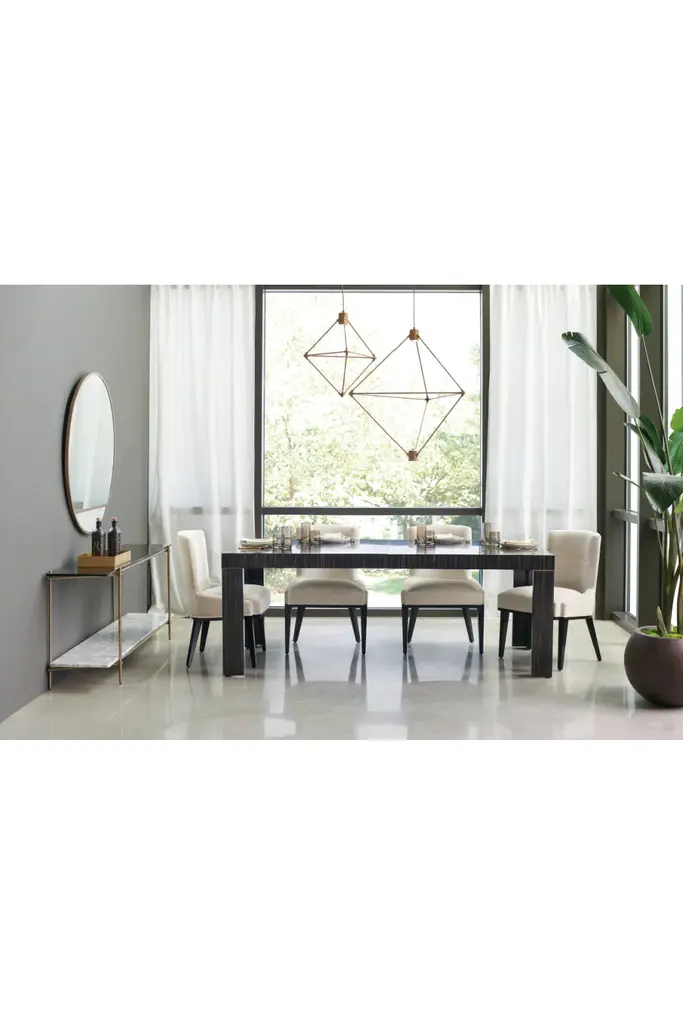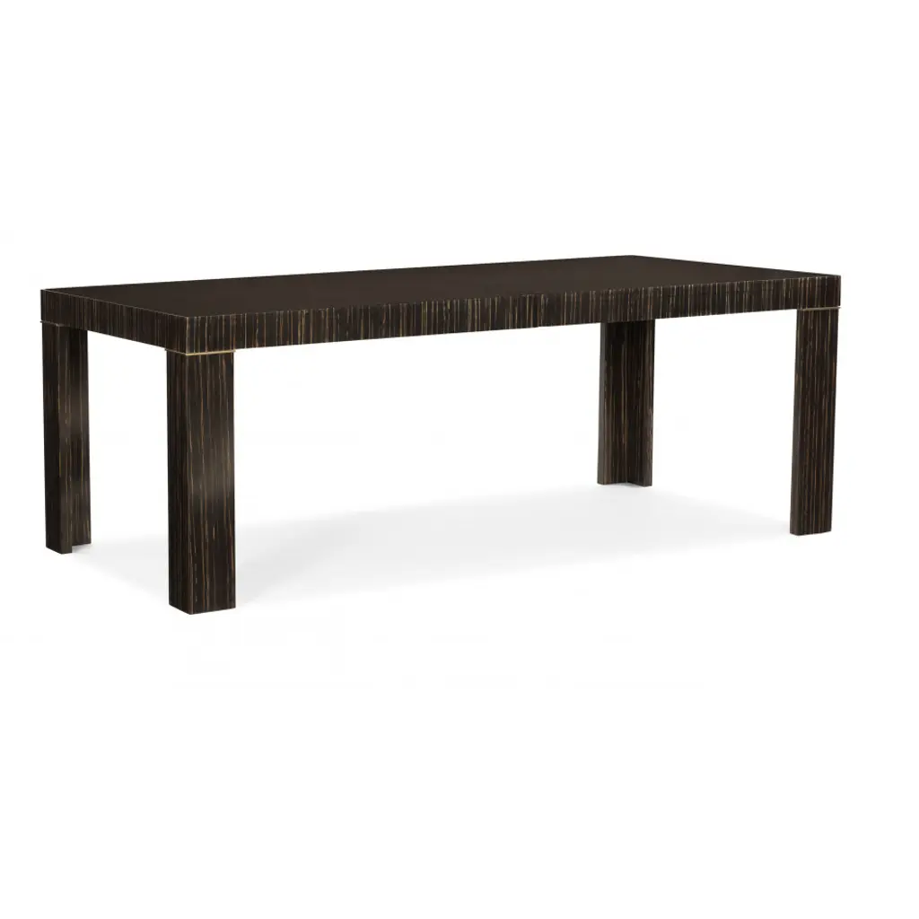 Treat yourself to an exceptional dining experience at every meal by incorporating this stunning dining table into your design plan. Its clean, simple lines reflect the timeless form of a parson table reinterpreted with a fresh mix of materials. Engineered ebony finished in Striated Ebony with Lucent Bronze Metallic paint trim adds bold character to the table top and legs without taking away from its streamlined form. The epitome of everyday elegance, this dining table’s generous 80-inch width is designed for entertaining and can be extended to 102 inches with the addition of its 22-inch leaf—making holidays more fun and ensuring everyone always has a place at the table.