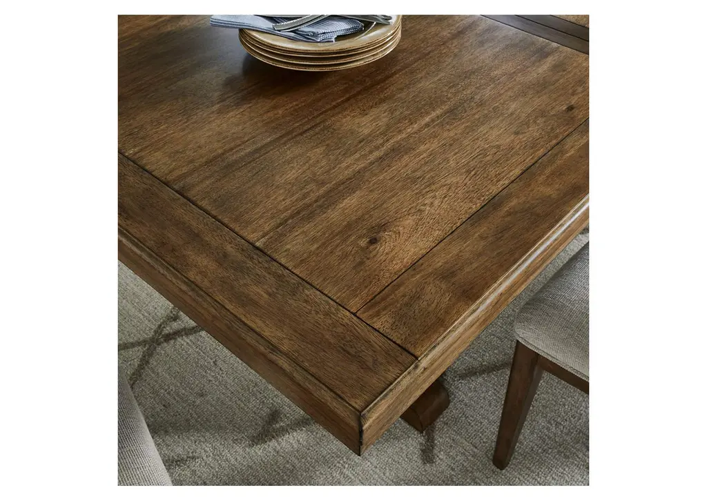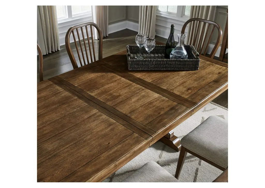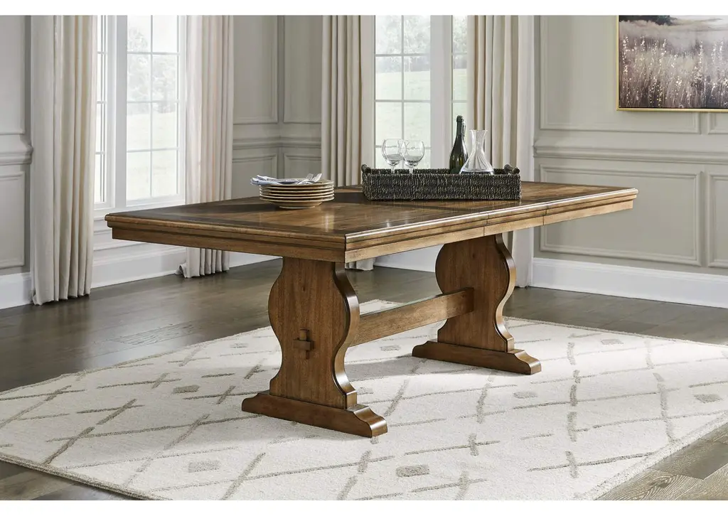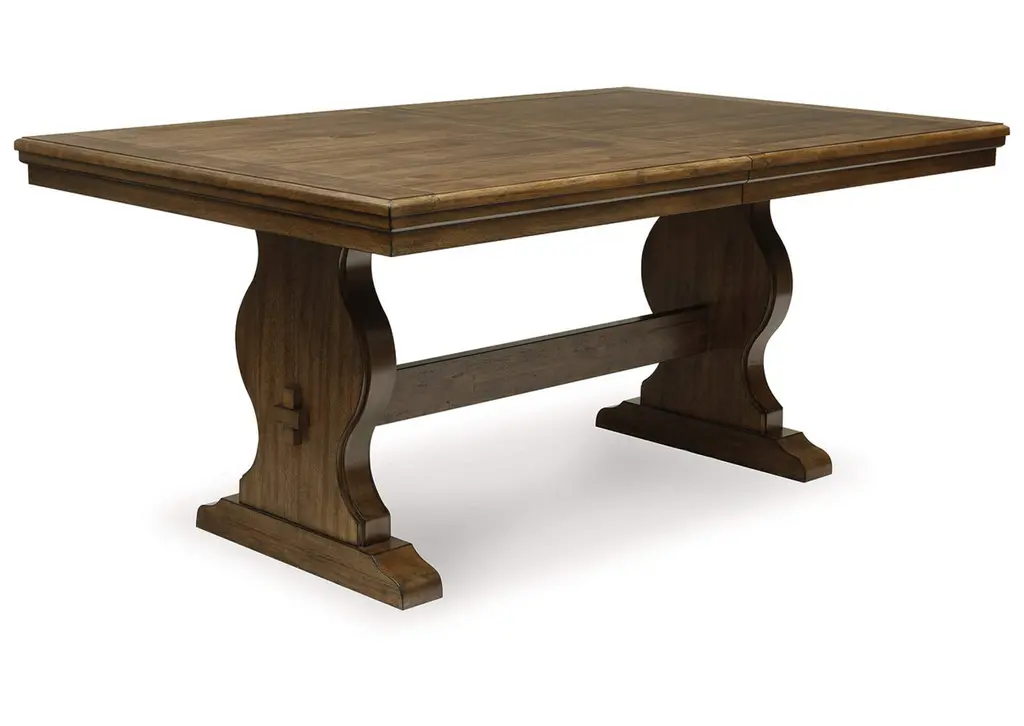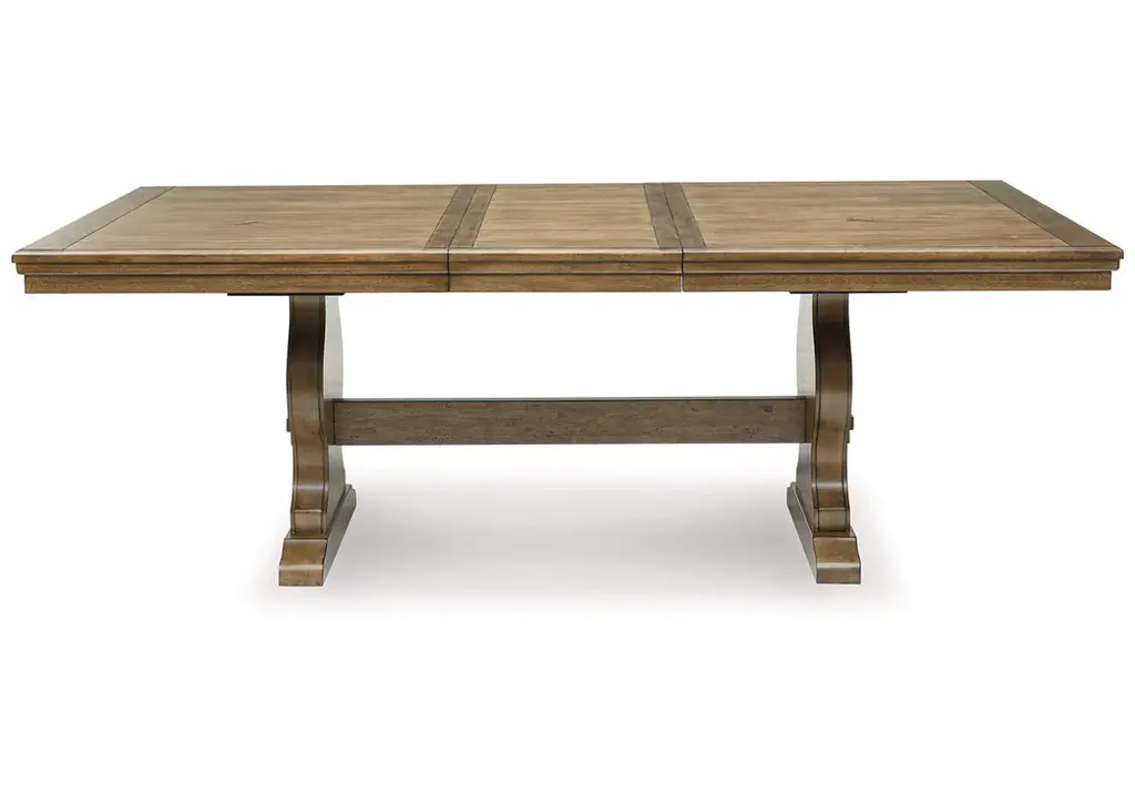 Traditional style doesn’t have to be stuffy. It can feel warm, inviting and beautifully in the moment. Case in point: the Sturlayne extension dining table. Showcasing a double-pedestal trestle base and a removable leaf, it has an allure all its own. Equally special is the rich brown finish, which exudes a mood of timeless charm. How's that for relaxed refinement? Weight 221.000 lbs. (99.45kgs.)