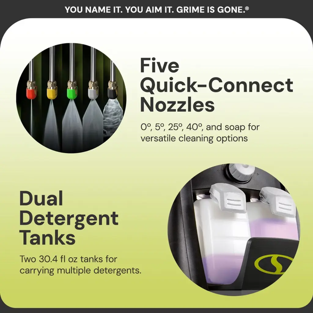 The Sun Joe SPX3000 pressure washer delivers it all to tackle a variety of cleaning tasks for homes, buildings, RVs, cars, trucks, boats, decks, driveways, patios, lawn equipment, and more. This power washer packs a powerful punch with its 1800-Watt and 14.5-amp motor with the ability to remove tar and grease from concrete, heavy mildew stains, oil stains, rust from steel, caked mud on equipment, and other stubborn gunk and grime Equipped with a dual detergent tank system, this corded pressure washer carries and stores 2 different types of detergent simultaneously in its (2) 0.9 L onboard, removable detergent tanks. Conveniently switch between different detergents with its detergent selection dial and blast away all sorts of grime. Featuring a 34-inch extension spray wand to access hard-to-reach areas, you can wash high and low places, such as 2-story buildings and the undersides of automotive vehicles and lawn equipment. Plus, the powerwasher rear wheels provide easy portability around your yard. Tailor the pressure output of the spray to your cleaning needs with the 5 Quick-Connect spray nozzles. A 20-foot high-pressure hose, 35-foot power cord, garden hose adapter, and a TSS (Total Stop System) trigger are included. Wash away grit and grime with power and precision using the Sun Joe SPX3000 Pressure Washer.