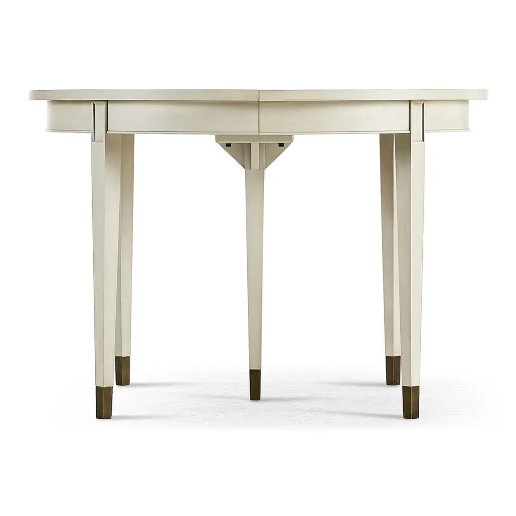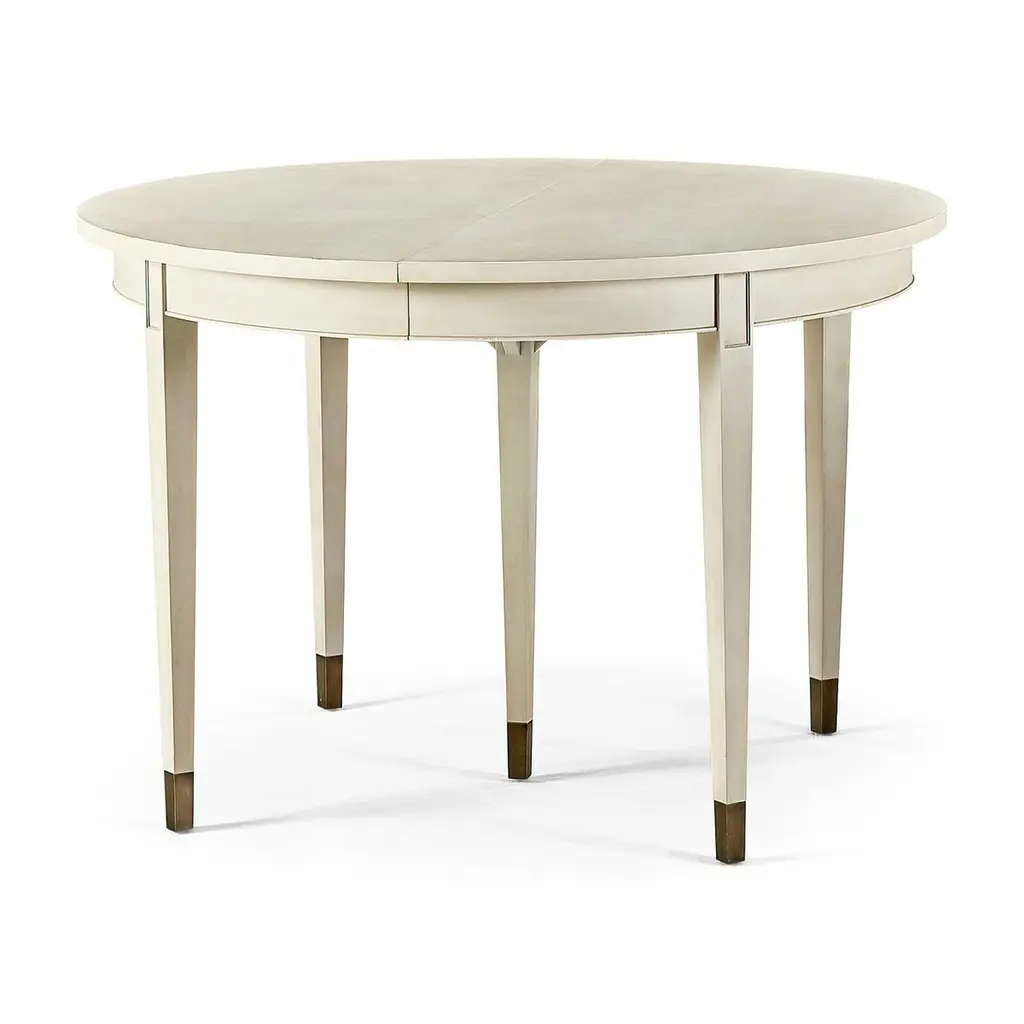 A simple, clean-lined, and elegant Swedish Neo Classic style extension dining table. A modern interpretation of a 19th-century Swedish design, this extension dining table is ideal among traditional or modern decor. The table has intentional antiquing and wear to the painted finish.Fully extending to 140 to accommodate up to 12 people, this versatile table comes with four 24" leaves and has a clearance of 26".Dimensions: 140 1/8" W x 44" D x 30" HClosed: 44" W