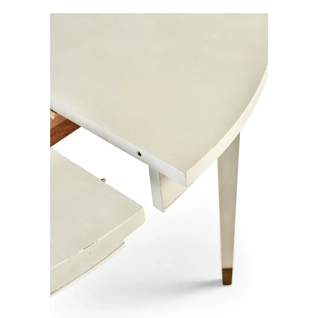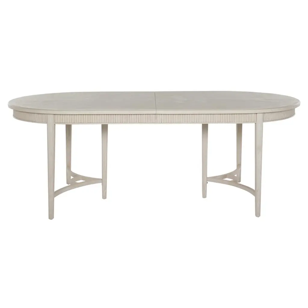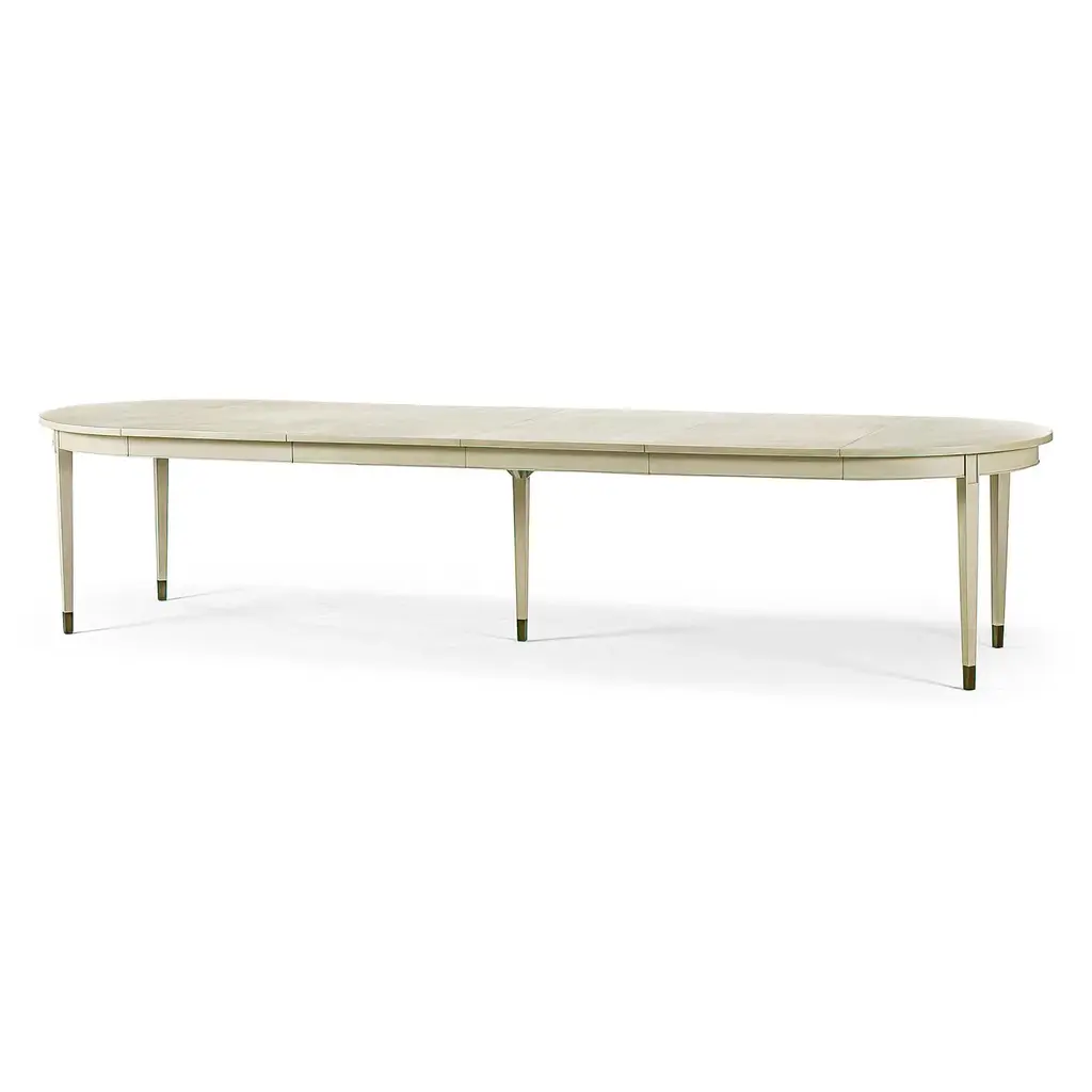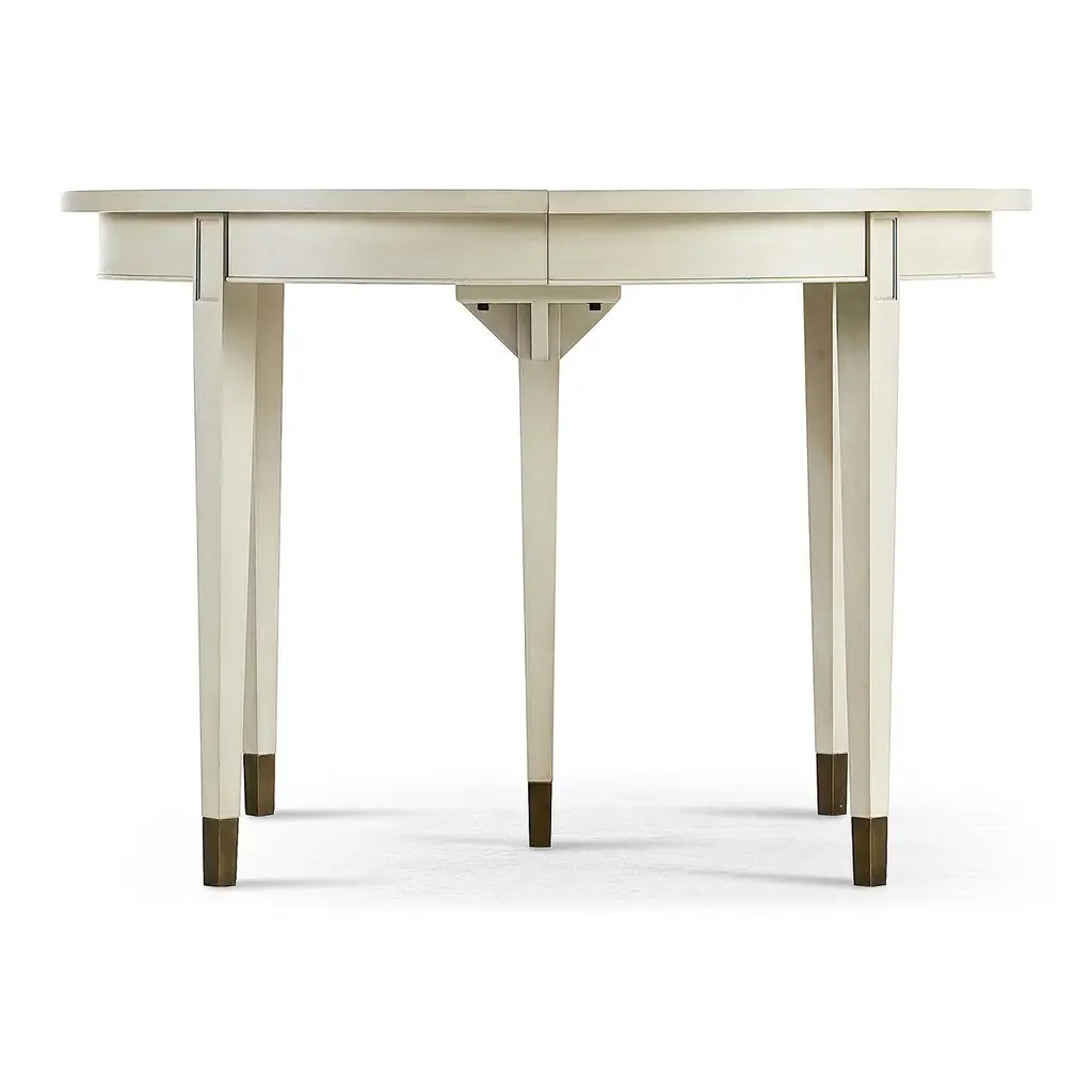 A simple, clean-lined, and elegant Swedish Neo Classic style extension dining table. A modern interpretation of a 19th-century Swedish design, this extension dining table is ideal among traditional or modern decor. The table has intentional antiquing and wear to the painted finish. Fully extending to 140 to accommodate up to 12 people, this versatile table comes with 4 and has a clearance of 26". Dimensions: 140 1/8" W x 44" D x 30" H