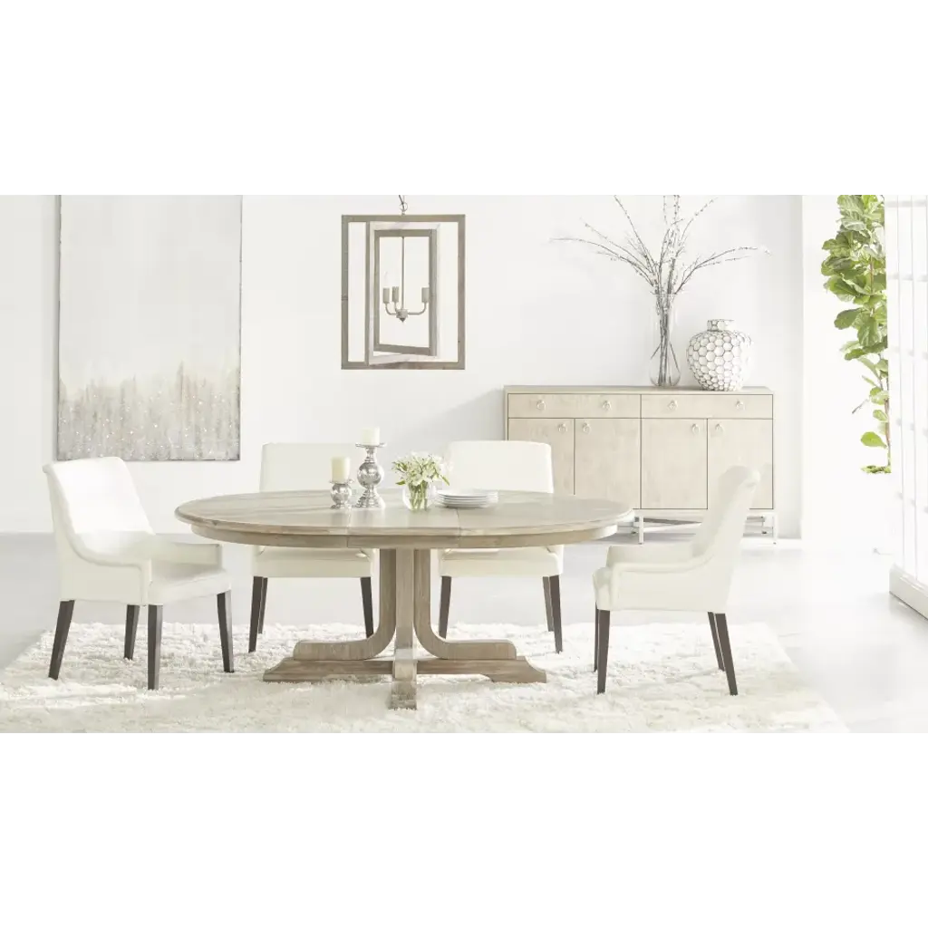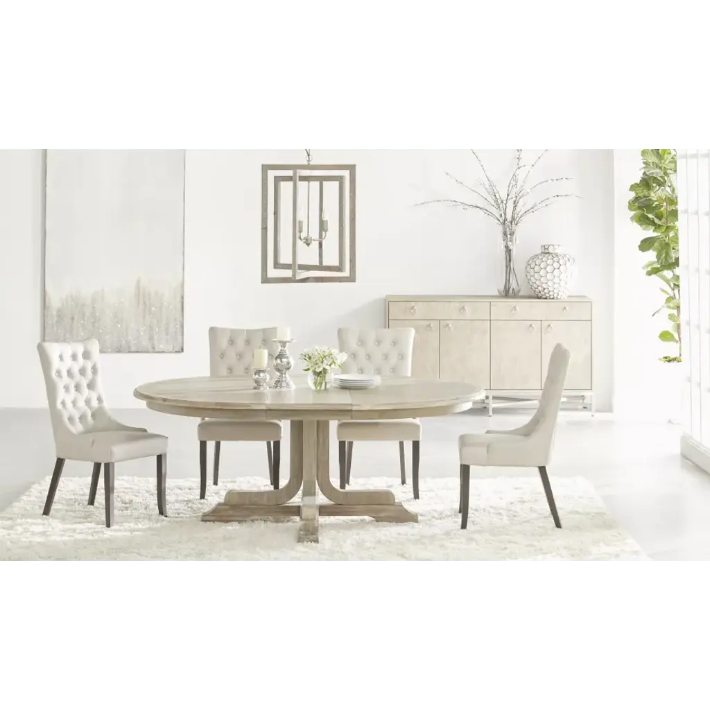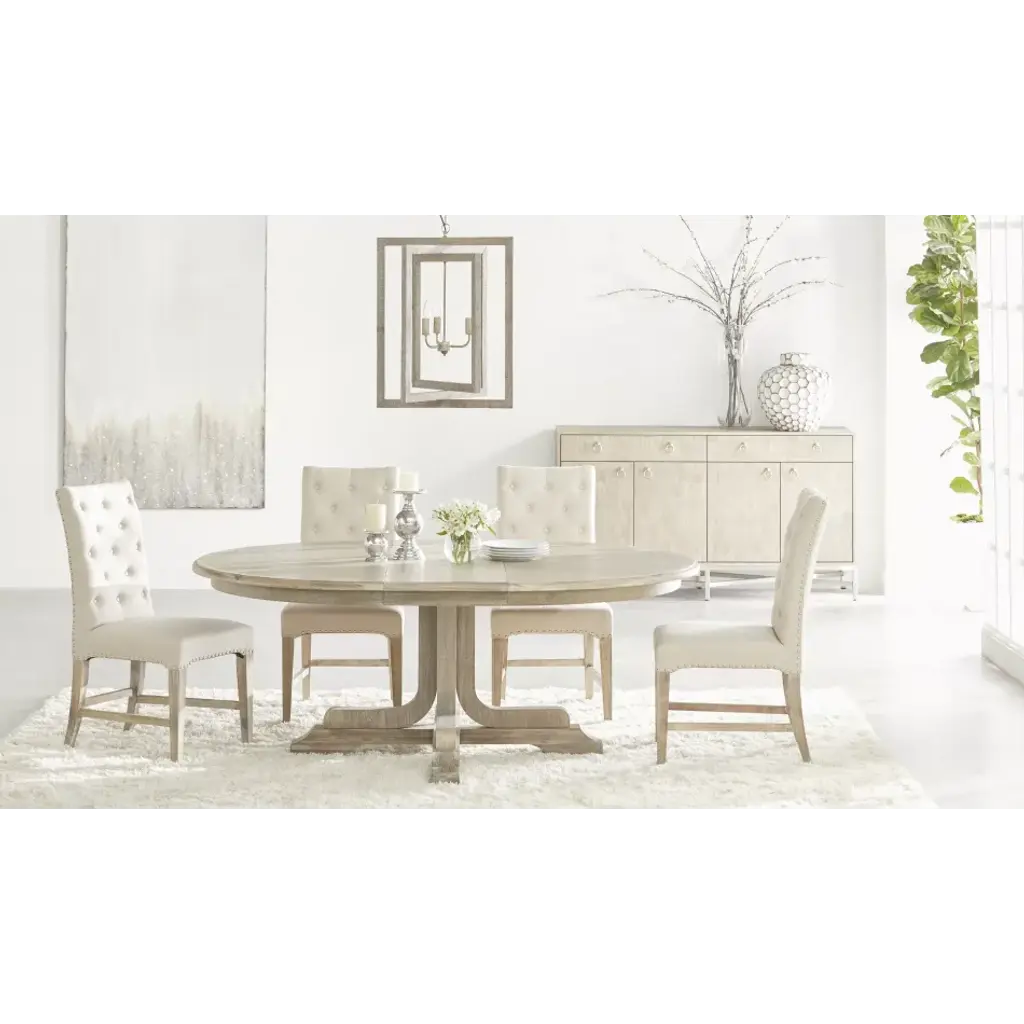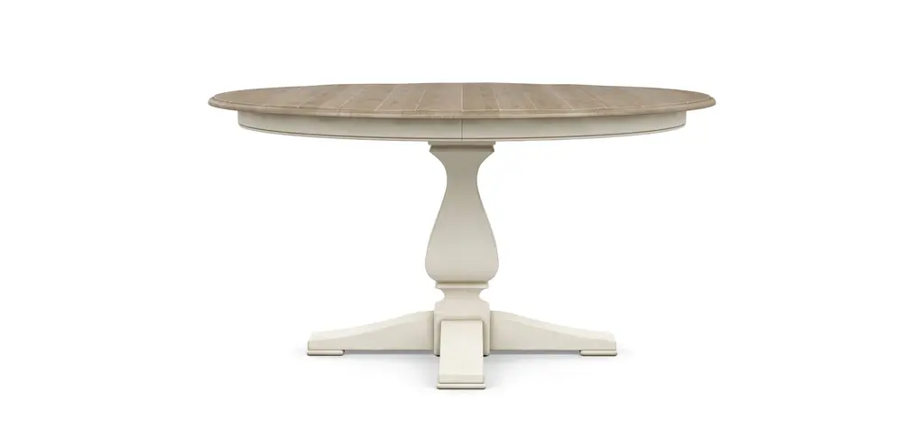 Transitional style dining table featuring 17.5" extension leaf and single pedestal base.