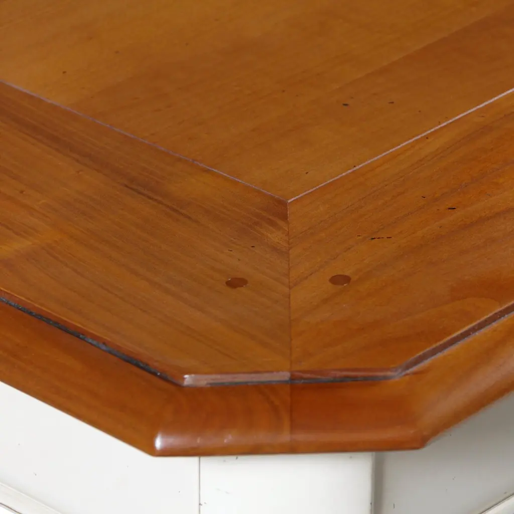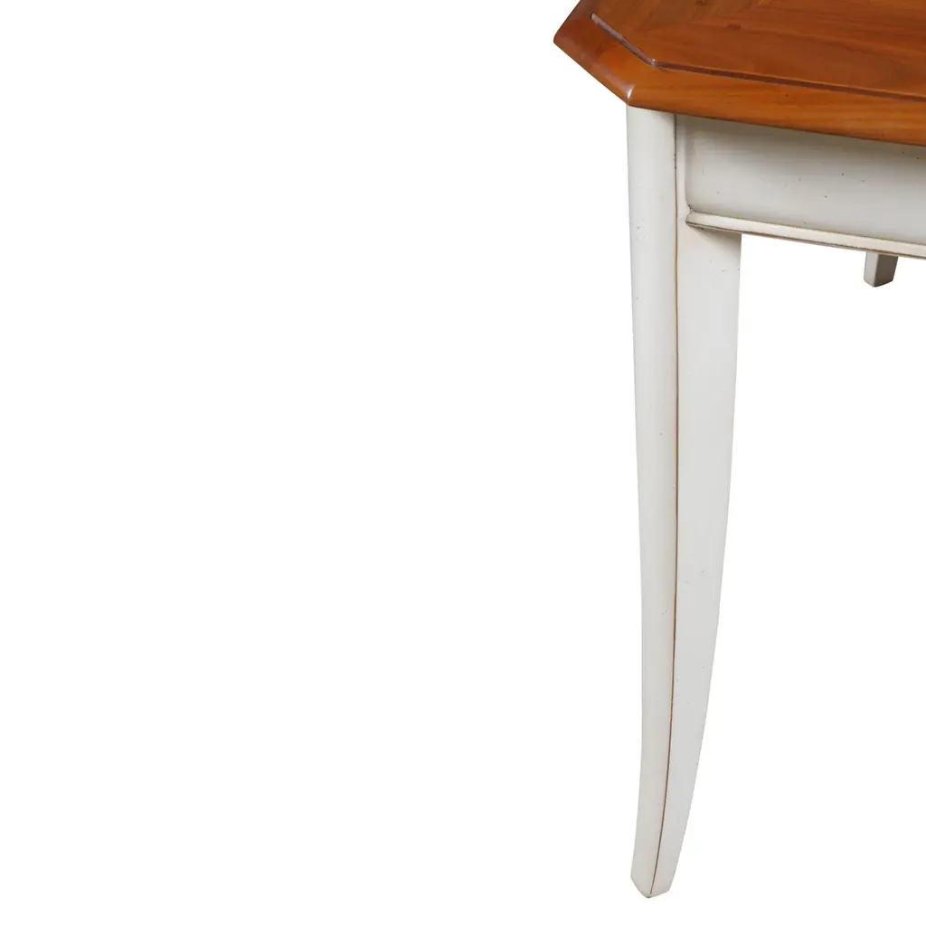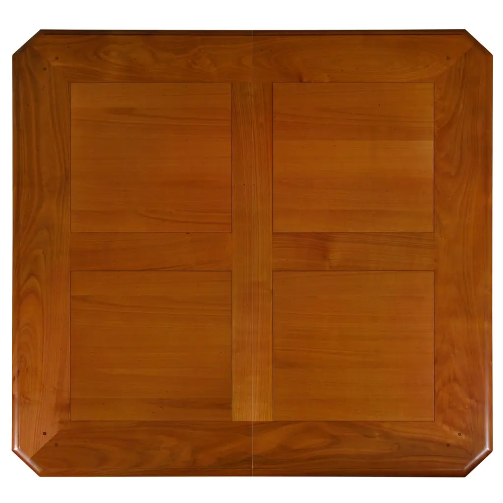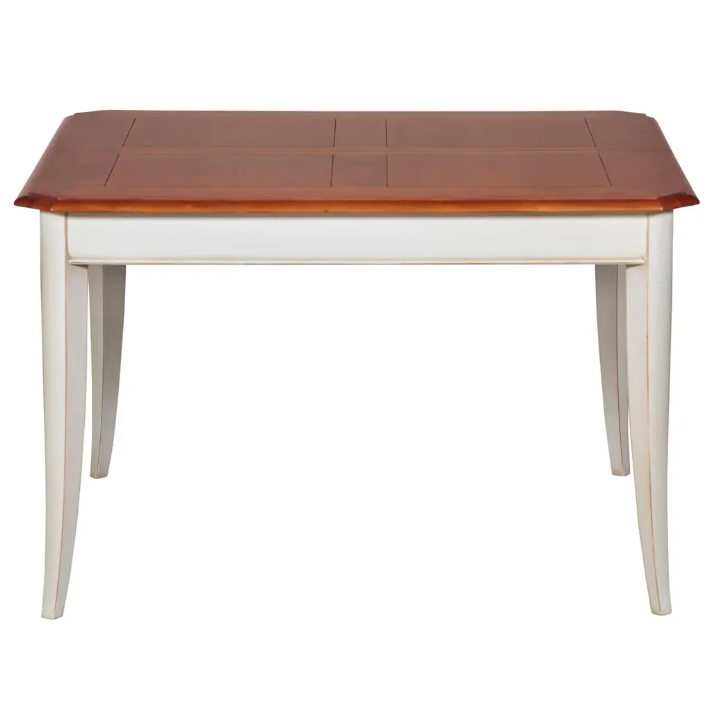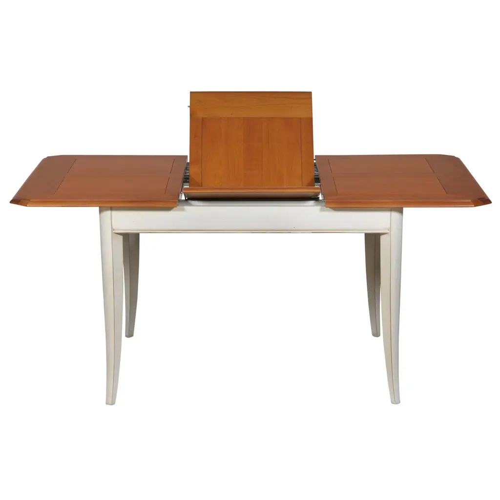 This square dining table is typical of French classical furniture pieces and belongs to our TRADITION collection which takes up the timeless classics of the charm of the French countryside. The saber legs, the pilasters and the grooves are characteristic of this collection. The woodwork remains traditional with tenons and mortises and a dovetail assembly for the drawers fronts for the cabinets.This table is fully assembled in our workshop.The height under the skirt is 25.2'' and the length between the legs is 37''.One extention of 50 cm / 19.7'' is folded under the top.To access the extension, release first the brake under the top and pull it outwards for a synchronized opening of the 2 top parts.This table accomodates 4 guests and 6 with the unfolded extension. The finish you see on the pictures is a blond cherry stain for the top and the extension combined with a white-cream lacquer for the feet and the skirt.You can choose an other finish.GONTIERis a cabinetmaker's furniture brand established since 1920 in Mayenne, France.It now belongs to the company MON PETIT MEUBLE FRANÇAIS.The manufacture of each piece of furniture remains artisanal, 100% French and of very high quality.The solid wood comes from sustainably managed French forests.We offer a 5 year warranty on every piece of furniture.As proof of their authenticity and uniqueness, our furniture is burnt with a "G" hallmark.