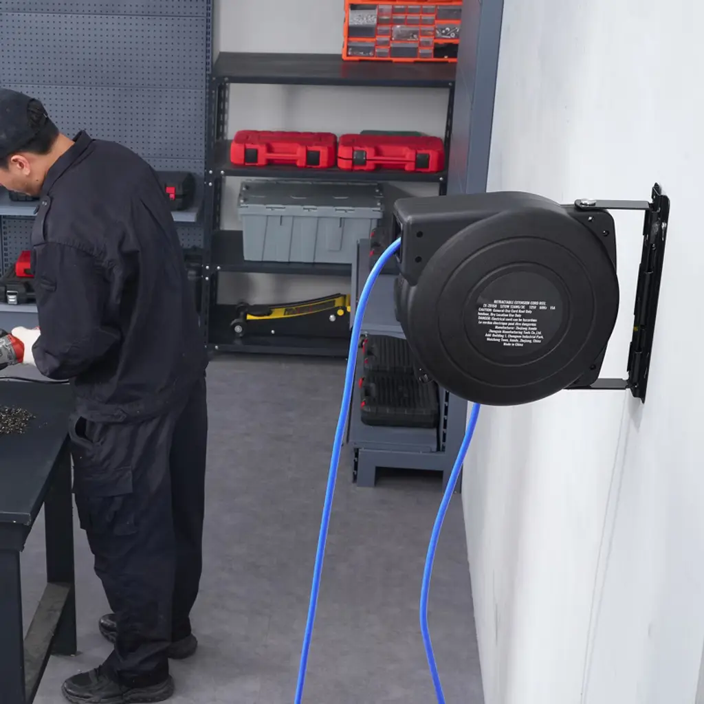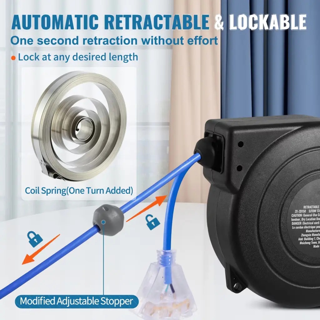 Feature: Heavy Duty 45FT Cord Reel: Ready for any challenge, our 12AWG/3C SJTOW cables are built to resist water, oil, acid, alkali, and ozone. Our retractable extension cord reel features a high-quality PP case, 45 ft extension cord, and 4.5 ft lead-in cord, rated for 15A / 125V / 1875W. Power up and reach further than ever! Choose from 4 vibrant colors to match your style! Lighted 3-Outlet Transparent Socket: Upgrade your power setup with this grounded 3-outlet socket, designed to power multiple devices at once. The built-in indicator light glows when the socket is powered on, ensuring you're always ready to go. It efficiently maximizes both power strips and wall outlets for added convenience. Overload Protection for Peace of Mind: Rigorously tested for electrical security, breaker lifespan, and on/off functionality, our retractable extension cord reel shields your devices from short circuits and overloads. Automatically cuts power if usage exceeds 15A, ensuring secure operation of your power tools. Simply press the reset button to restore power and keep working! Automatic Retractable System: Enjoy hassle-free cable control with our advanced auto-retract system. Featuring an advanced cord stopper, you can easily adjust the cable length and avoid annoying tangles. The inner coil spring is increased by 1 turn, improving the elasticity. Enjoy smooth retraction every time! Versatile and User-Friendly: This retractable cord reel is designed for easy installation on walls or ceilings, featuring a 180° swivel bracket for effortless access from any direction. Enjoy the convenience of smooth cable extension and retraction, while keeping your workspace organized and free from tangled cords and trip hazards. Package Content 1 x Retractable Extension Cord Reel 1 x Set of Screws 1 x User Manual