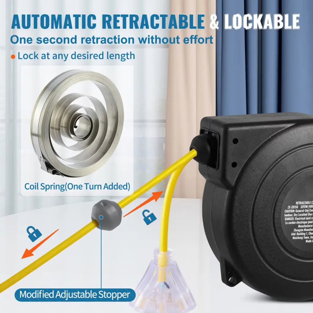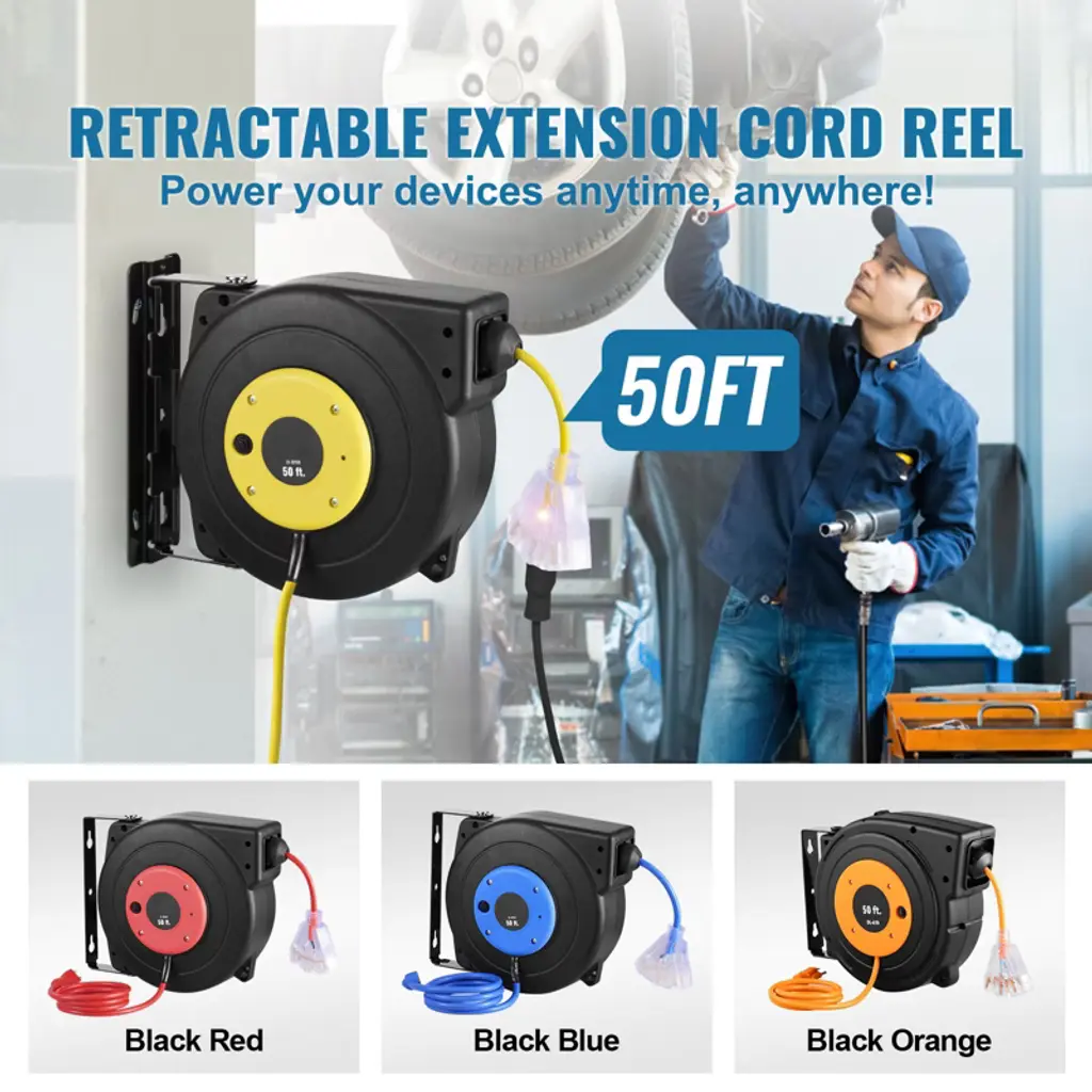 Feature: Heavy Duty 50FT Cord Reel: Ready for any challenge, our 14AWG/3C SJTOW cables are built to resist water, oil, acid, alkali, and ozone. Our retractable extension cord reel features a high-quality PP case, 50 ft extension cord, and 4.5 ft lead-in cord, rated for 13A / 125V / 1625W. Power up and reach further than ever! Choose from 4 vibrant colors to match your style! Lighted 3-Outlet Transparent Socket: Upgrade your power setup with this grounded 3-outlet socket, designed to power multiple devices at once. The built-in indicator light glows when the socket is powered on, ensuring you're always ready to go. It efficiently maximizes both power strips and wall outlets for added convenience. Overload Protection for Peace of Mind: Rigorously tested for electrical security, breaker lifespan, and on/off functionality, our retractable extension cord reel shields your devices from short circuits and overloads. Automatically cuts power if usage exceeds 13A, ensuring secure operation of your power tools. Simply press the reset button to restore power and keep working! Automatic Retractable System: Enjoy hassle-free cable control with our advanced auto-retract system. Featuring an advanced cord stopper, you can easily adjust the cable length and avoid annoying tangles. The inner coil spring is increased by 1 turn, improving the elasticity. Enjoy smooth retraction every time! Versatile and User-Friendly: This retractable cord reel is designed for easy installation on walls or ceilings, featuring a 180° swivel bracket for effortless access from any direction. Enjoy the convenience of smooth cable extension and retraction, while keeping your workspace organized and free from tangled cords and trip hazards. Package Content 1 x Retractable Extension Cord Reel 1 x Set of Screws 1 x User Manual