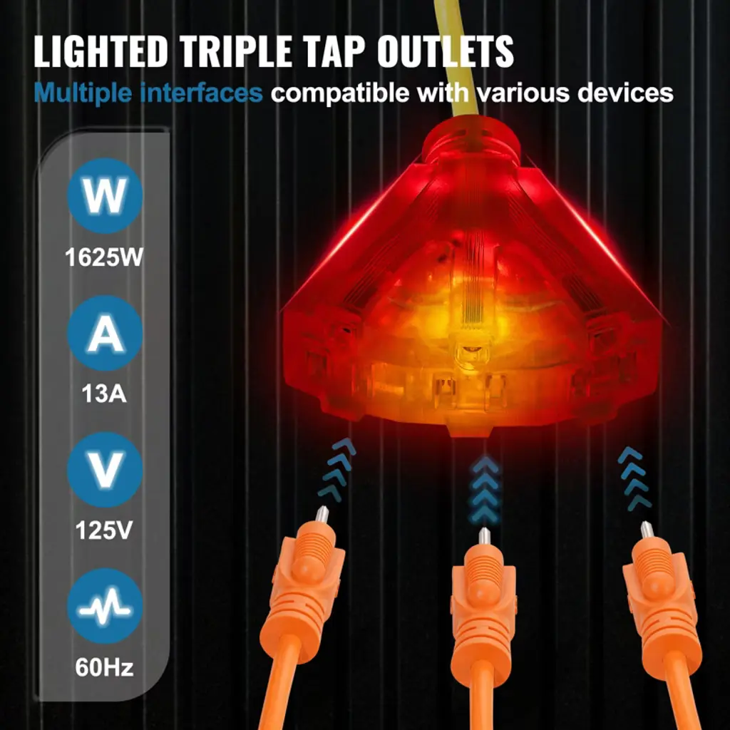 Vevor Retractable Extension Cord Reel, 50 Ft, Heavy Duty 14awg/3c Sjtow Retractable Power Cord With Lighted Triple Tap Outlet, Black