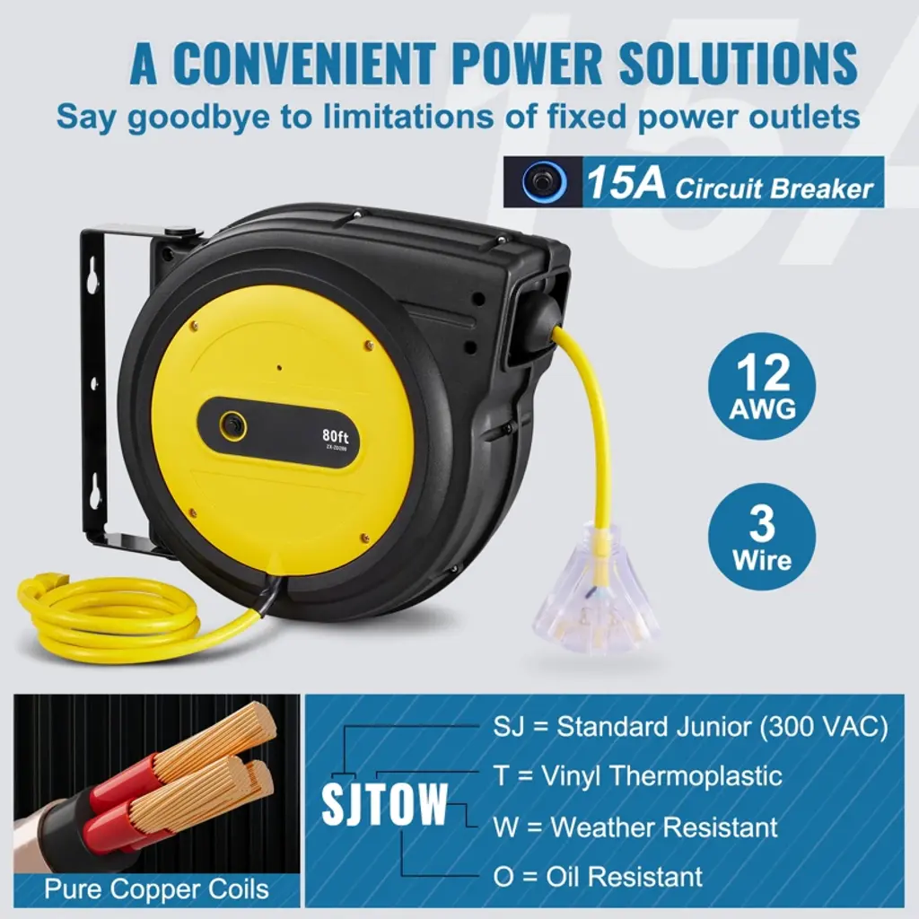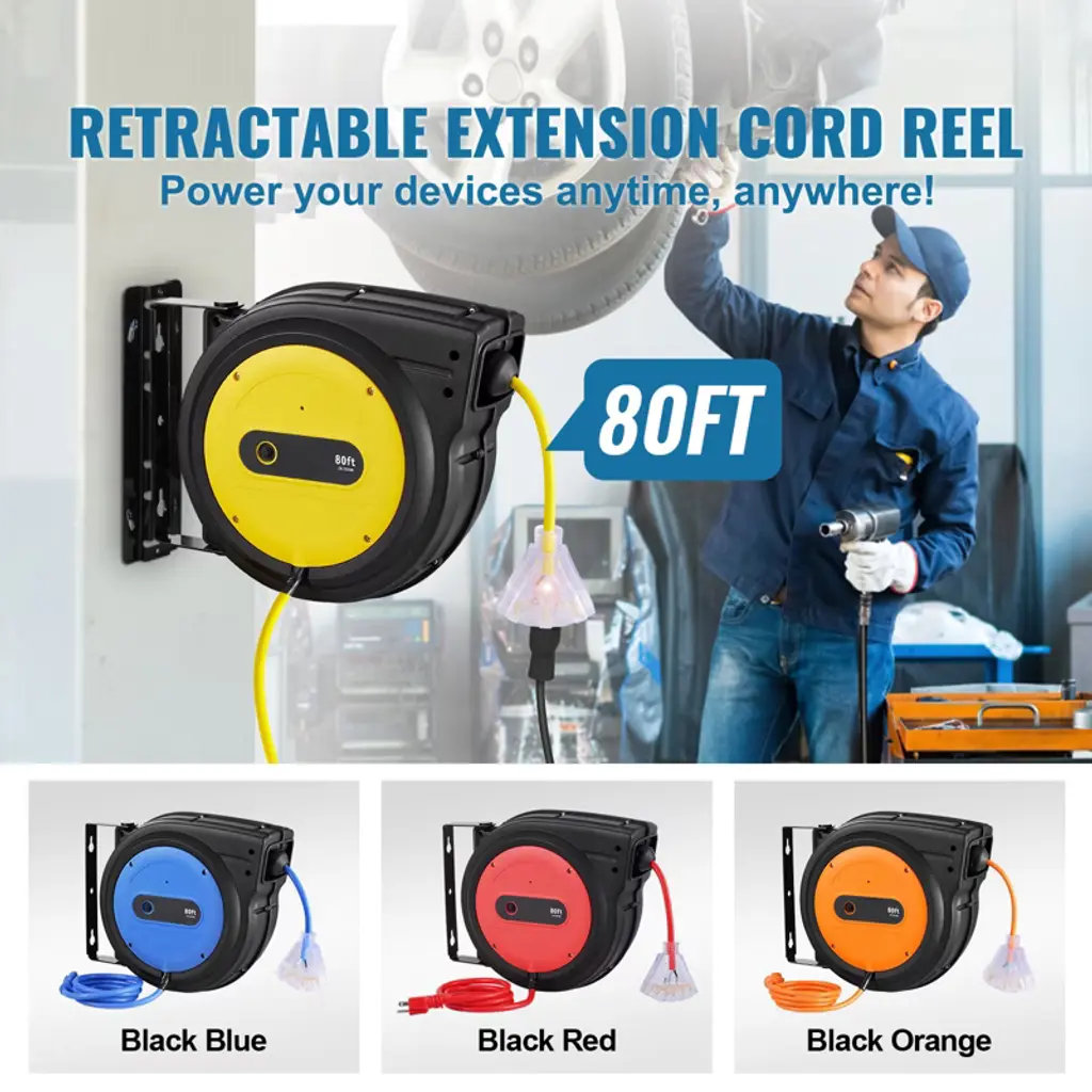 Feature: Heavy Duty 80FT Cord Reel: Ready for any challenge, our 12AWG/3C SJTOW cables are built to resist water, oil, acid, alkali, and ozone. Our retractable extension cord reel features a high-quality PP case, 80 ft extension cord, and 4.5 ft lead-in cord, rated for 15A / 125V / 1875W. Power up and reach further than ever! Choose from 4 vibrant colors to match your style! Lighted 3-Outlet Transparent Socket: Upgrade your power setup with this grounded 3-outlet socket, designed to power multiple devices at once. The built-in indicator light glows when the socket is powered on, ensuring you're always ready to go. It efficiently maximizes both power strips and wall outlets for added convenience. Overload Protection for Peace of Mind: Rigorously tested for electrical security, breaker lifespan, and on/off functionality, our retractable extension cord reel shields your devices from short circuits and overloads. Automatically cuts power if usage exceeds 15A, ensuring secure operation of your power tools. Simply press the reset button to restore power and keep working! Automatic Retractable System: Enjoy hassle-free cable control with our advanced auto-retract system. Featuring an advanced cord stopper, you can easily adjust the cable length and avoid annoying tangles. The inner coil spring is increased by 1 turn, improving the elasticity. Enjoy smooth retraction every time! Versatile and User-Friendly: This retractable cord reel is designed for easy installation on walls or ceilings, featuring a 180° swivel bracket for effortless access from any direction. Enjoy the convenience of smooth cable extension and retraction, while keeping your workspace organized and free from tangled cords and trip hazards. Package Content 1 x Retractable Extension Cord Reel 1 x Set of Screws 1 x User Manual