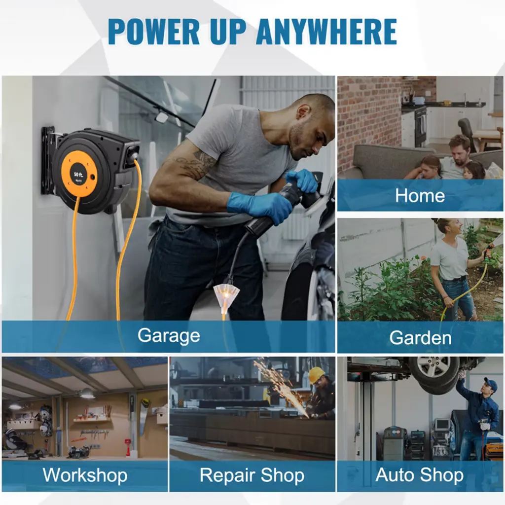 Retractable Extension Reel, 50 FT Heavy Duty 14AWG/3C SJTOW Power Cord with Lighted Triple Tap Outlet, 13 Amp Circuit Breaker, 180° Swivel Bracket for Ceiling or Wall Mount, Black Description: Heavy Duty 50FT Cord Reel: The 14AWG/3C SJTOW cord is extremely durable, resists water, oil, acid, alkalies, and ozone. It is also flexible to use even in the toughest temperatures of -58℉ to 221℉(-50℃ to 105℃). This retractable extension cord reel features a high-quality PP case, 50 ft extension cord, and 4.5 ft lead-in cord, rated for 13A / 125V / 1625W. Power up and reach further than ever! Automatic Retractable System: The retractable cord reel will retract automatically and smoothly without kinks and tangles. The ratchet will lock the cord at any length as you need, and the inner coil spring is increased by 1 turn to improve the elasticity. An advanced adjustable cord stopper ensures the triple outlet is always within your reach. Whether you extend or retract, the choice is yours! Hassle-Free Installation: The retractable garage extension cord can be easily mounted on walls or ceilings via a separate bracket to save space and facilitate storage without clutter. Designed with a 180-degree swivel mounting bracket, allowing you to easily pull and release the power cord from any direction. Dependability You Can Trust: The lighted triple output enables you to operate multiple tools without messing up your workspace while working in dark, dim conditions. Equipped with a 13A built-in circuit breaker, protecting the device from short circuits and overloads. Press the reset button to restart the operation. Tested to Standards. Apply in Multiple Scenarios: Are you tired of your cords not reaching? Well, get the job done effortlessly with the VEVOR retractable cord reel. It is convenient for long-distance use, meeting your power needs, and suitable for DIY, commercial and industrial applications. For example, garages, shops, construction sites, courtyards, and homes. Ideal for power tools like circular saws, drills, work lights, etc. Package Content: 1 x Retractable Extension Cord Reel 1 x Bracket 4 x M6*60 Expansion Screw 4 x M6* 50 Wood Screw 1 x M6*10 Set Screw 1 x User Manual