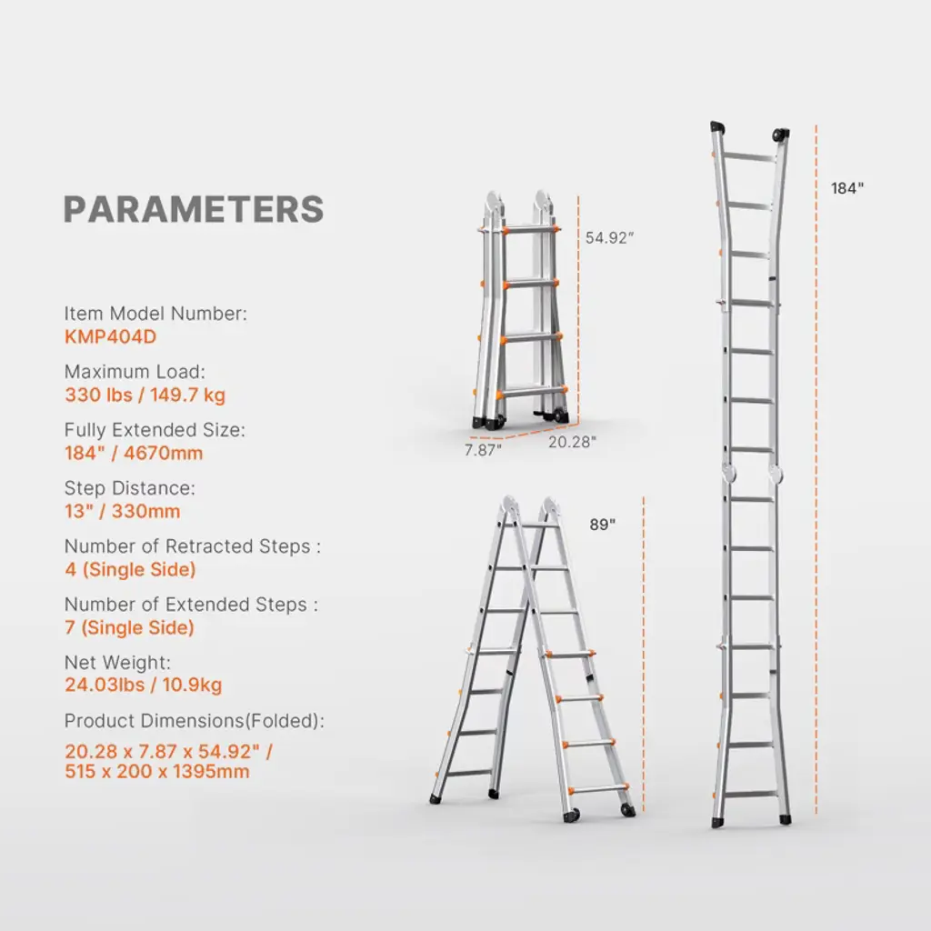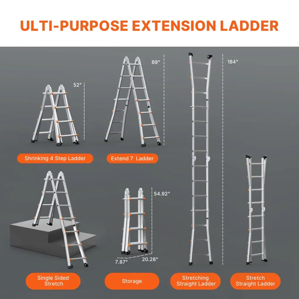Feature: Safe A-Frame Ladder: Designed with an A-frame structure for enhanced stability, this extension ladder supports a weight capacity of up to 330 lbs. It requires no assembly, allowing for immediate use, and its non-slip design ensures peace of mind while working at heights. Easy to Move: The base features dual wheels, making it easy to transport with one hand, solving the hassle of lifting traditional ladders and making your experience more enjoyable. Versatile Ladder: This telescoping a frame ladder adapts to various needs, easily transitioning between different configurations. With extendable legs reaching up to 180° and a maximum height of 15.5 ft / 4670 mm, it’s perfect for maintenance or attic cleaning. Secure and Stable: Each step includes a locking mechanism to keep the ladder stable during use, preventing sliding or folding for safe climbing. Unlocking is simple with a pull, ensuring ease of operation. Sturdy and Durable: Made from high-strength aluminum alloy, this a frame ladder is built to last without bending or breaking, even when used at height. The bottom is equipped with anti-slip pads for added safety. Package Content A Frame Extension Ladder x 1 User Manual x 1