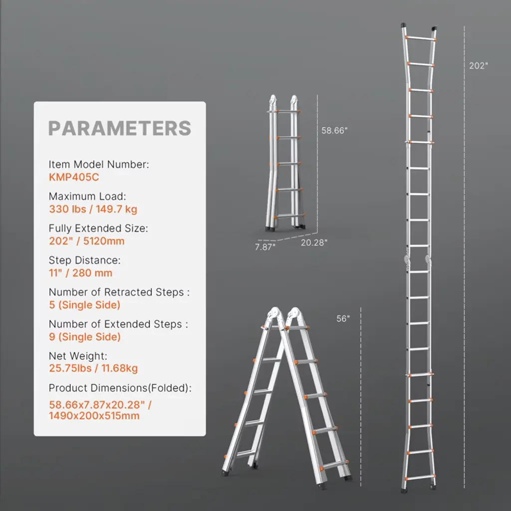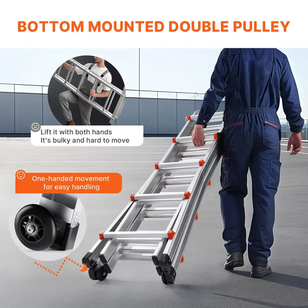 Feature: Safe A-Frame Ladder: Designed with an A-frame structure for enhanced stability, this extension ladder supports a weight capacity of up to 330 lbs. It requires no assembly, allowing for immediate use, and its non-slip design ensures peace of mind while working at heights. Easy to Move: The base features dual wheels, making it easy to transport with one hand, solving the hassle of lifting traditional ladders and making your experience more enjoyable. Versatile Ladder: This telescoping a frame ladder adapts to various needs, easily transitioning between different configurations. With extendable legs reaching up to 180° and a maximum height of 16.8 ft / 5120 mm, it’s perfect for maintenance or attic cleaning. Secure and Stable: Each step includes a locking mechanism to keep the ladder stable during use, preventing sliding or folding for safe climbing. Unlocking is simple with a pull, ensuring ease of operation. Sturdy and Durable: Made from high-strength aluminum alloy, this a frame ladder is built to last without bending or breaking, even when used at height. The bottom is equipped with anti-slip pads for added safety. Package Content A Frame Extension Ladder x 1 User Manual x 1