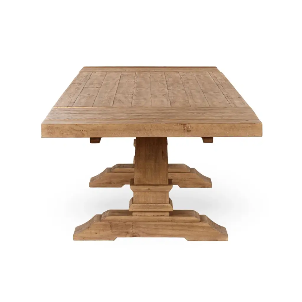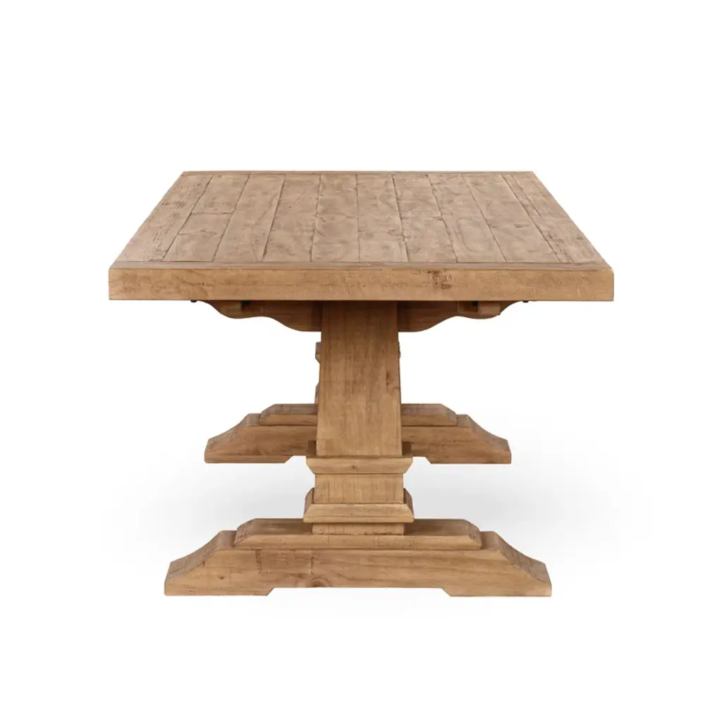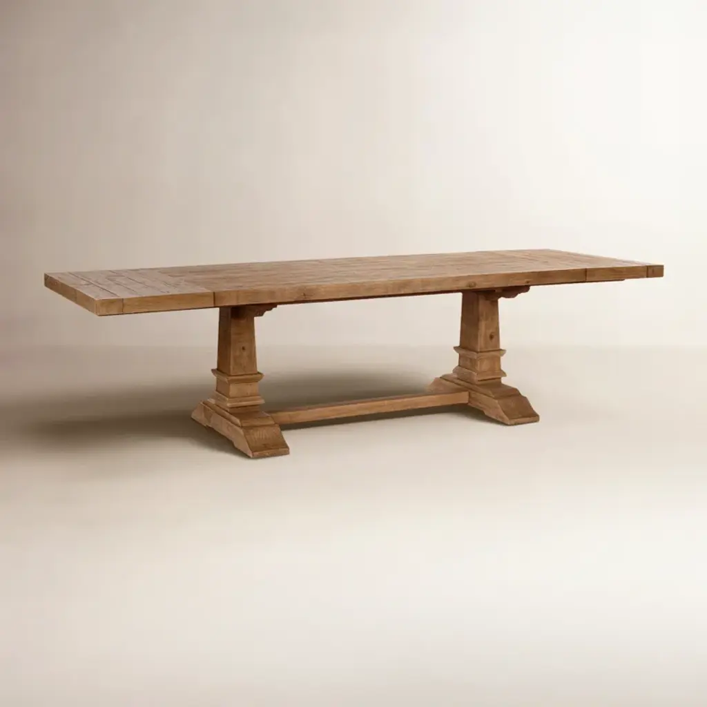 Presenting our stunning extendable dining table, a testament to both elegance and sustainability. Crafted from reclaimed pine, this table embodies rustic charm with its aged cream color and hand-finished plank-style top. The natural imperfections and character of the wood shine through, adding warmth and depth to your dining space. Standing proudly atop a turned pedestal base, this table exudes timeless sophistication while honoring the earth-friendly ethos of reclaimed materials. Whether hosting family dinners or gathering with friends, this dining table offers ample space and enduring style for years to come.