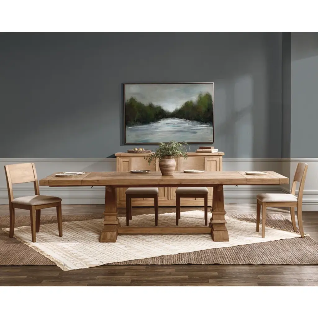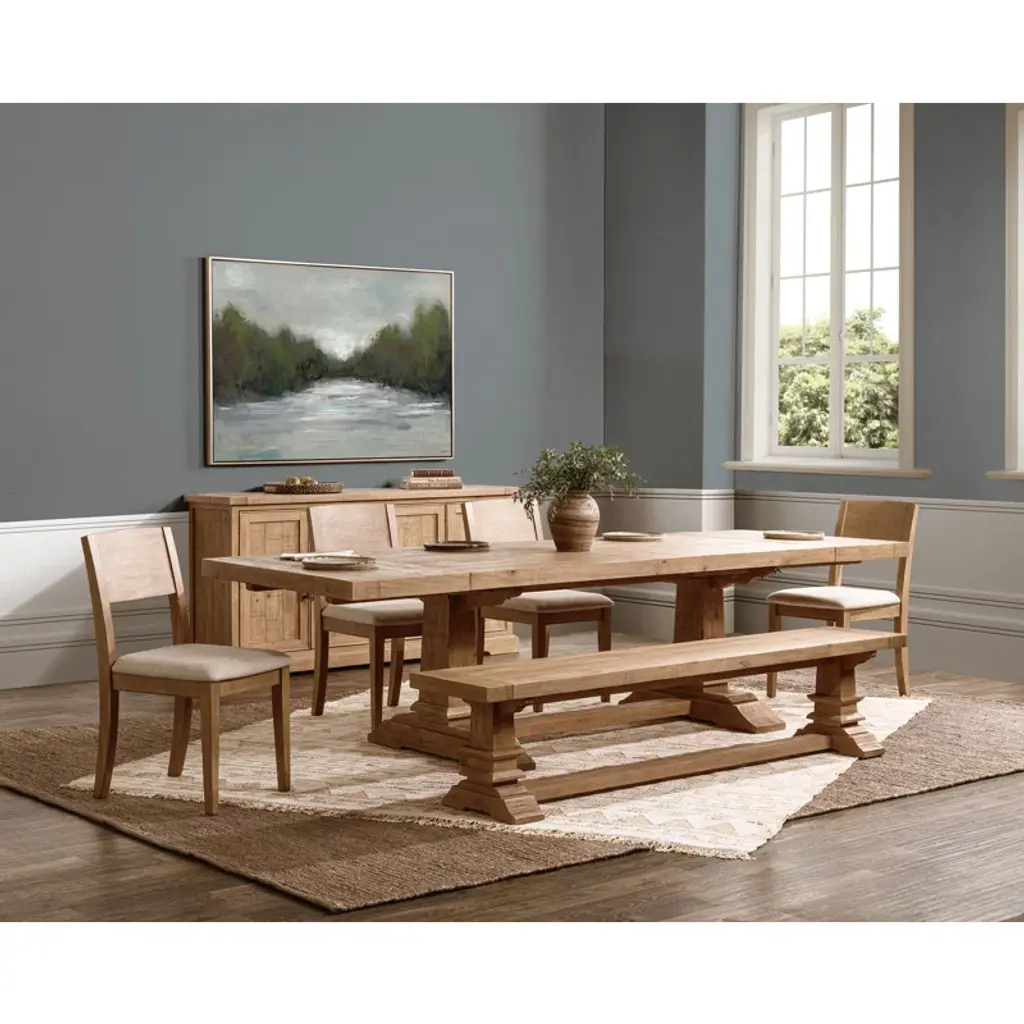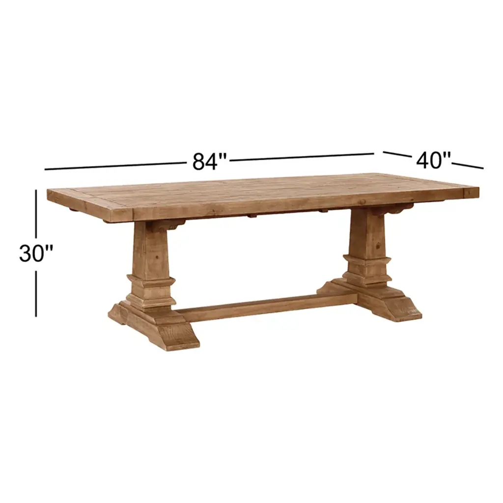 Presenting our stunning extendable dining table, a testament to both elegance and sustainability. Crafted from reclaimed pine, this table embodies rustic charm with its aged cream color and hand-finished plank-style top. The natural imperfections and character of the wood shine through, adding warmth and depth to your dining space. Standing proudly atop a turned pedestal base, this table exudes timeless sophistication while honoring the earth-friendly ethos of reclaimed materials. Whether hosting family dinners or gathering with friends, this dining table offers ample space and enduring style for years to come.