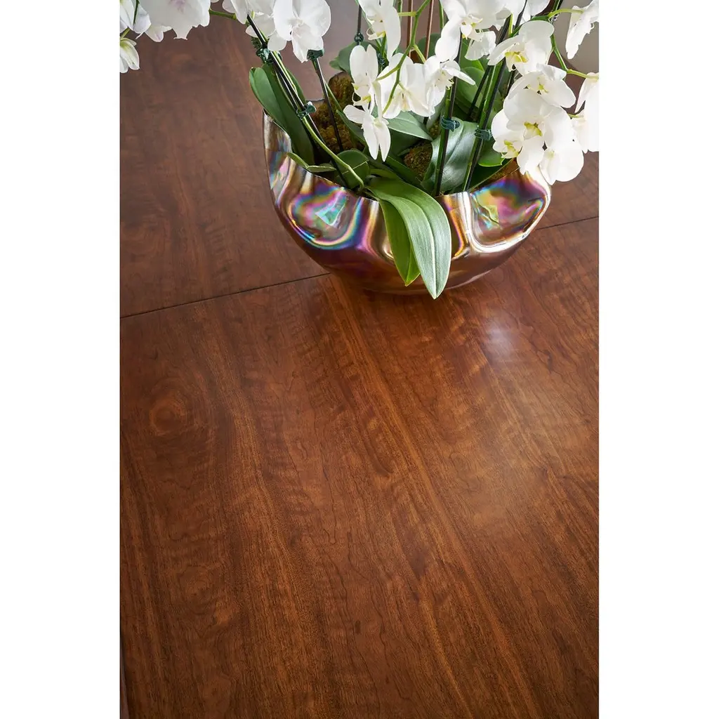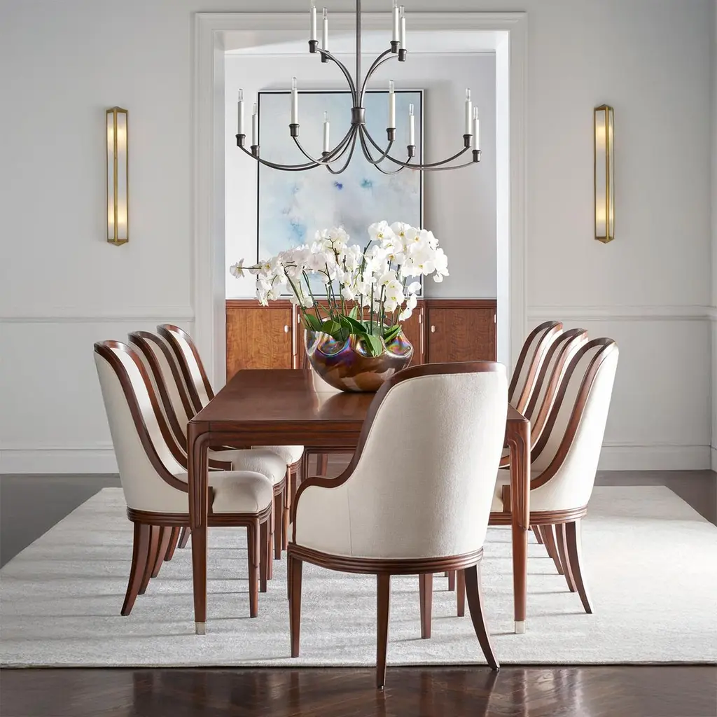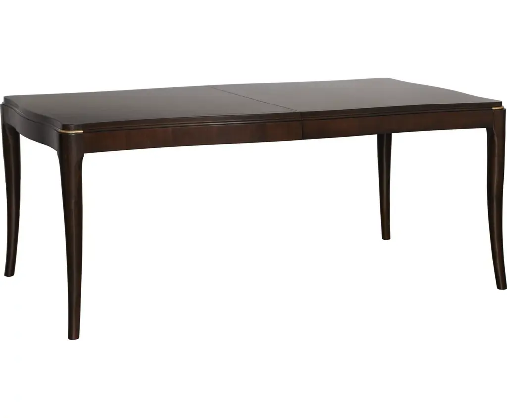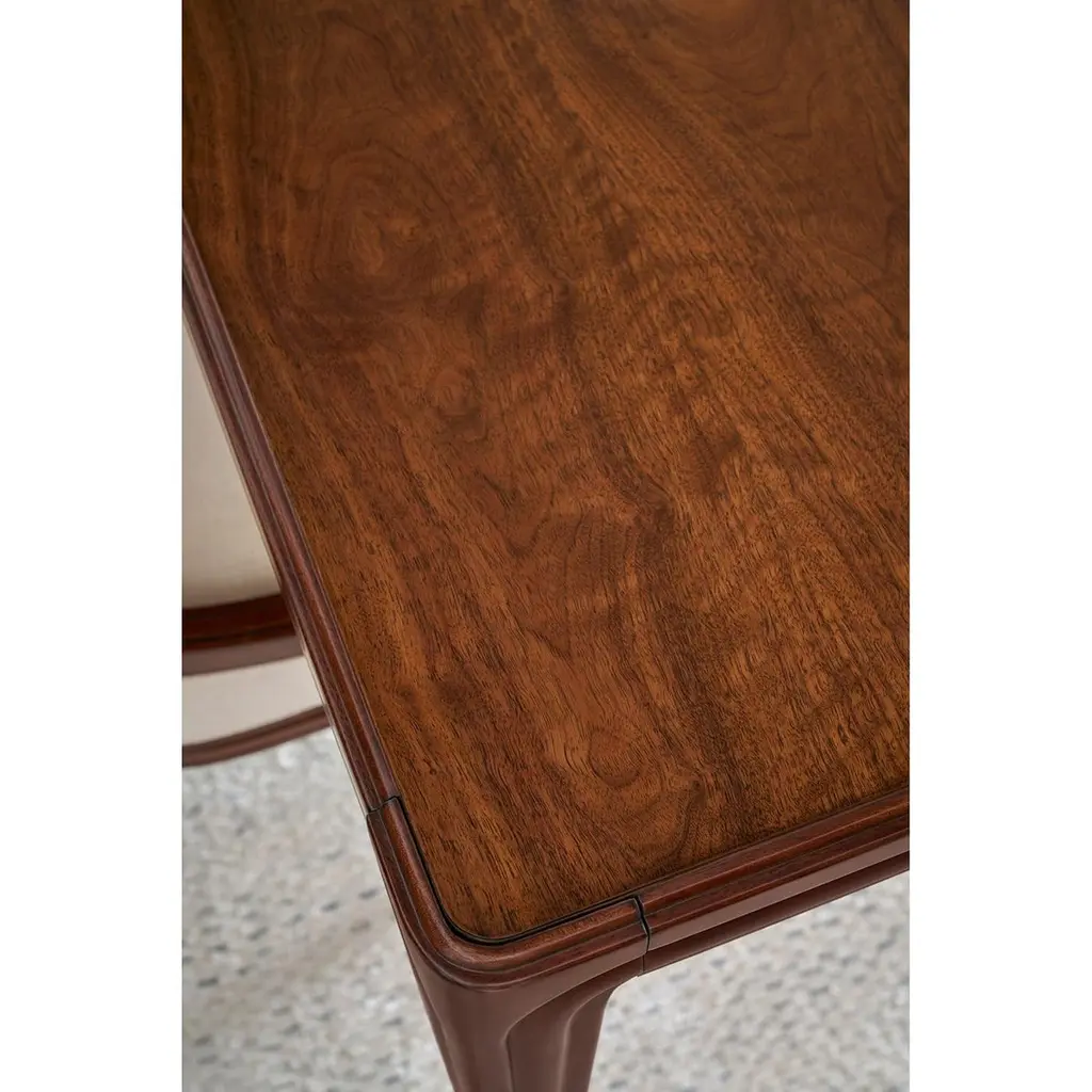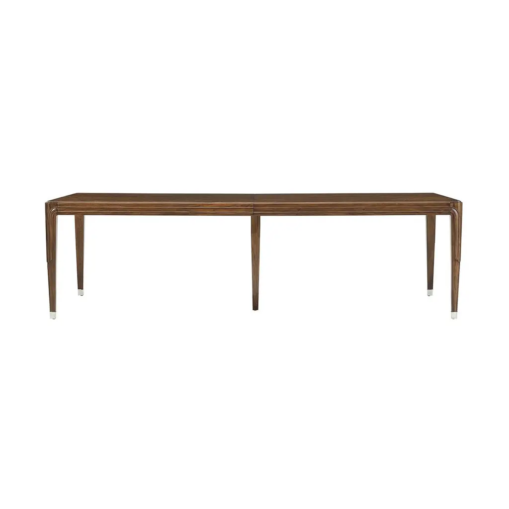 Expertly crafted from figured walnut, this exquisite piece showcases the grandeur of Art Deco design. The streamlined silhouette, paired with tapered legs and subtle metal-capped feet, exudes sophistication while maintaining a timeless appeal.Designed for both intimate gatherings and grand occasions, this dining table effortlessly extends to accommodate up to 12 guests. The seamless extension leaf adds functionality without compromising the table’s impeccable aesthetic. Open Dimensions: 128" W x 48" D x 30" HClosed Dimensions: 105" W x 48" D x 30" HSeats up to 12Number Of Leaves: One 23" leaf.