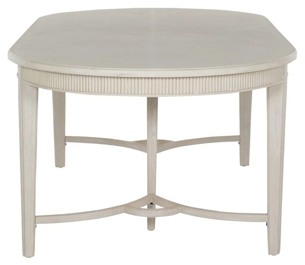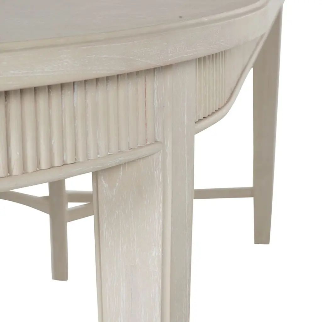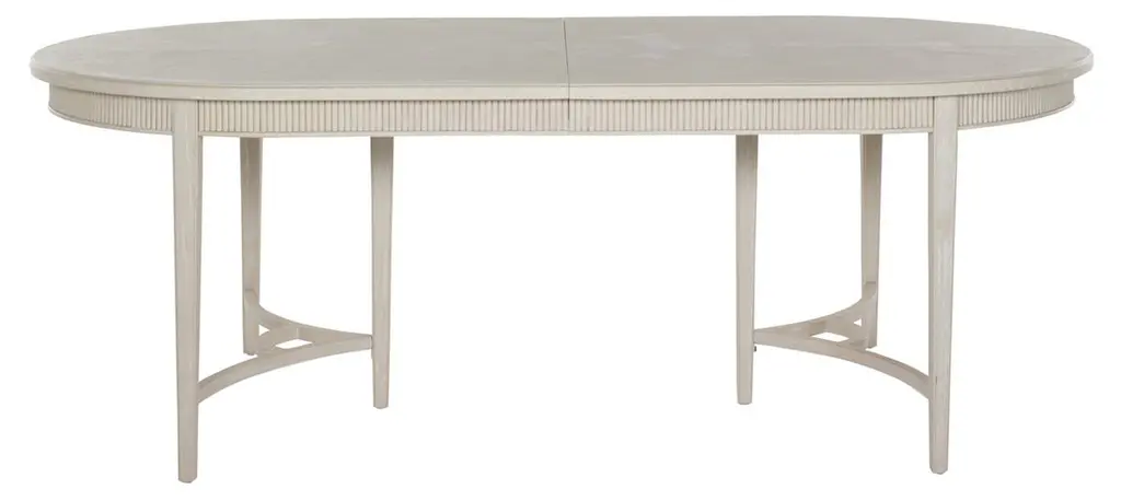 The Whitlock Dining Table exudes timeless elegance with its cerused finish and classic design. This table features an oval shape and includes a 20-inch leaf that extends to accommodate additional guests. Crafted from durable mindy wood, this dining table features a refined oval shape and intricately detailed edges, adding a touch of sophistication to any dining space. The sturdy construction ensures lasting quality, making it an ideal centerpiece for family gatherings and entertaining guests. The Whitlock Dining Table seamlessly blends traditional charm with contemporary style, creating a versatile piece that enhances any decor. This product uses natural or handmade materials, so variations in color and pattern are to be expected and celebrated.