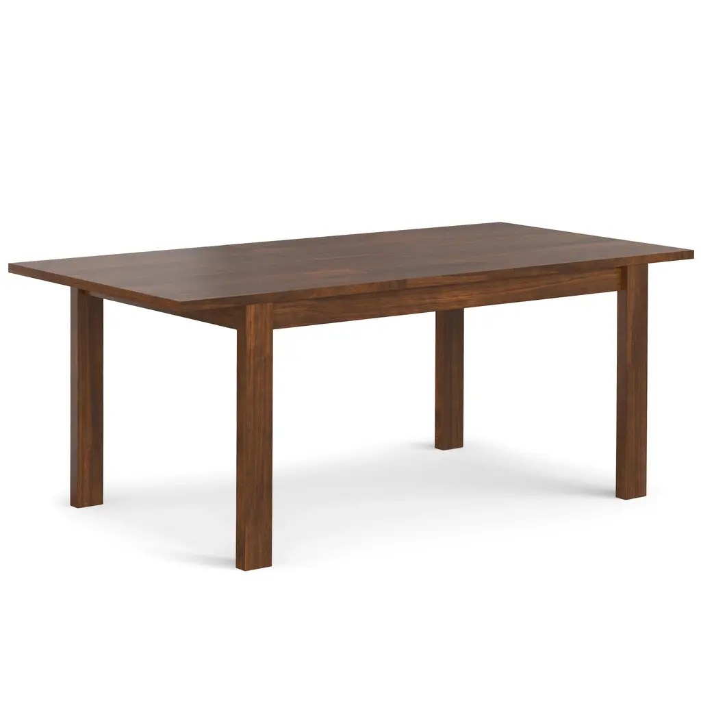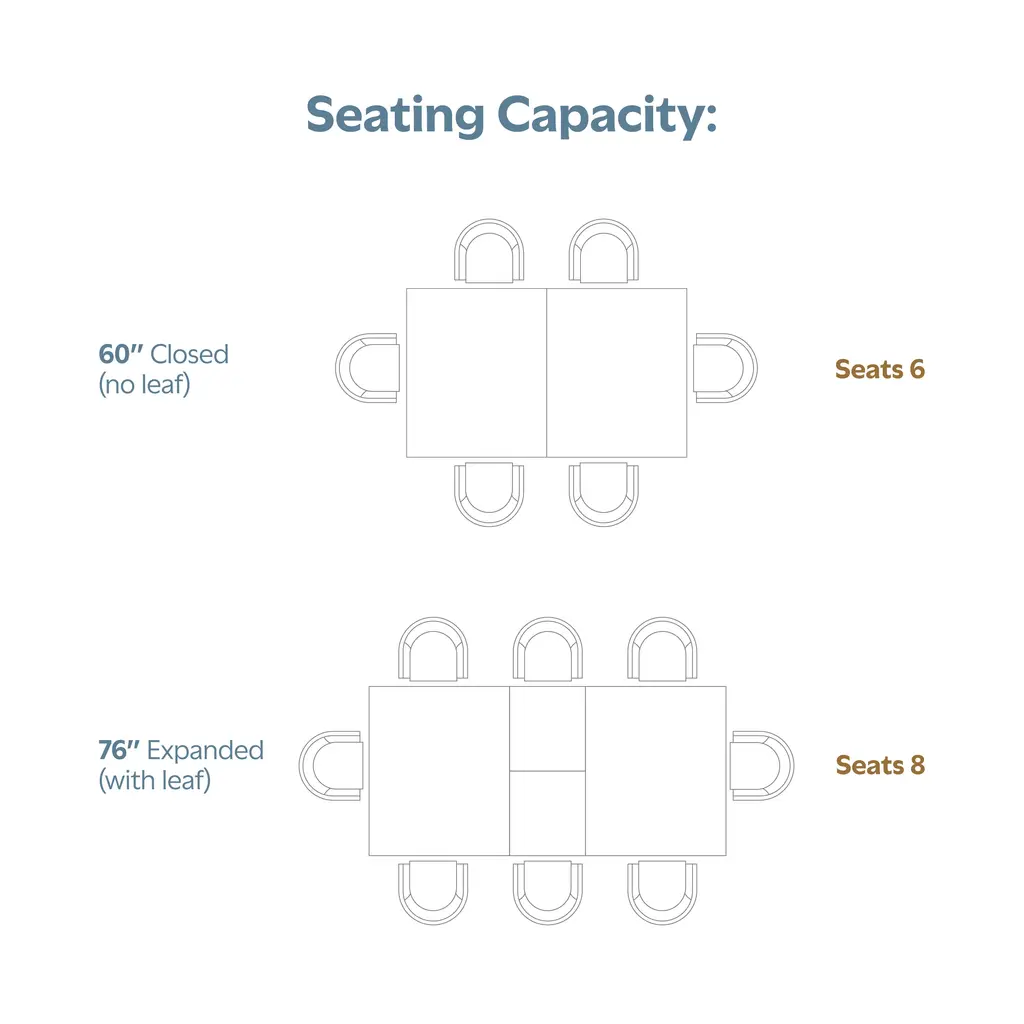 This transitional-style, expandable dining table has a concealed leaf built into the tabletop that extends the length of the table from 60 inches to 76 inches; it accommodates up to 6 people when closed and up to 8 people when open, supports up to 200 lbs, and has a 25.3-inch leg clearance, from the floor to the table apron.; The rectangular tabletop is handcrafted with care using solid wood walnut veneer, a high-quality veneer made with real walnut wood and an engineered wood core for exceptional strength and resistance to seasonal changes that cause wood to warp or crack.; Supporting the tabletop are thick, straight, solid walnut wood legs and an inset table apron that adds a refined touch.; Hand finished with a protective lacquer to accentuate and enhance the exquisite grain, incredible beauty, and outstanding durability of the solid wood walnut veneer surface, so that this kitchen table can last for generations.; This extendable dining room table can be paired with a variety of dining chair styles so you can choose the best combination for the aesthetic and size of your dining space; it has a versatile look and can also be used as a multipurpose table in a family room or home office.; Fast, easy assembly: Attach the 4 legs to the tabletop, then adjust the levelers on the bottom of the legs to stabilize the table; detailed, illustrated instructions and all hardware for assembly are provided.; To extend the table, open the locks under the tabletop and pull the ends of the table apart to reveal the butterfly leaf; lift up and place the two pieces of the leaf, then push the ends of the table to secure the leaf, and close the locks under the table.