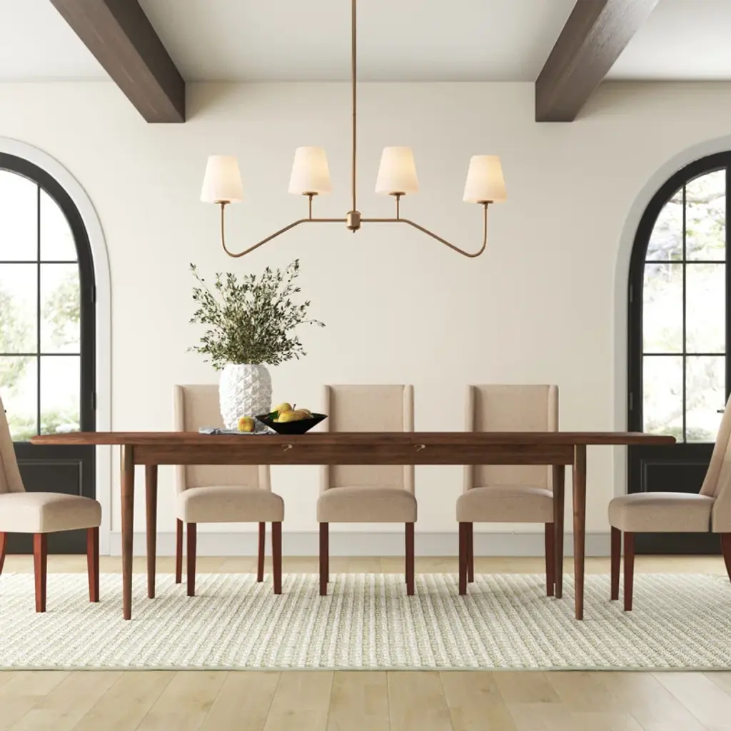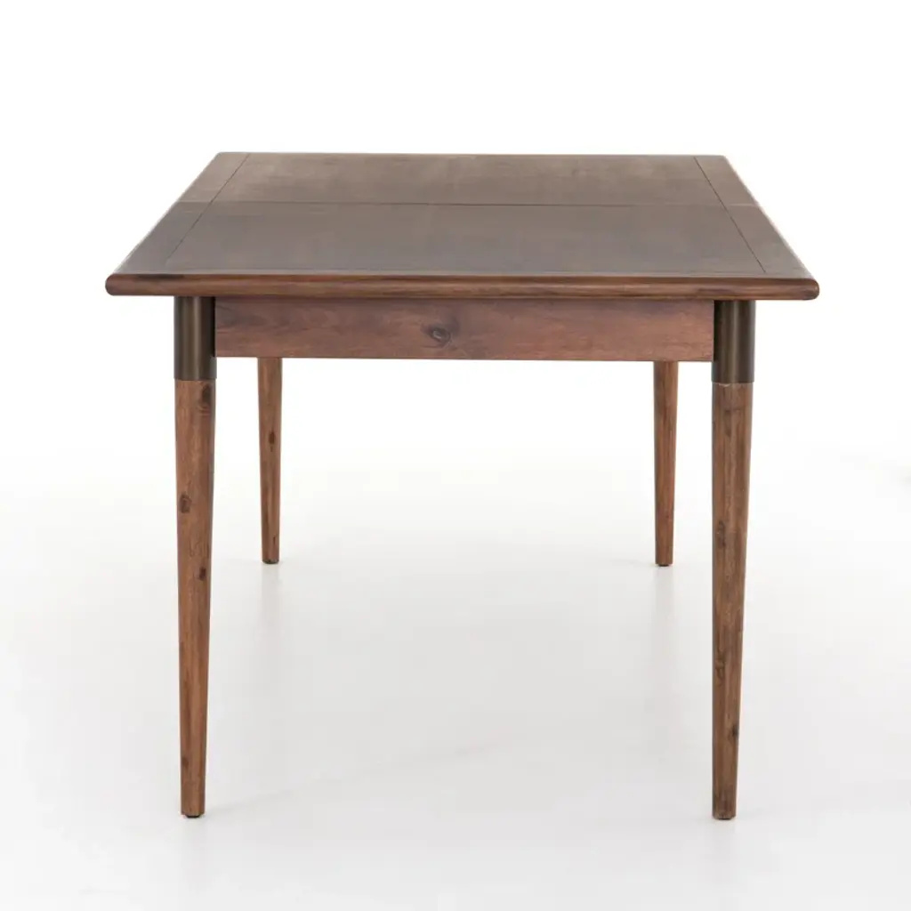 Cone-tapered legs and iron detailing combine in this minimalist, Scandinavian-inspired dining table. It's made from solid acacia wood and veneer with a classic finish that shows off the wood's natural grain color variation. This stately dining table sits at 30" tall and comes with a butterfly leaf, so you can seat 8 people when it's collapsed and 10 when it's fully extended. Ideal for everyday dining and dinner parties alike, this versatile dining table is our pick for an everyday essential.