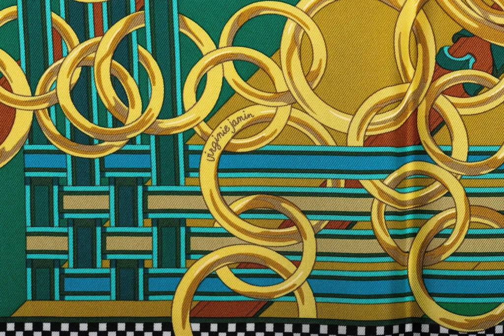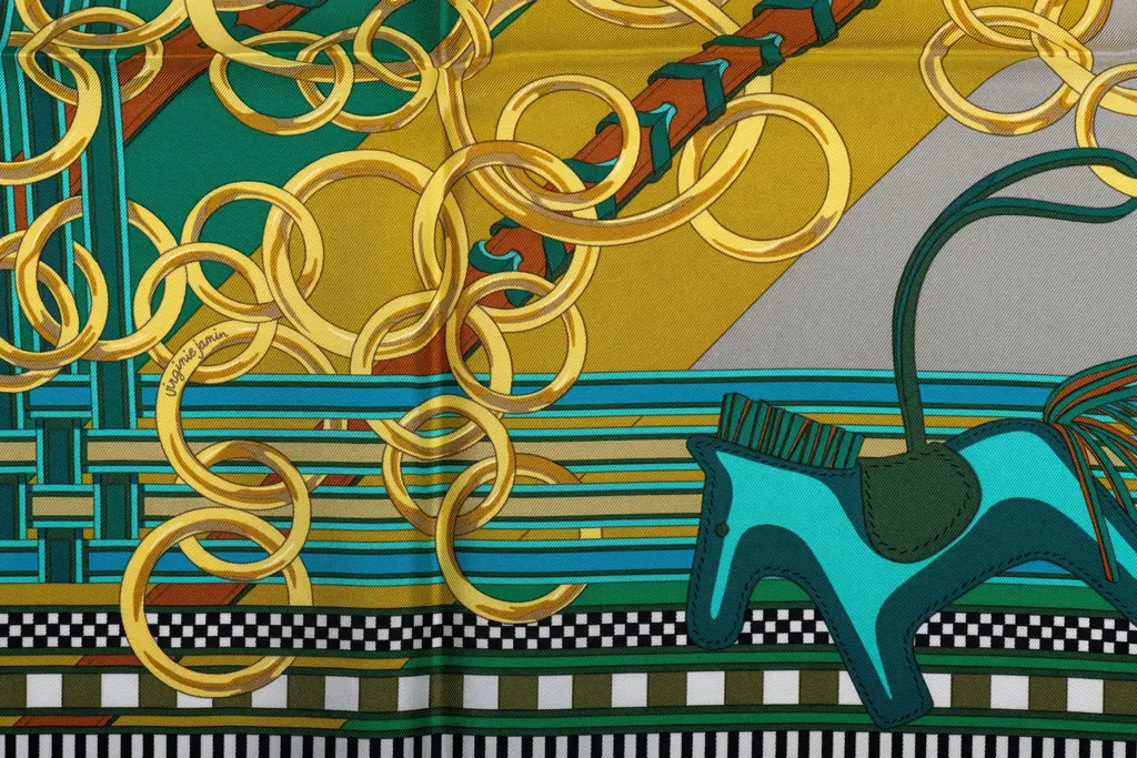Hermès collectible bag charms silk scarf in green and yellow. Hand-rolled edges. Box not included.