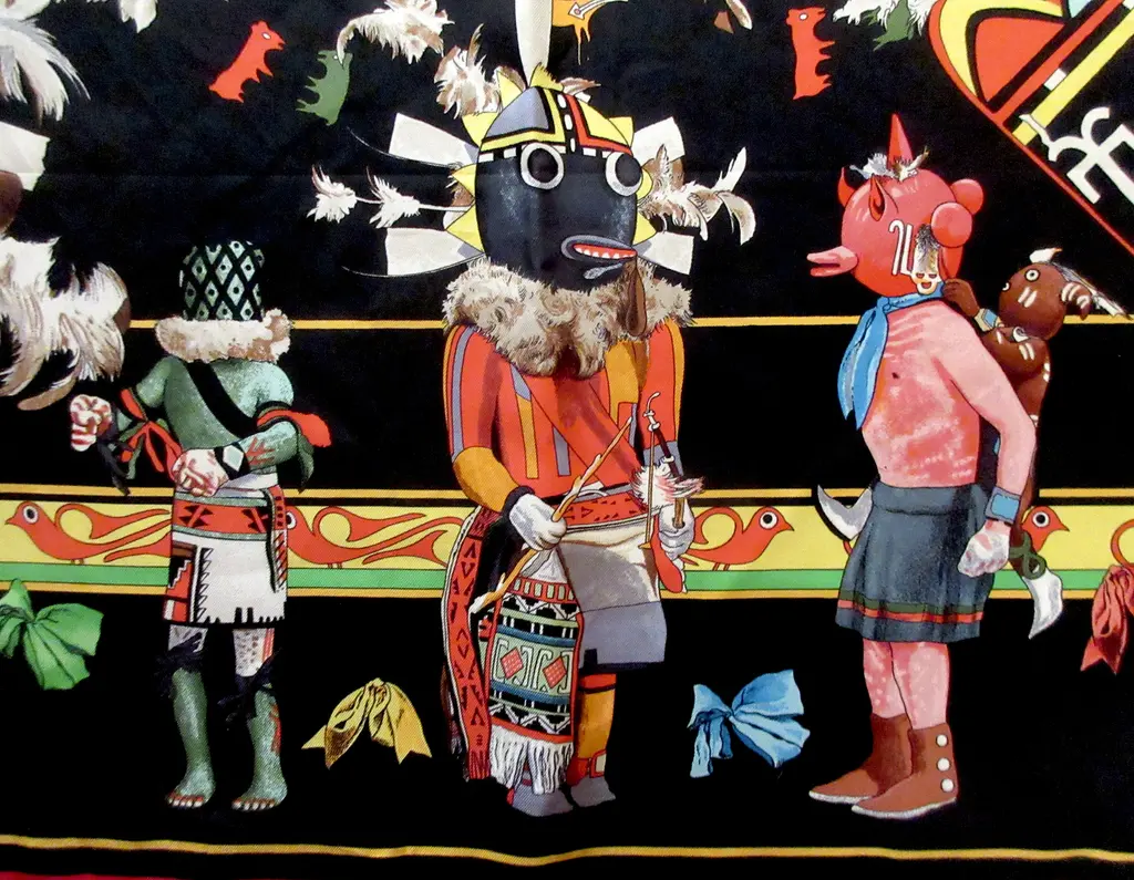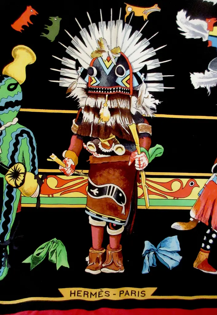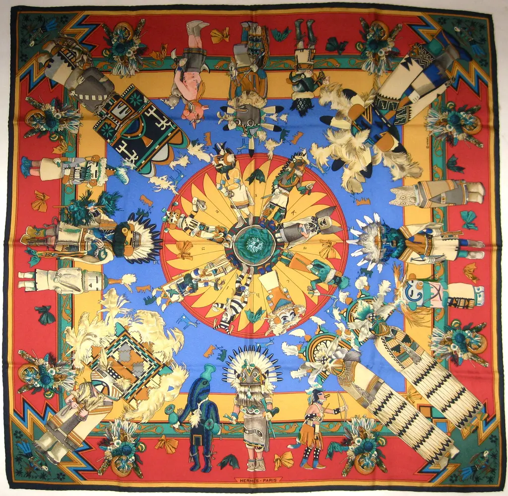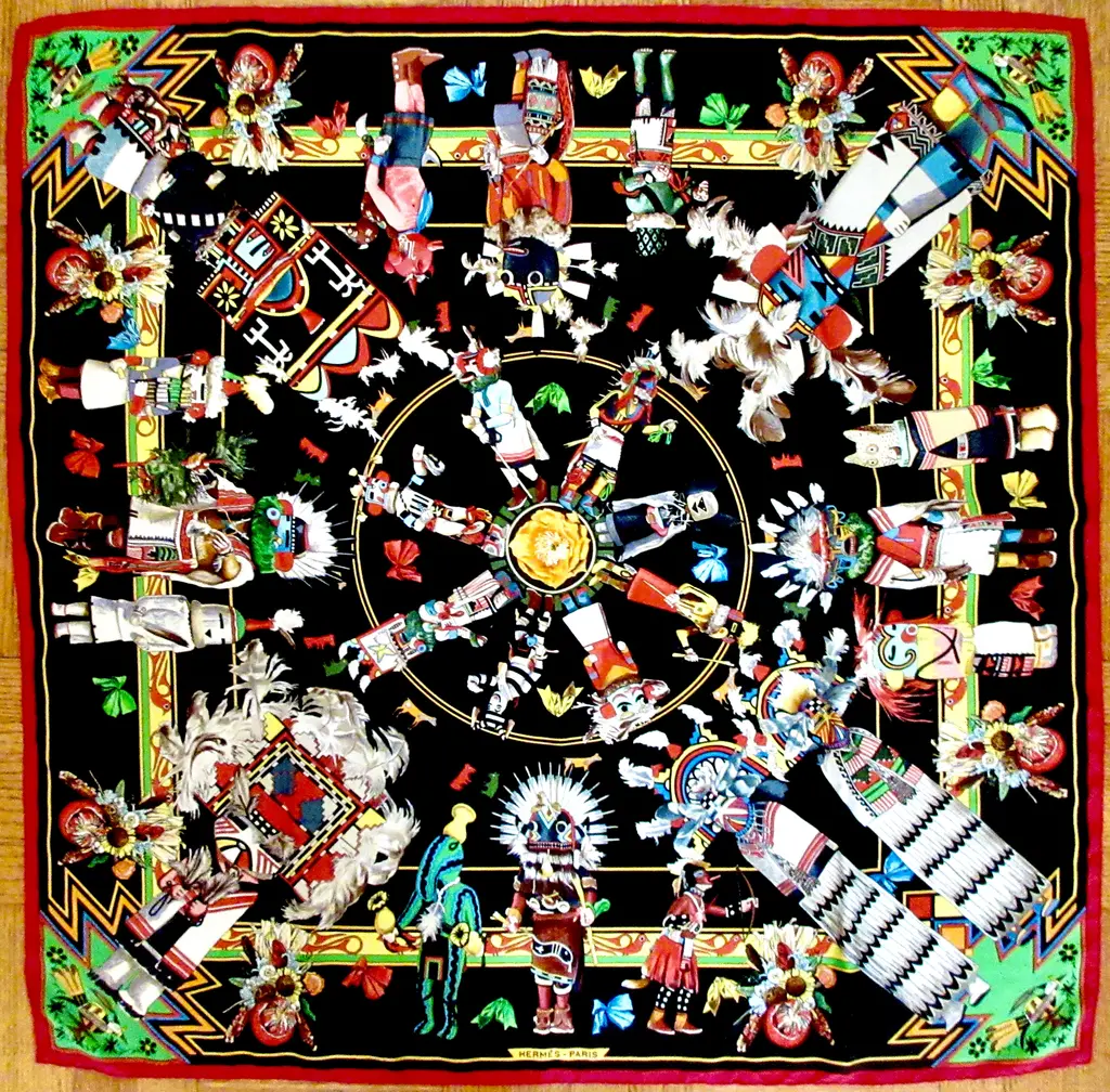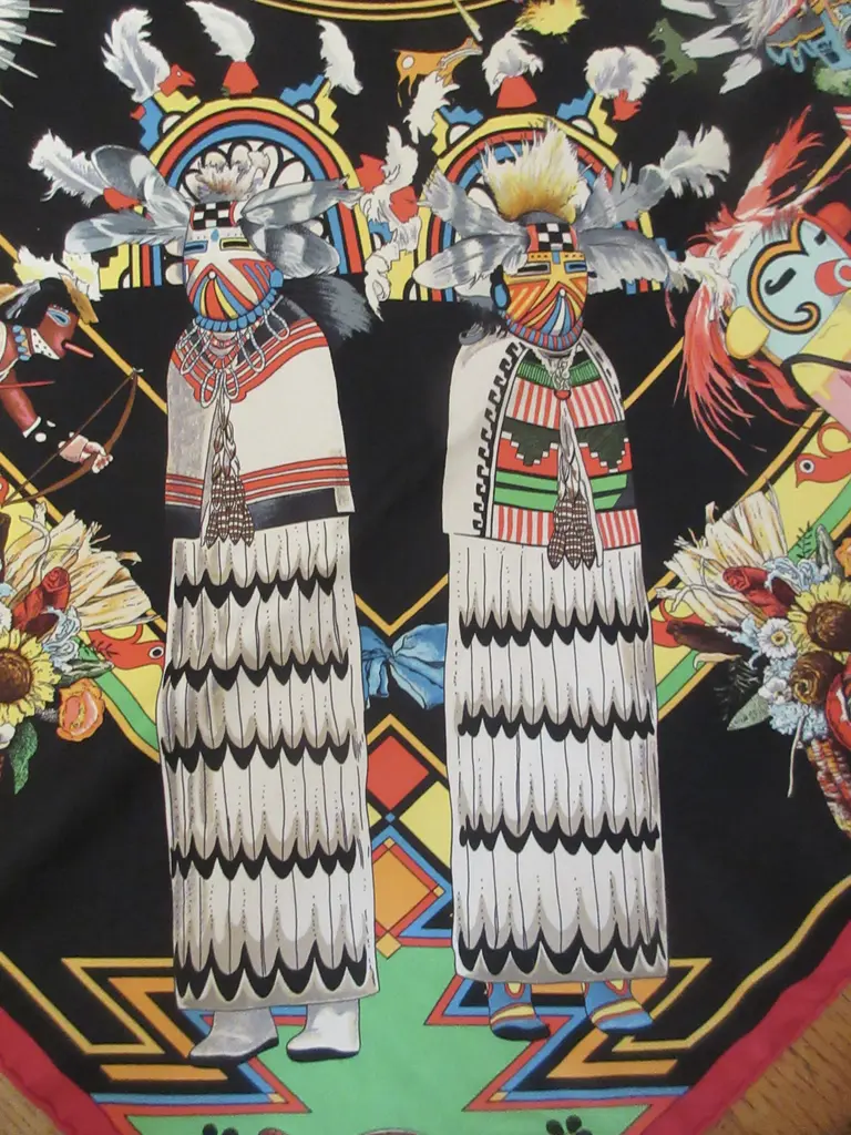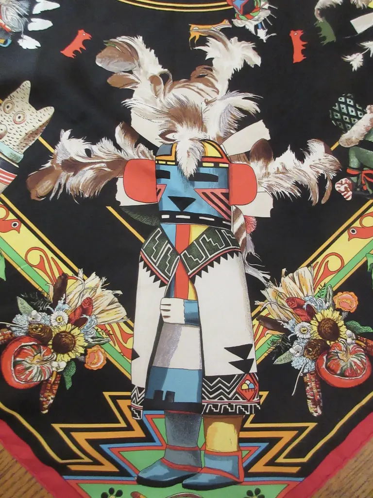 One of the most beautiful and intricate scarves ever offered by Hermès, Kachinas honors the exquisite dolls of the Hopi nation in dozens of colors and meticulous attention to detail, making this pleated scarf endlessly fascinating, especially in this bold jet black colorway with pops of saturated colors. Designed by the remarkable American artist Kermit Oliver in 1992.