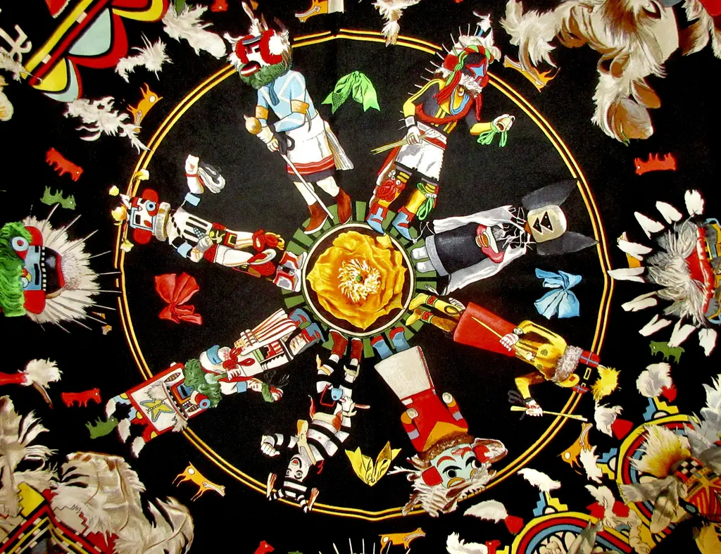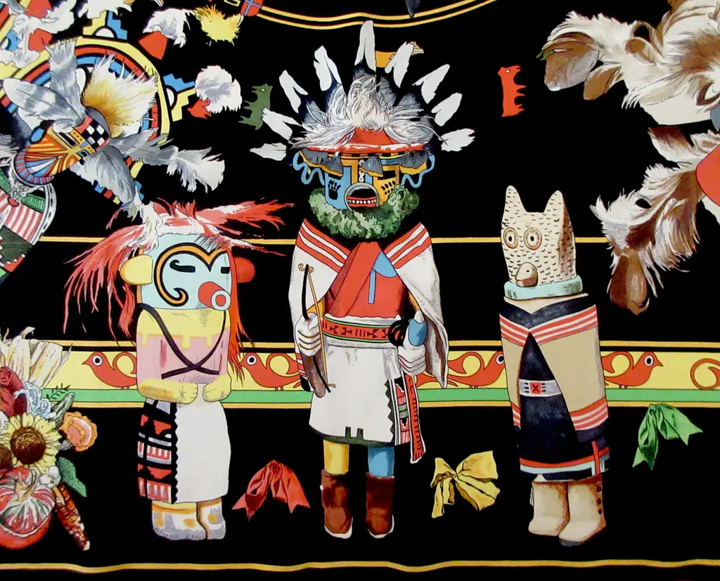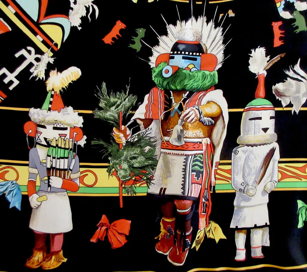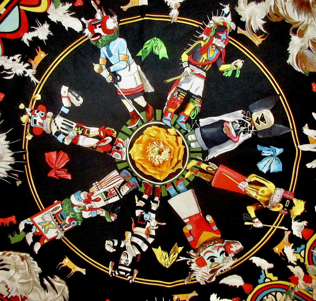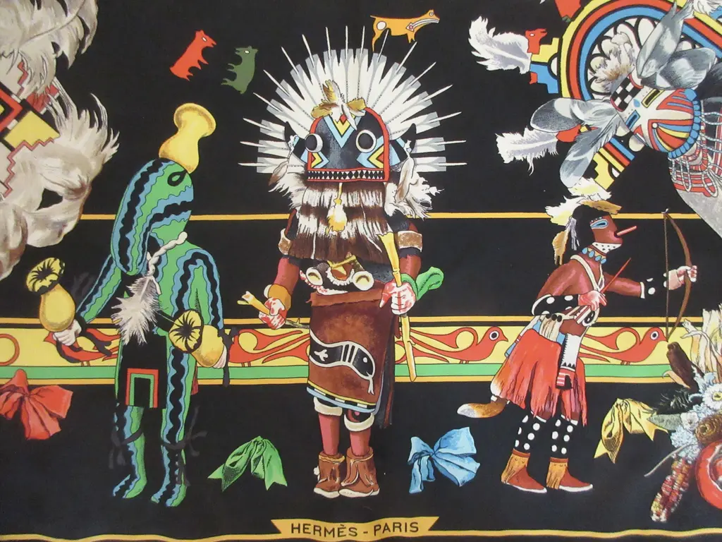 One of the most beautiful and intricate scarves ever offered by Hermès, Kachinas honors the exquisite dolls of the Hopi nation in dozens of colors and meticulous attention to detail, making this pleated scarf endlessly fascinating, especially in this bold jet black colorway with pops of saturated colors. Designed by the remarkable American artist Kermit Oliver in 1992.
