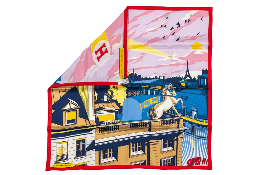 Hermès "Minuit au Faubourg" Silk Scarf in red. The pattern shows the city of Paris in a comic drawing. New with the original box.