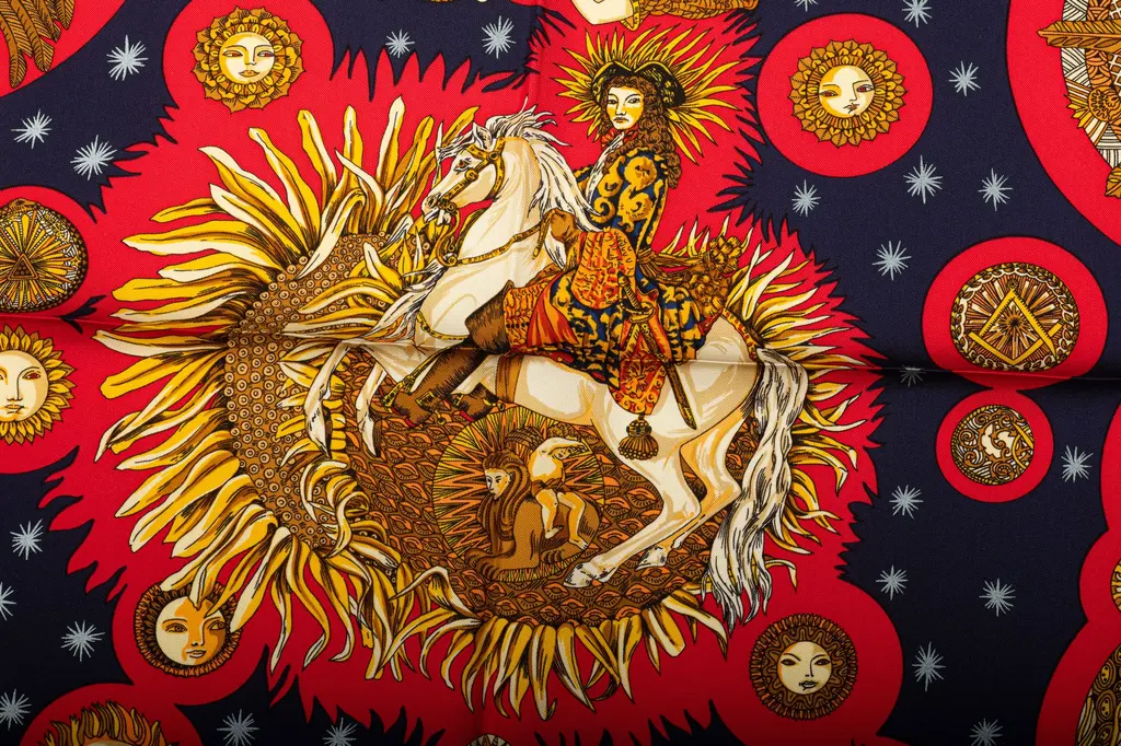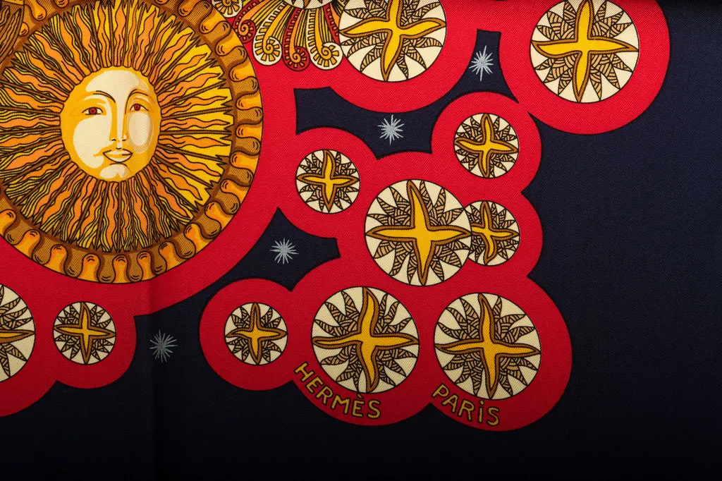 Hermes preloved black, red and yellow planets scarf. 100% silk, hand rolled trim.
