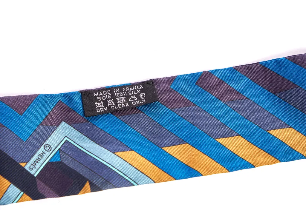 Hermès twilly silk scarf with palladium diamond slide in grey, black and blue geometric pattern. Includes original box.