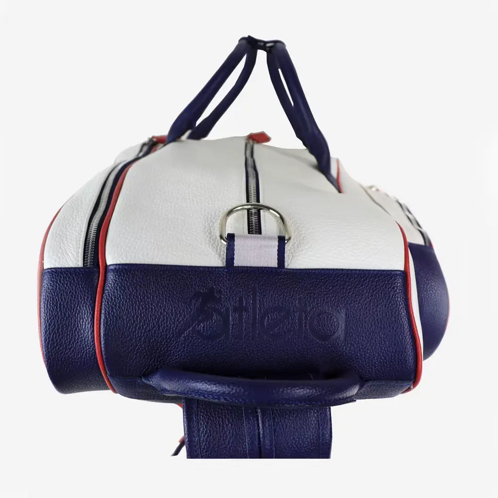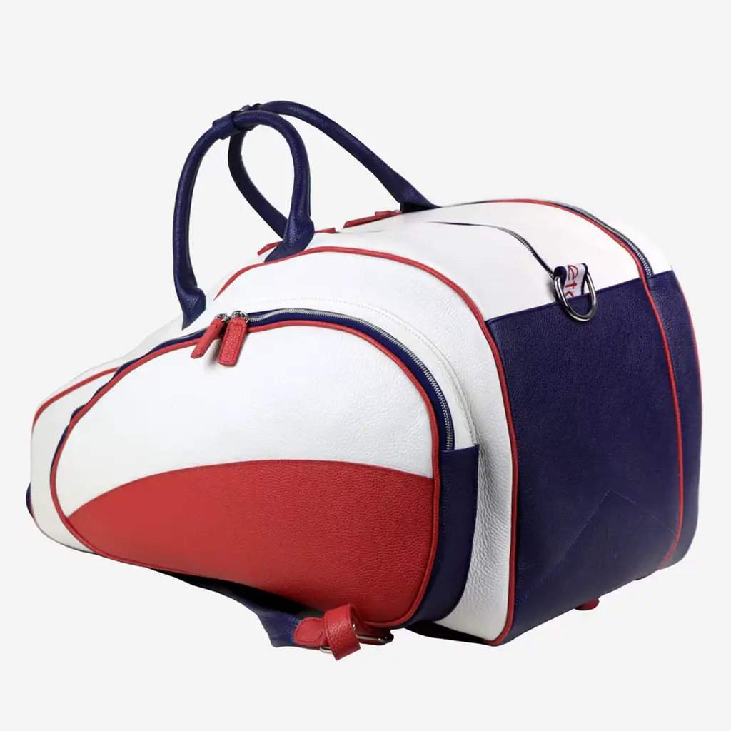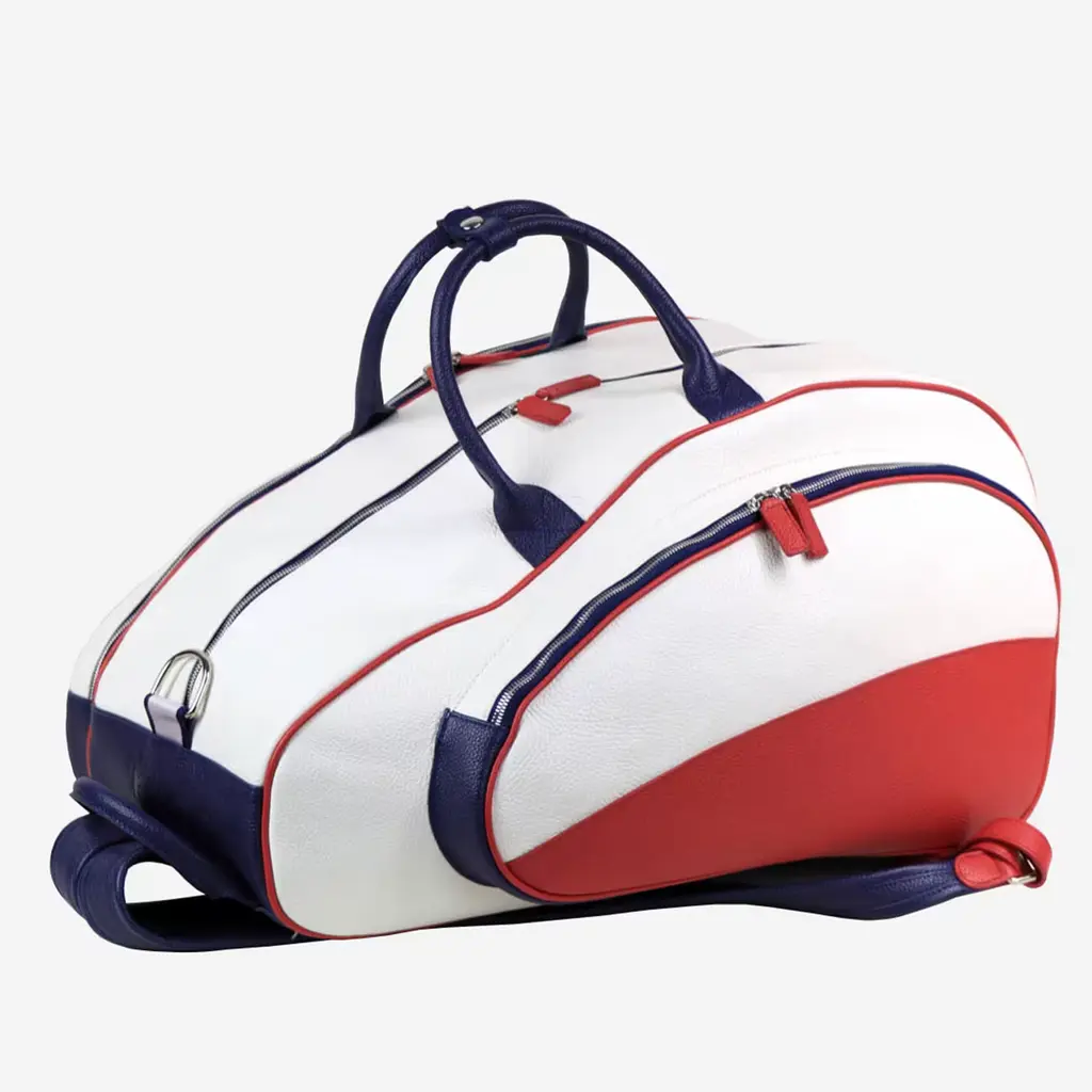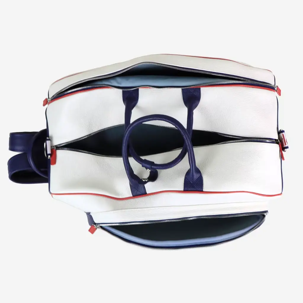 Designed to exemplify sartorial know-how, this water-resistant white leather backpack allows for easily storing padel and pickleball rackets and related sports equipment while not renouncing glamour. Red and blue details create a neat chromatic contrast that reveals its bold personality. Equipped with multiple pockets on the outside and inside, it features backpack straps, handles, and an adjustable strap included with the purchase. The bottom is reinforced.