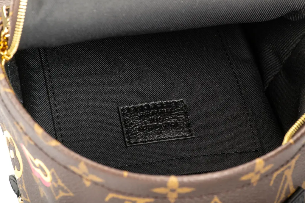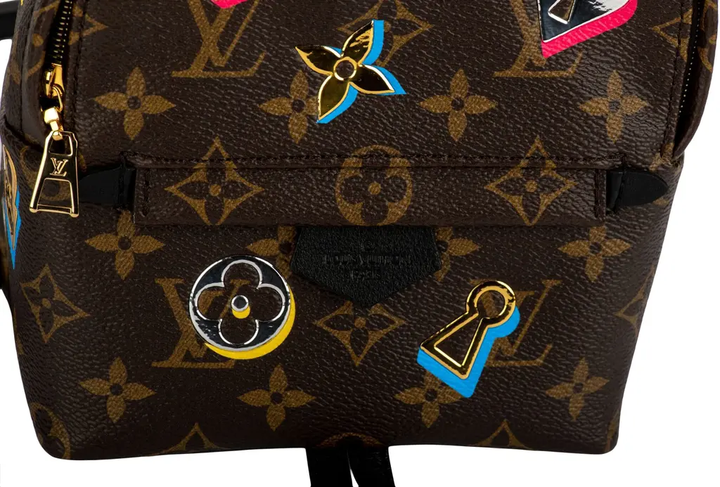 Louis Vuitton limited edition multicolor logos mini backpack. Monogram signature canvas with black leather straps. External zipped pocket, internal open pocket. Comes with serial number, dust cover, and box.