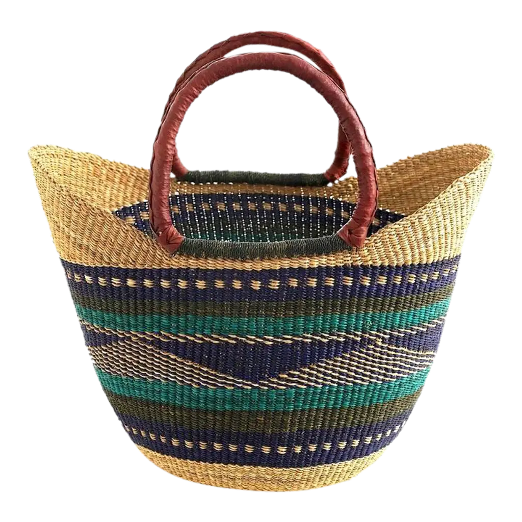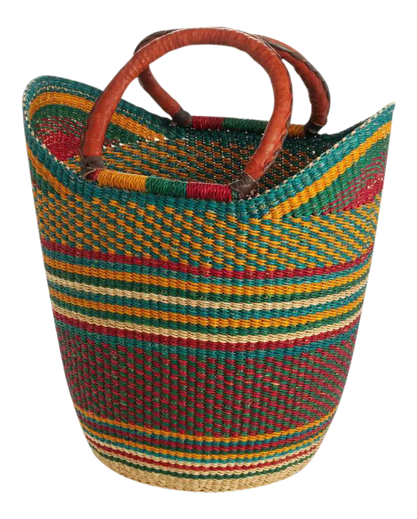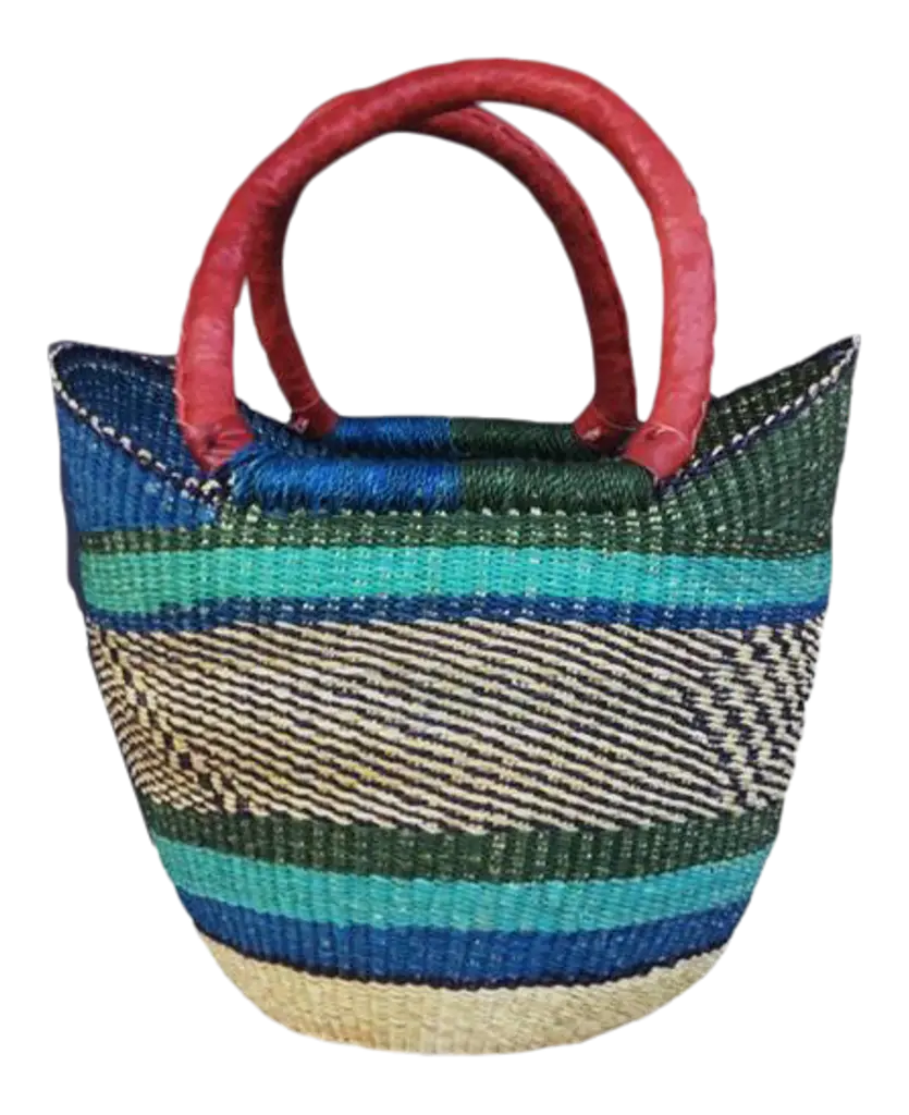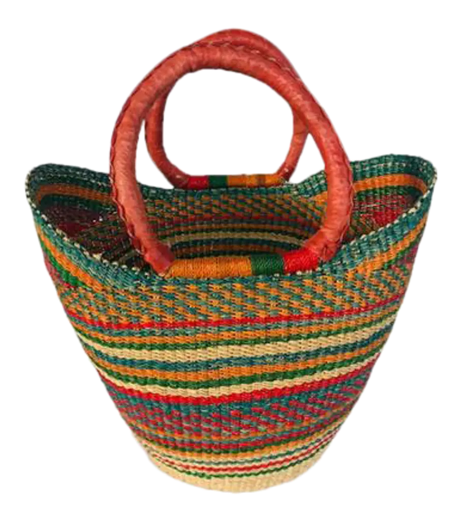 The Raffia Tote Bag in Red has a unique design that highlights weaving skills of Ghana. Contemporary form is combined with natural plant fibers to create each raffia tote. The woven tote bags showcase mixed weaving styles that are embellished with a playful fringe and a quality leather wrap around the handles. This sustainably handmade woven tote bag is a true fashion statement. The woven tote functions well to carry various fashion accessories, make up and personal items. Featured on Travel + Leisure.