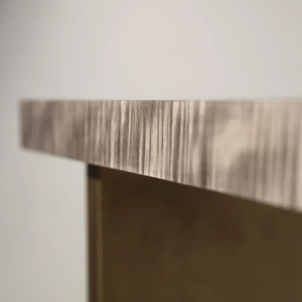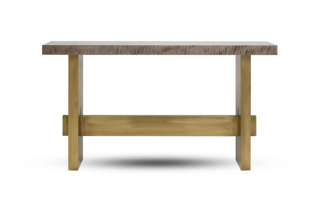 Geometry Console Table, in Bronze and Figured Sycamore, Handcrafted by DuisttThe geometry console uses the traditional craft technique in a contemporary design. The top is made using light grey figured sycamore and the base and crossbar are in bronze Lacquer. Custom sizes and materials are available upon request, and production lead time is 8 to 10 weeks. Designed and manufactured by Duistt in Portugal - Europe. Duistt arose in 2014 from the will and desire to produce high-end furniture pieces with special attention to quality and timeless design. Blending ancient knowledge and techniques with contemporary aesthetics, Duistt’s design approach elevates the user experience, guaranteeing them delightful pieces crafted with art that are unique and can last generations.