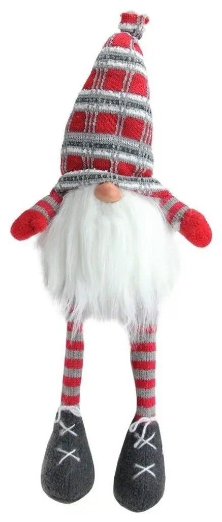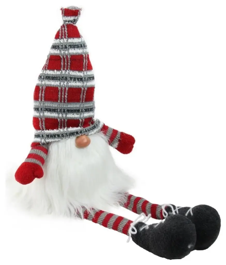 Add this adorable sitting Santa gnome to your holiday decor this yearHe sports red and gray stripes with a plaid red, gray and white gnome hat and shadow gray laced bootsPerfect for a fireplace mantle, desk or tableFor indoor use onlyMaterials: Polyester/plasticDimensions: 23"H x 6"W x 4.5"D