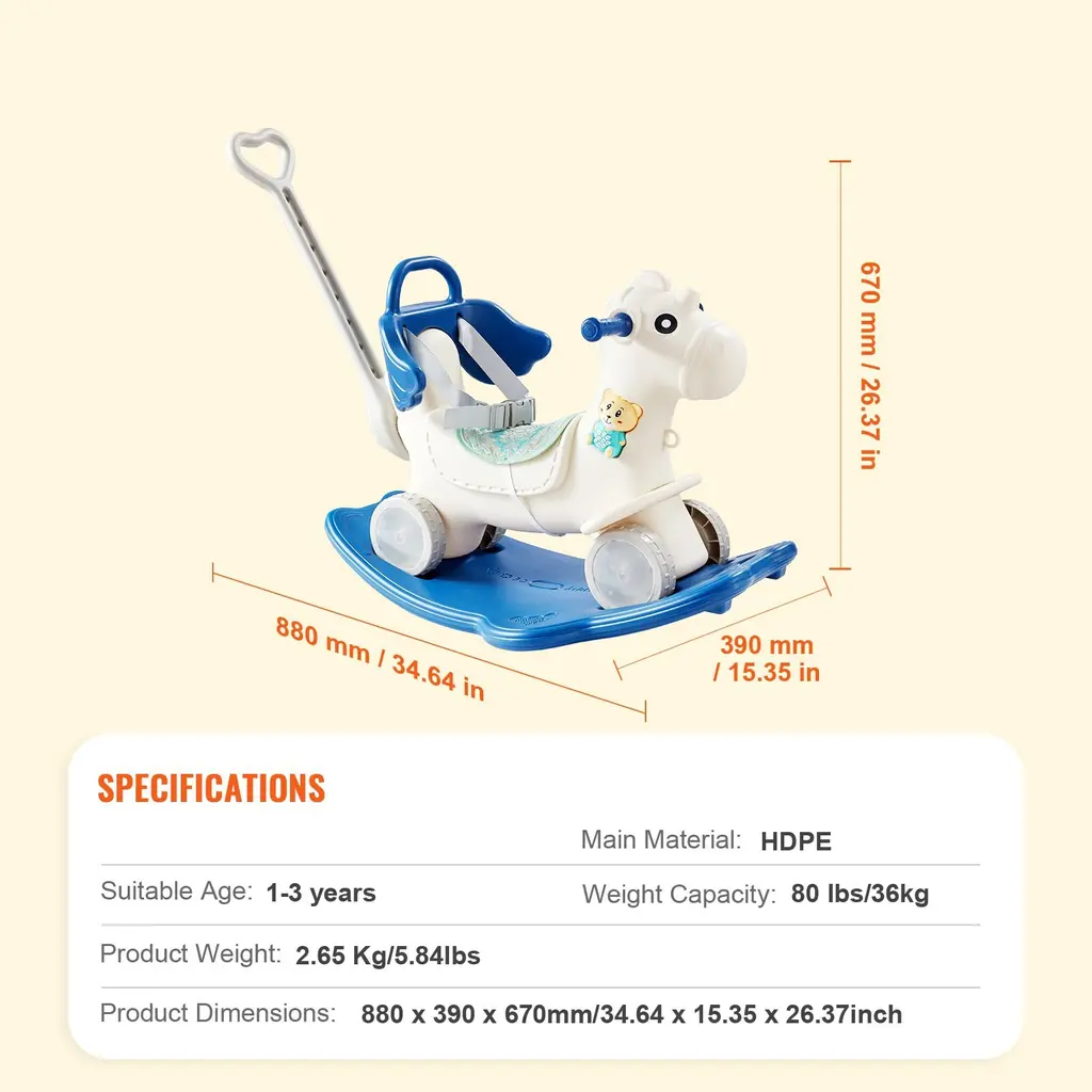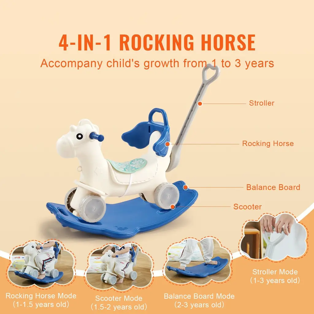 4 In 1 Rocking Horse For Toddlers With Wheels Push Handle And Sound - 34.64 X 15.35 X 26.37 Inch - Blue
