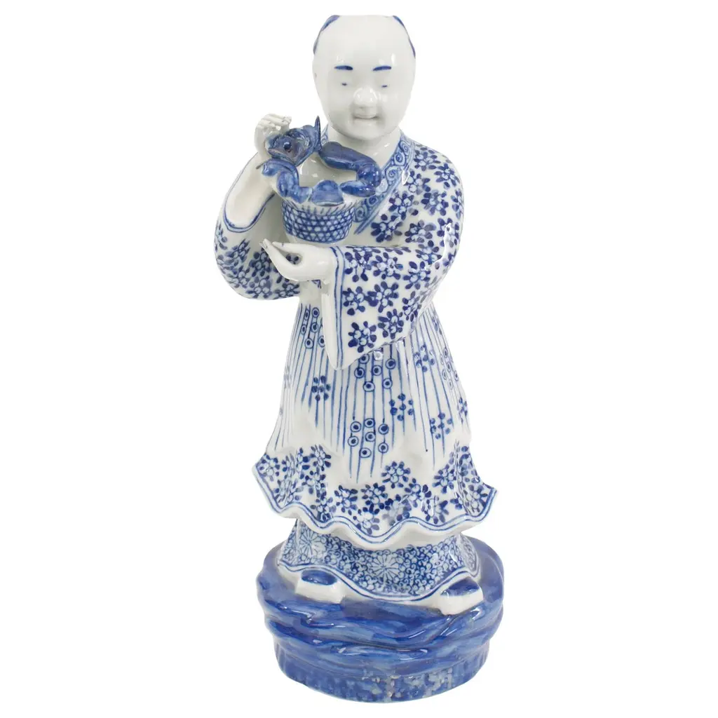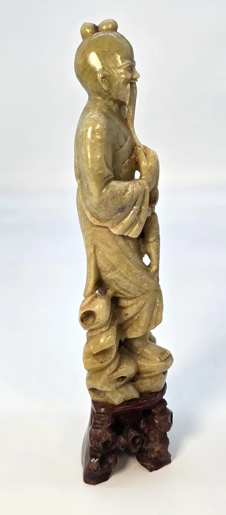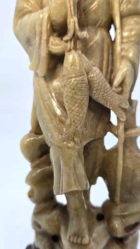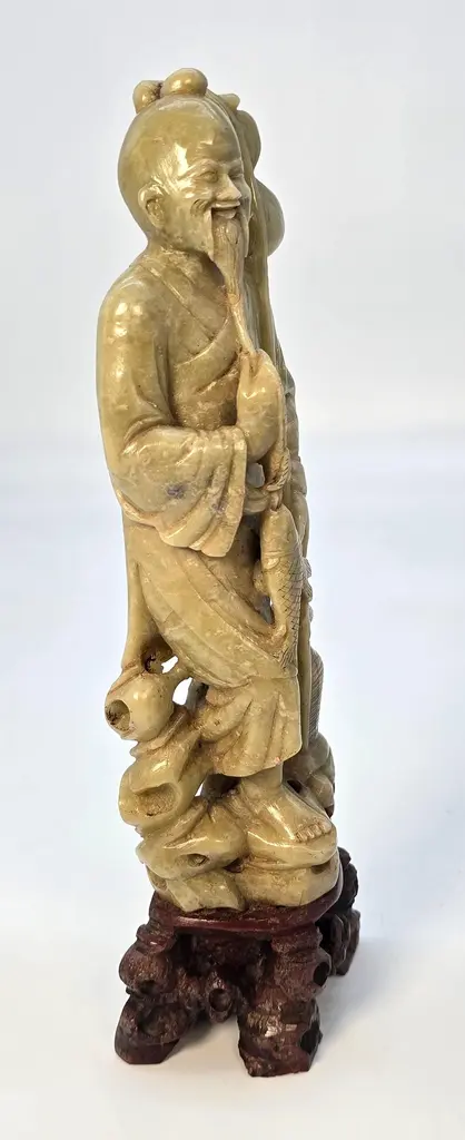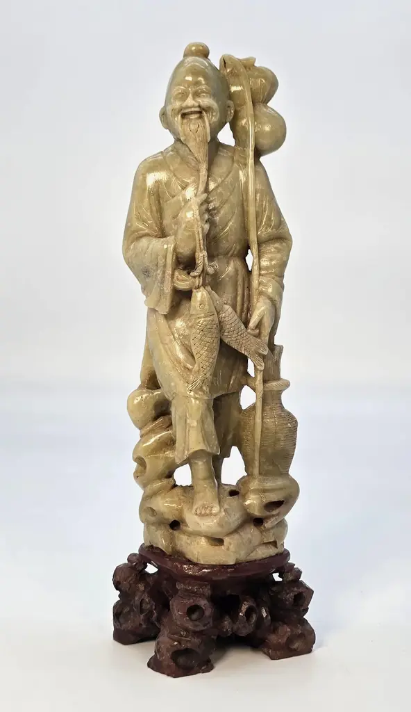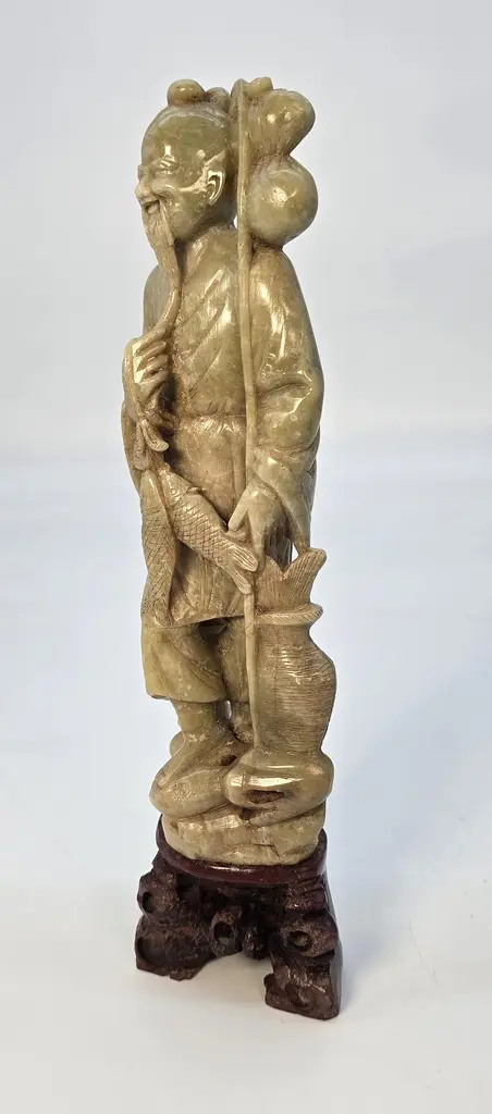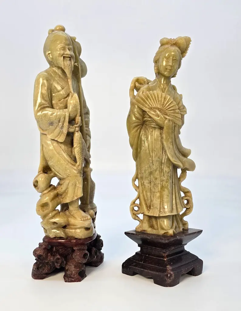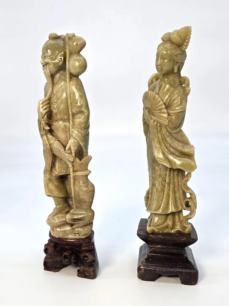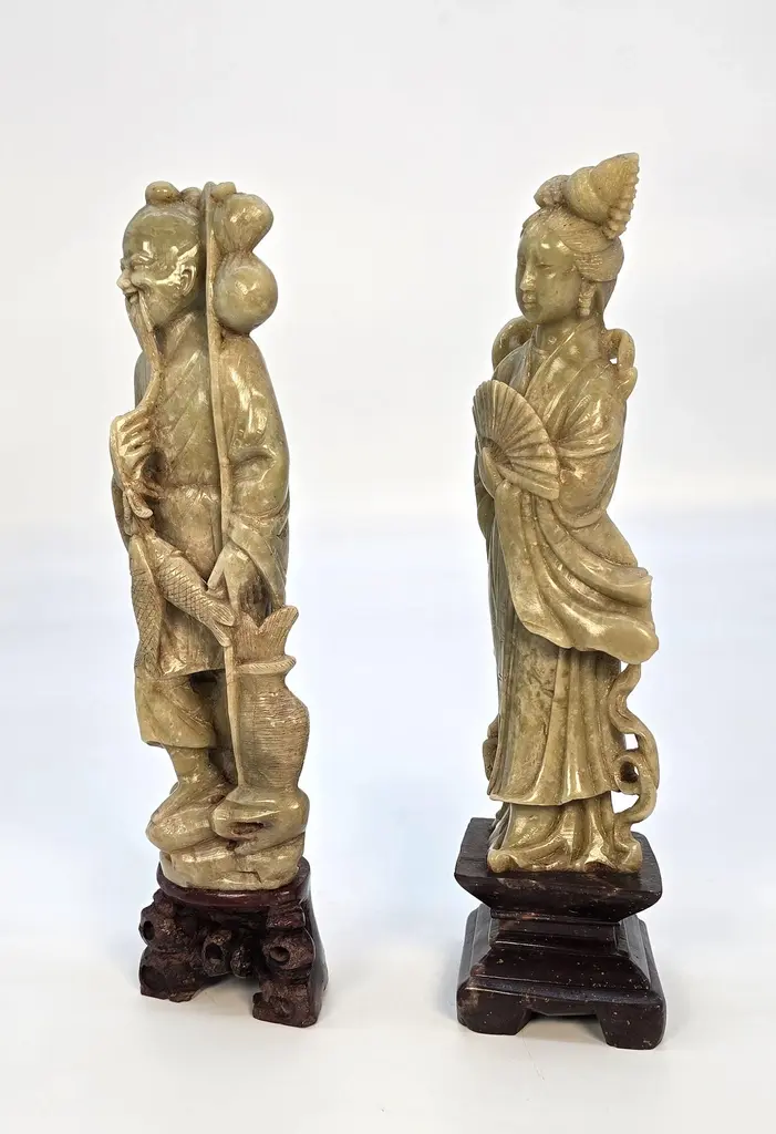This decorative pair of soapstone carvings depicts traditionally dressed figures of a man and woman. The woman is dressed in ornate robes, and she is holding a fan. The man is a fisherman, dressed in simple robes, and he is carrying his catch of fish.Both figures are of a similar size and proportion and are each carved from the same pale green jade coloured soapstone, mounted onto carved dark russet soapstone bases, each of a different design.This pleasing pair of figures is both in very good condition with no damage.Chinese, circa 1900Height 15cm x width 9cm x depth 7cm.Please let us know if you need any further information and photographs