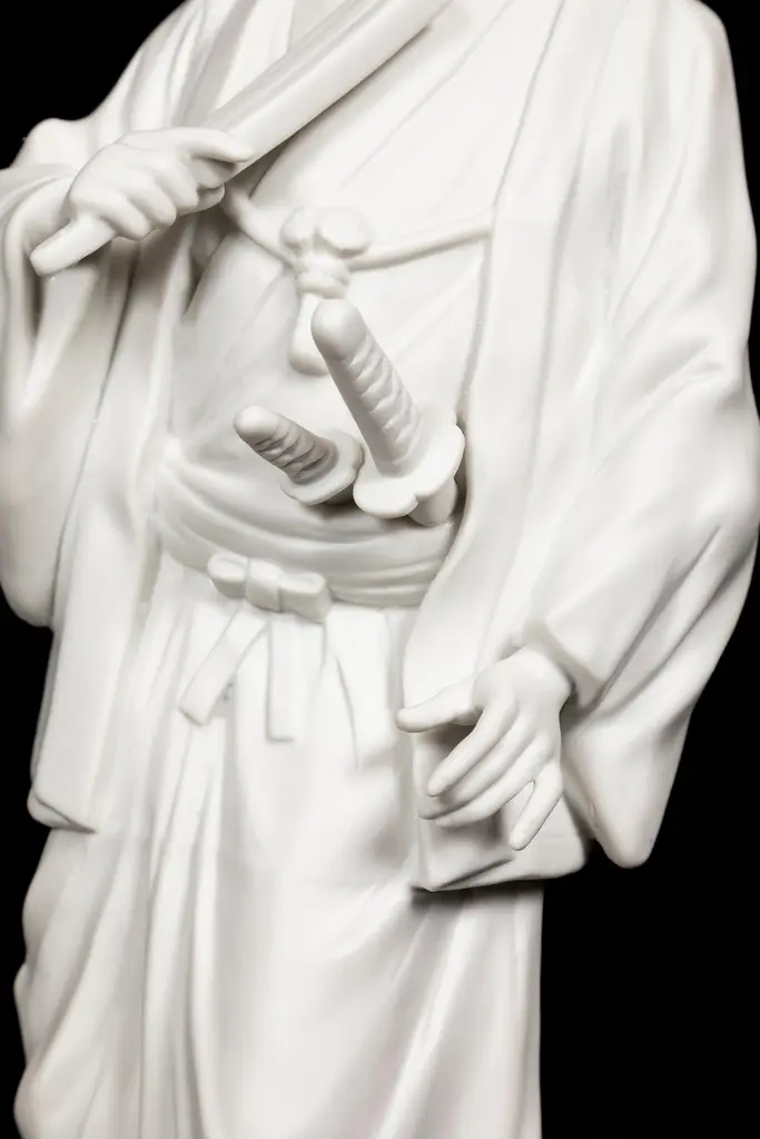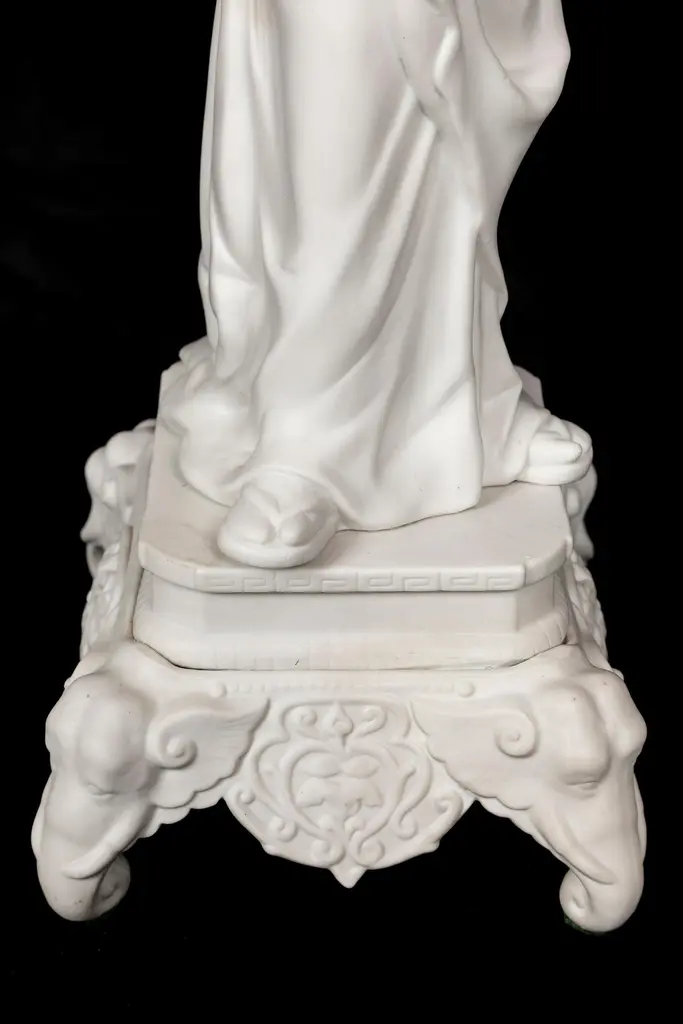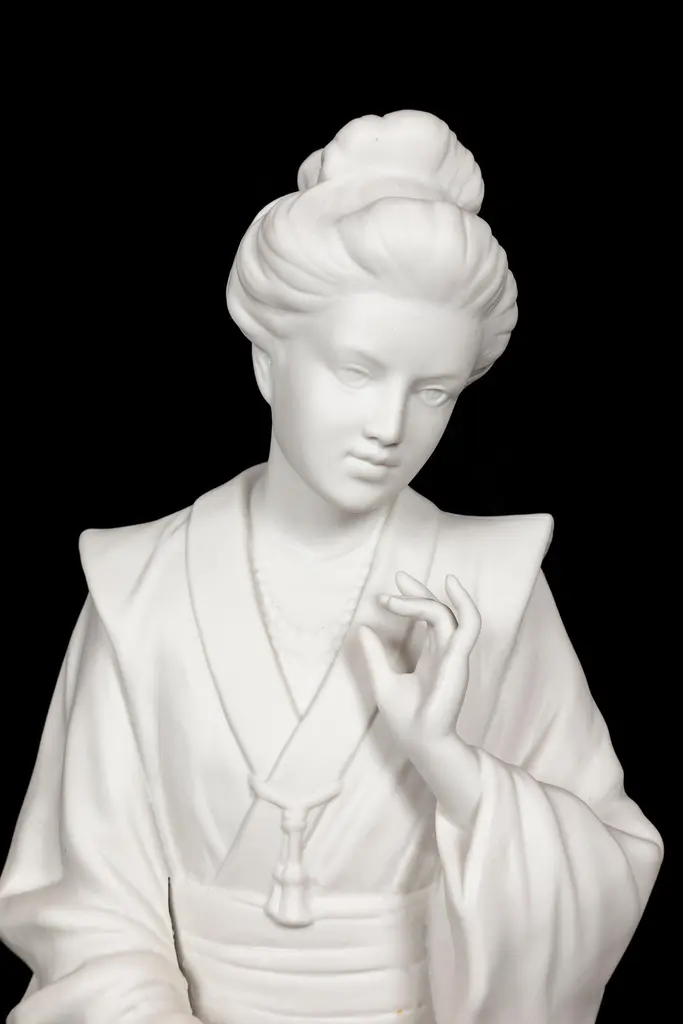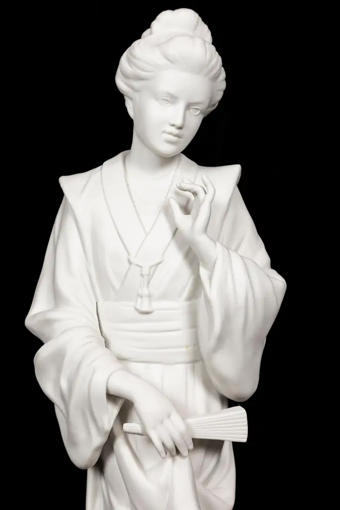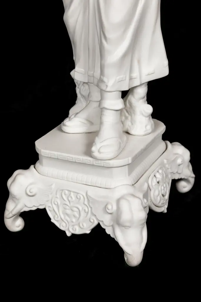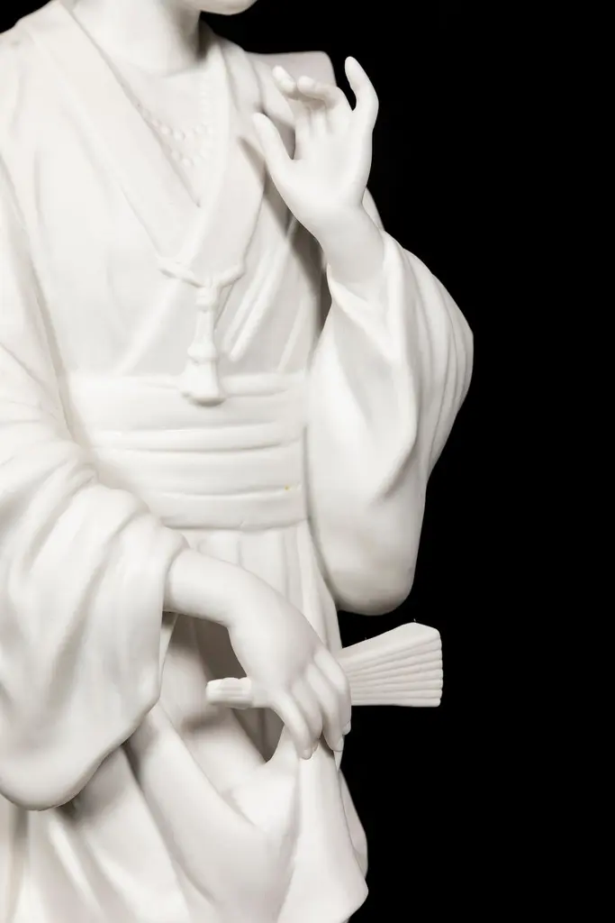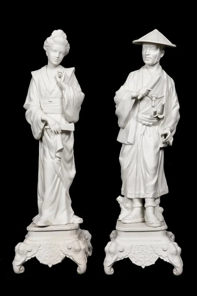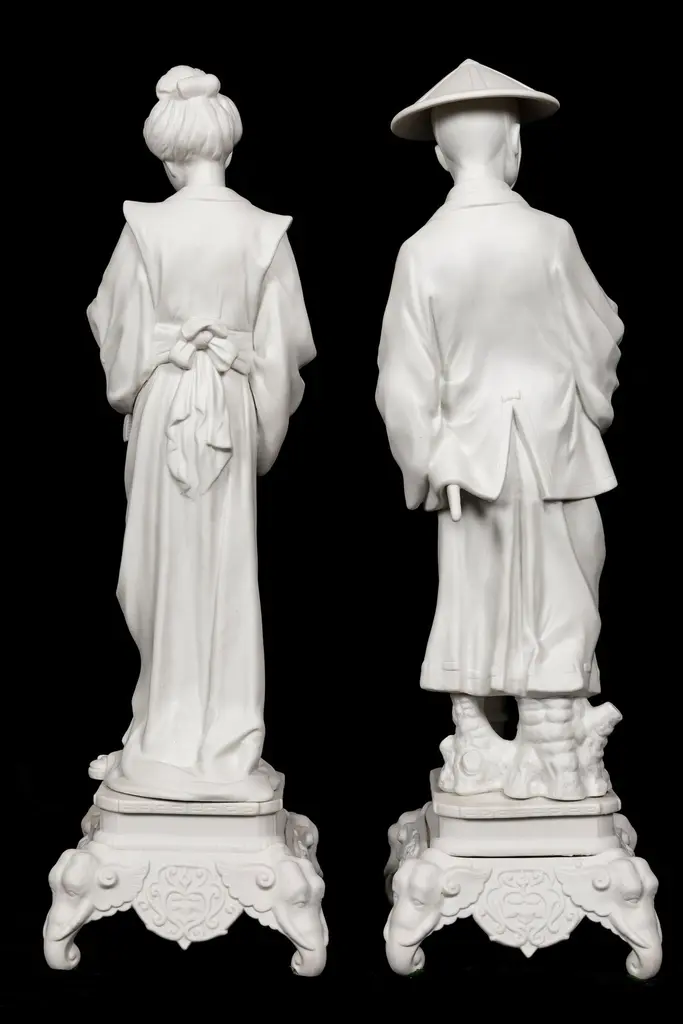 A superb pair of large French Chinoiserie-style white porcelain figures. Each figure is modeled standing on an ornate square base with elephant-head supports at the corners and scrolling foliate relief panels along the sides. The figures depict a man and a woman, both dressed in traditional East Asian attire. The male figure wears layered robes secured with a sash, a broad conical hat, and holds a fan in his right hand. At his side hang two swords inserted into the belt. The female figure is shown with her hair arranged in a high chignon, dressed in long flowing robes tied with a sash at the waist. She holds a fan in her left hand while her right hand is raised with fingers positioned in a delicate gesture.The porcelain is executed entirely in white, giving the figures a uniform matte surface typical of biscuit porcelain. The details of the garments, accessories, and facial features are carefully defined, including folds of fabric, knotted sashes, and hair arrangements. Each figure stands directly on a plinth that is integrated into the bases, which are adorned with elephant heads at the corners extending outward as supports. The borders of the plinths feature Greek key patterns around the upper edges, while the main panels display scrollwork in low relief.These figures reflect the French interest in Chinoiserie during the 20th century, when European manufacturers produced porcelain in forms and attire inspired by East Asian models. Large-scale pairs such as these were often created for decorative interiors and are characteristic of French porcelain workshops that specialized in biscuit figures, including Sèvres and other Parisian makers, who favored white porcelain for its sculptural clarity and refined surface.