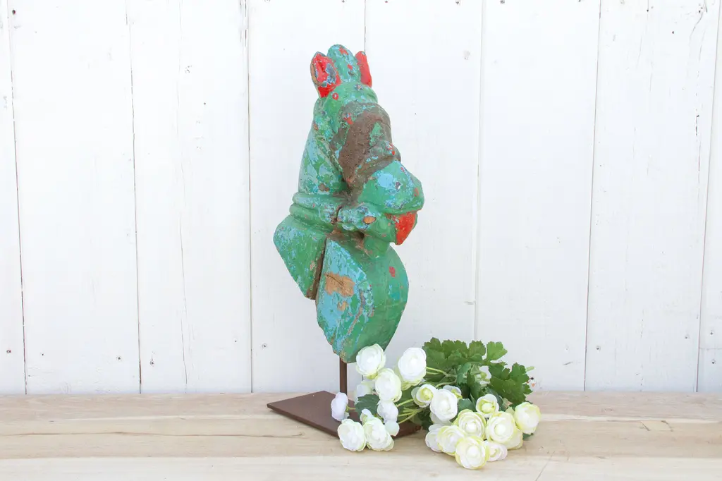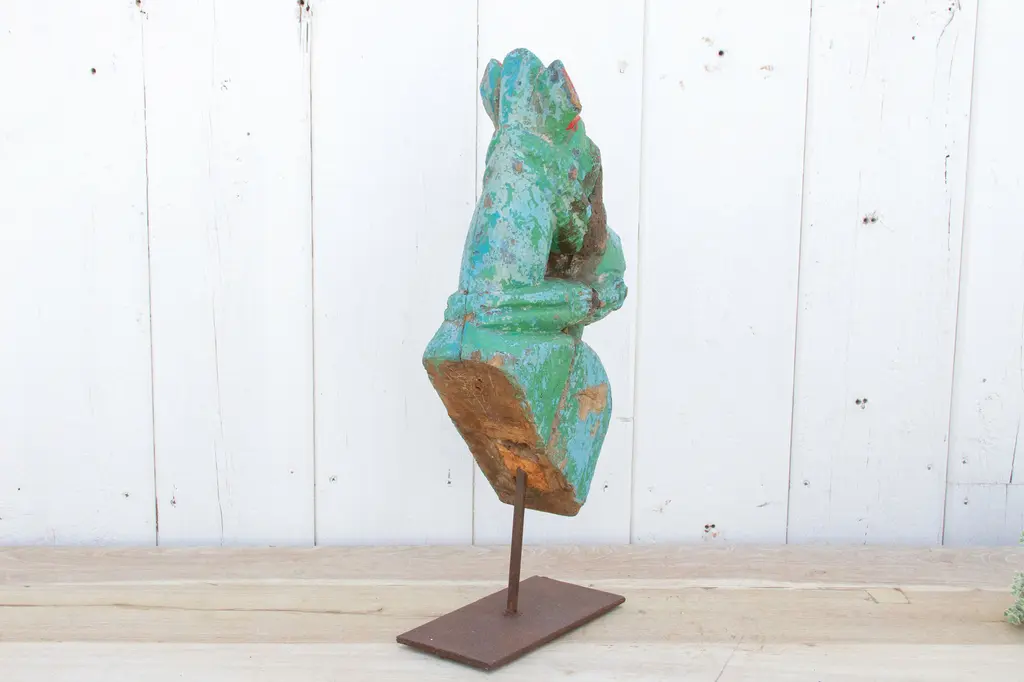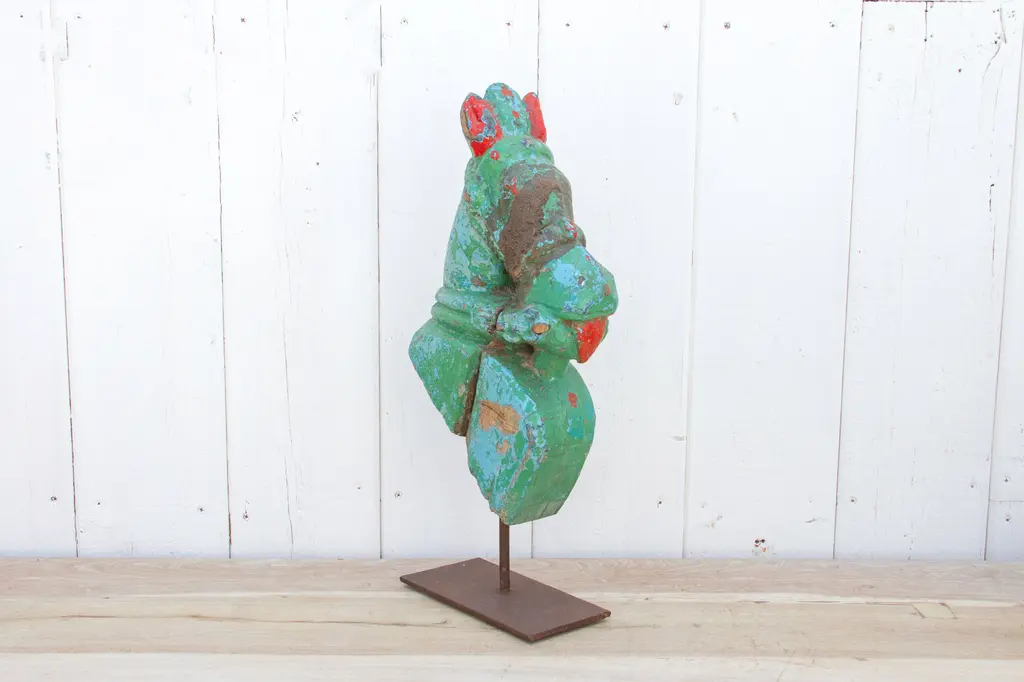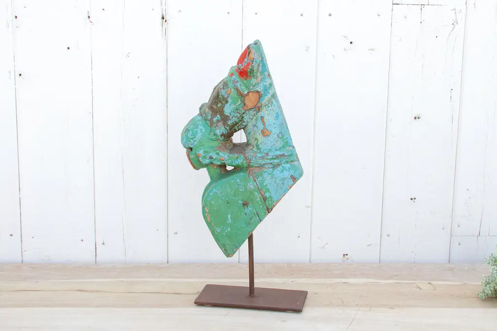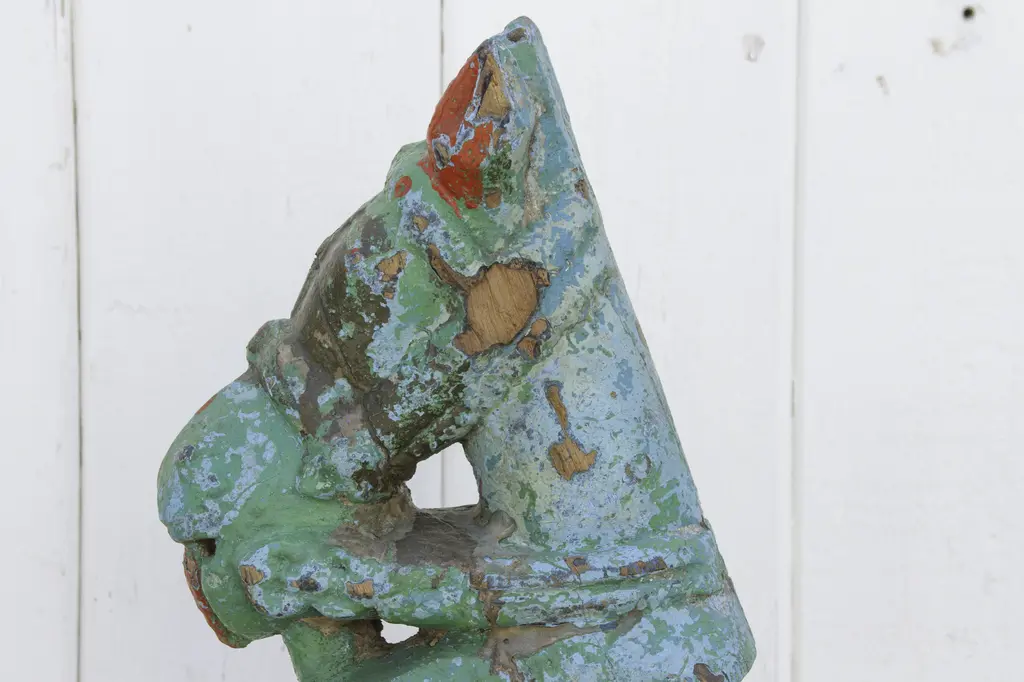Primitive architectural folk temple horse corbel. These were usually mounted on the temple doorways to ward off bad spirits. This corbel is hand-carved of dense forest wood, retains its original painted patina and is mounted on a custom iron stand.