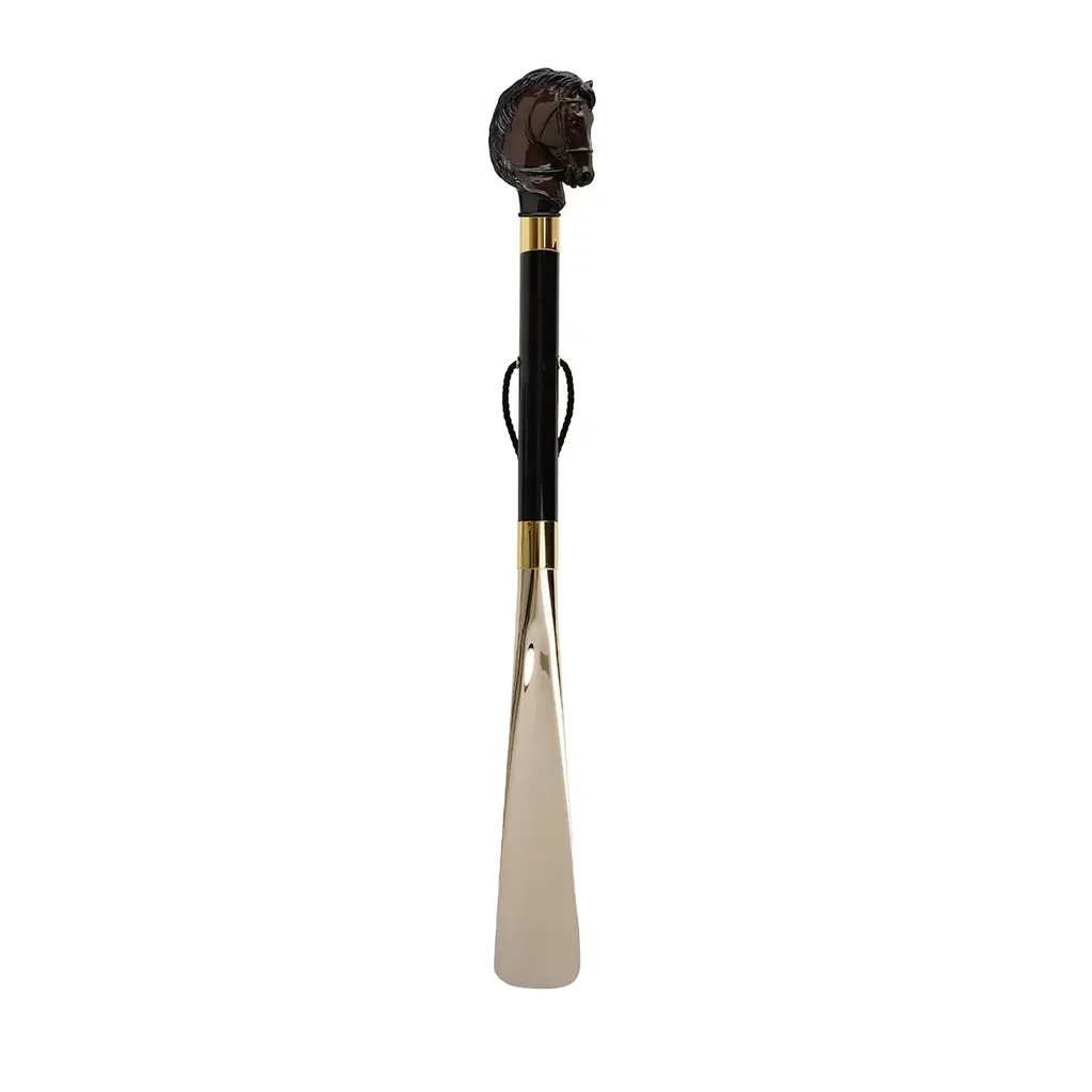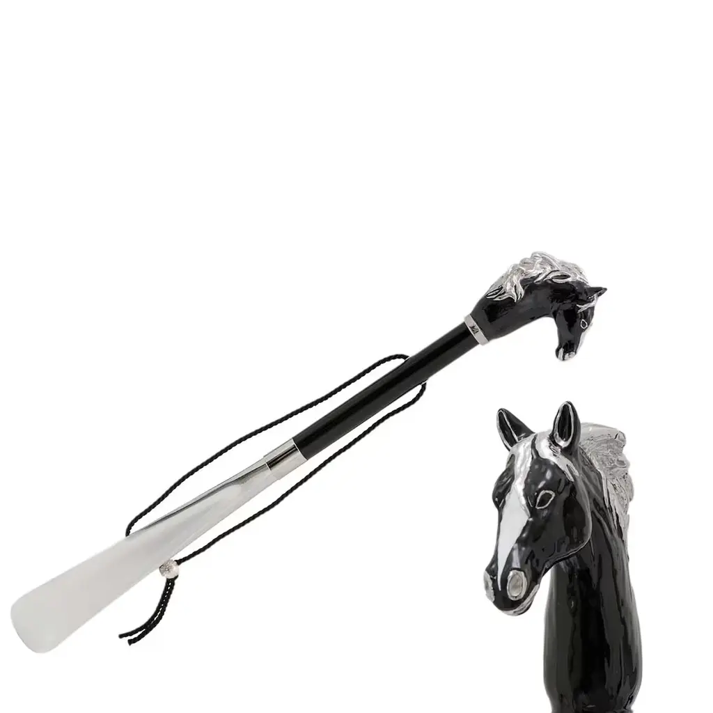 With its equestrian style, the Black Horse Shoehorn is a sophisticated and classic accessory handmade in Italy. Featuring an enameled brass handle in the form of a horse head, it has a wooden shaft, ABS end and is 50 cm in length.