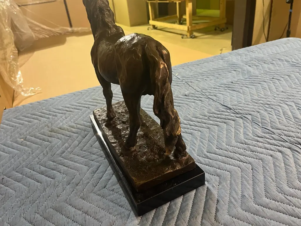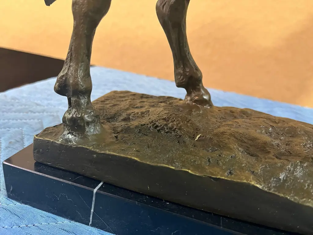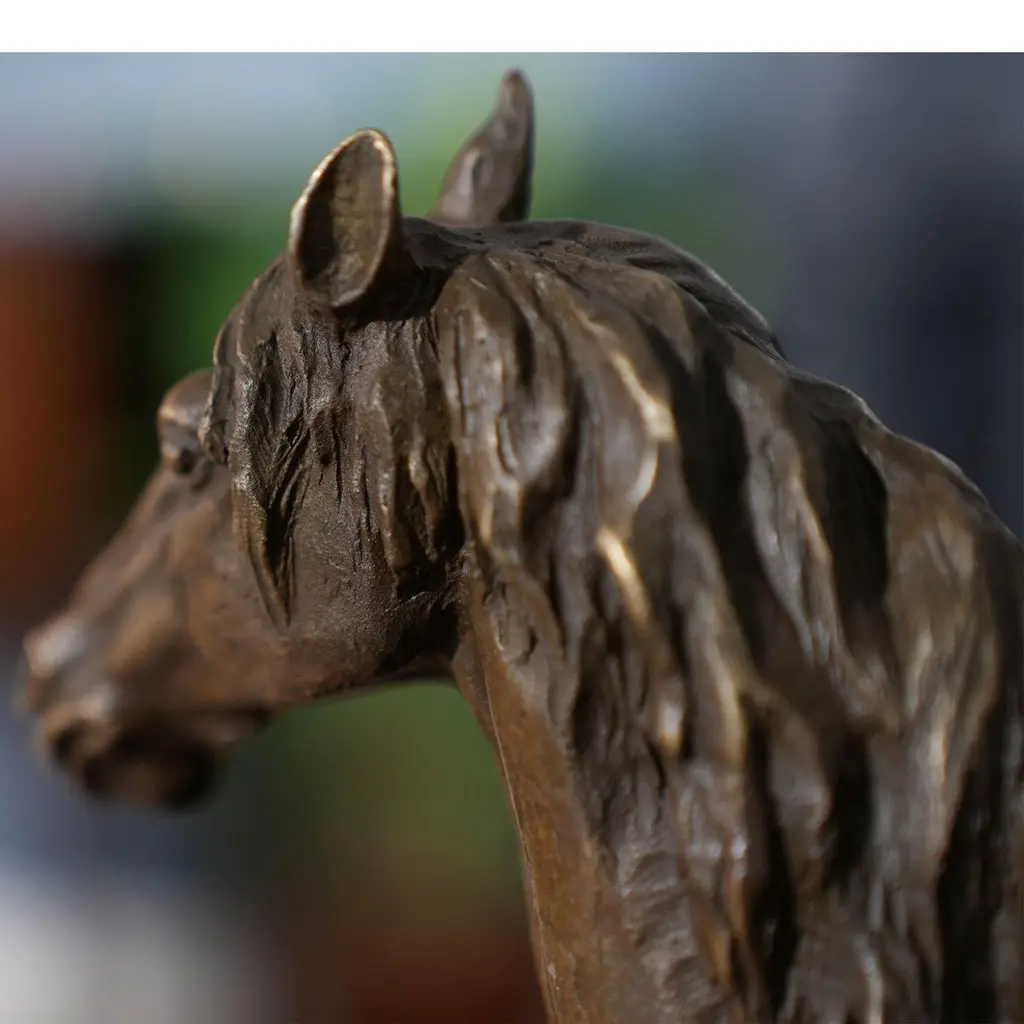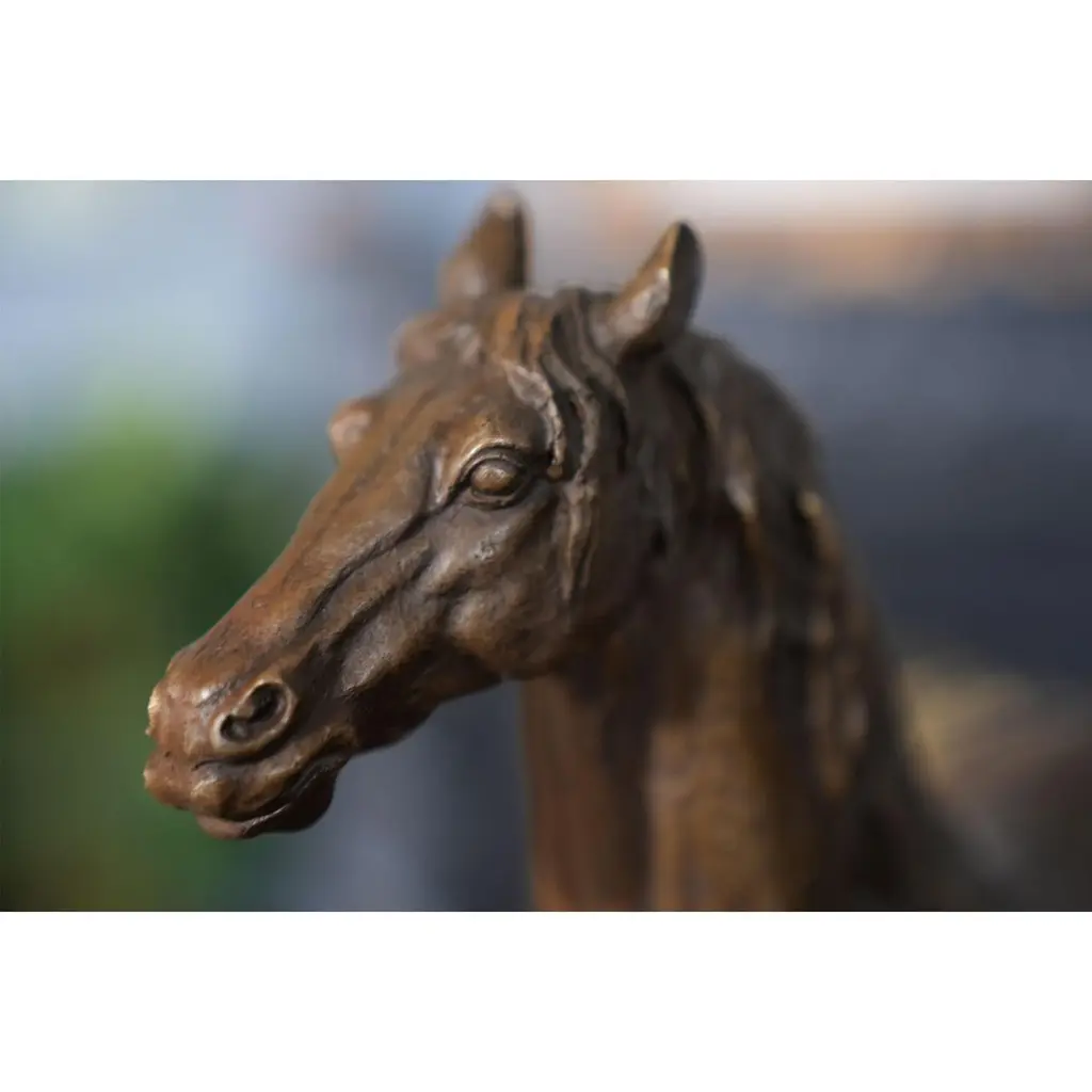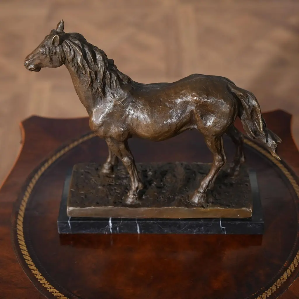 Graceful even when standing still the Bronze Horse Standing on Marble Base is a striking addition to any setting. Using traditional lost wax casting methods the horse is created in pieces and then joined together with brazing and hand chaised details are added to give a high level of detail to the figure. The horse is then mounted on a solid marble base to lend it stability as well as an enduring appearance. The Bronze Horse Standing on Marble Base is finished in a multi stage, time consuming process requiring skilled and experienced artisans. The rich and varied shades of finish lend themselves to almost any decor, they appear especially striking when displayed in a well lit area.Item Measures Approximately 17"W x 5.5"D x 15"H and weighs 25 lbs.