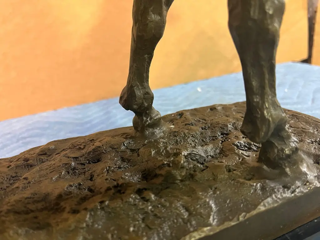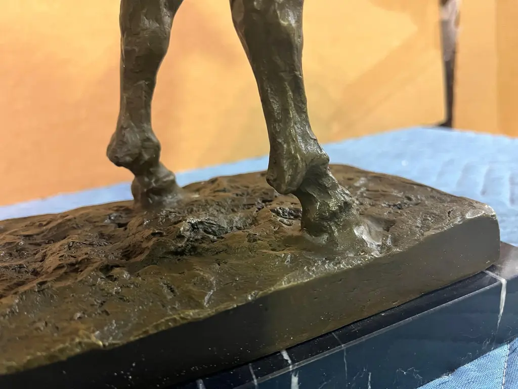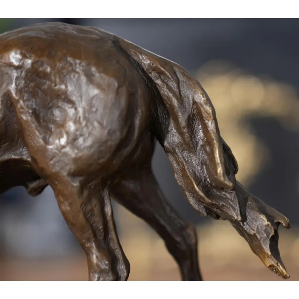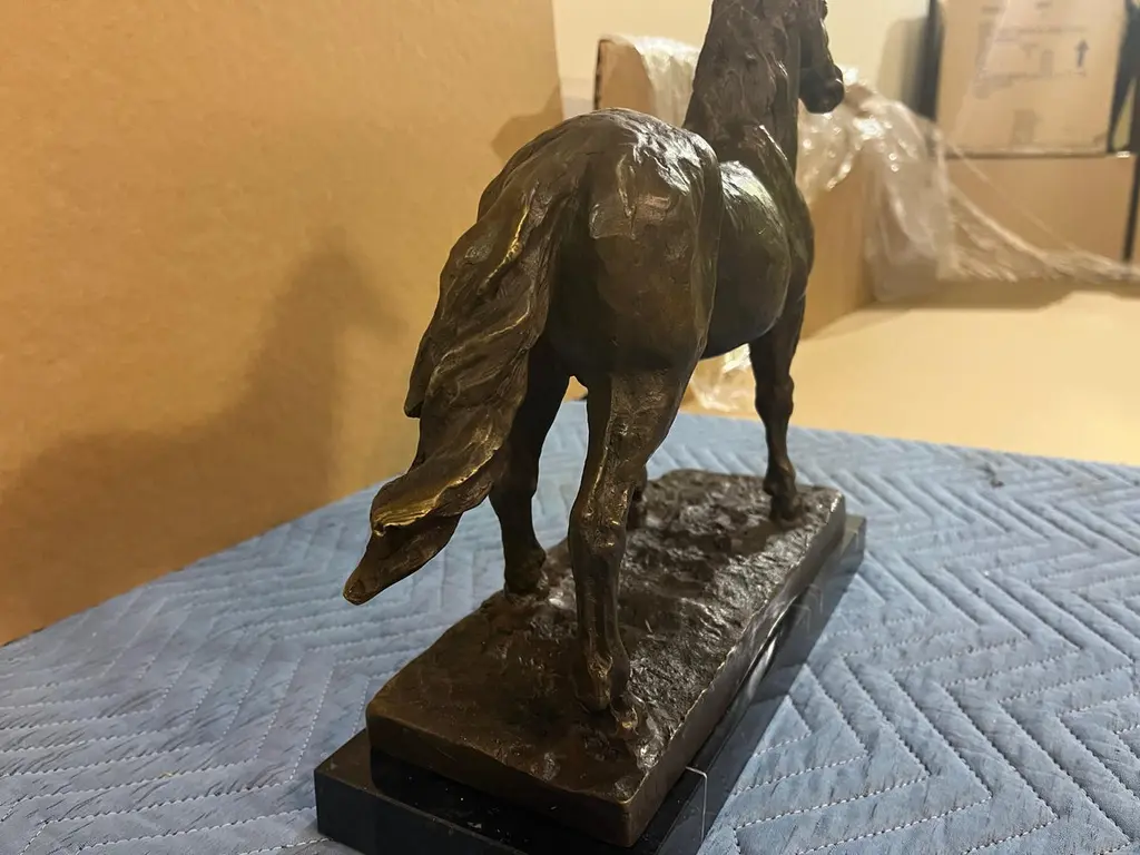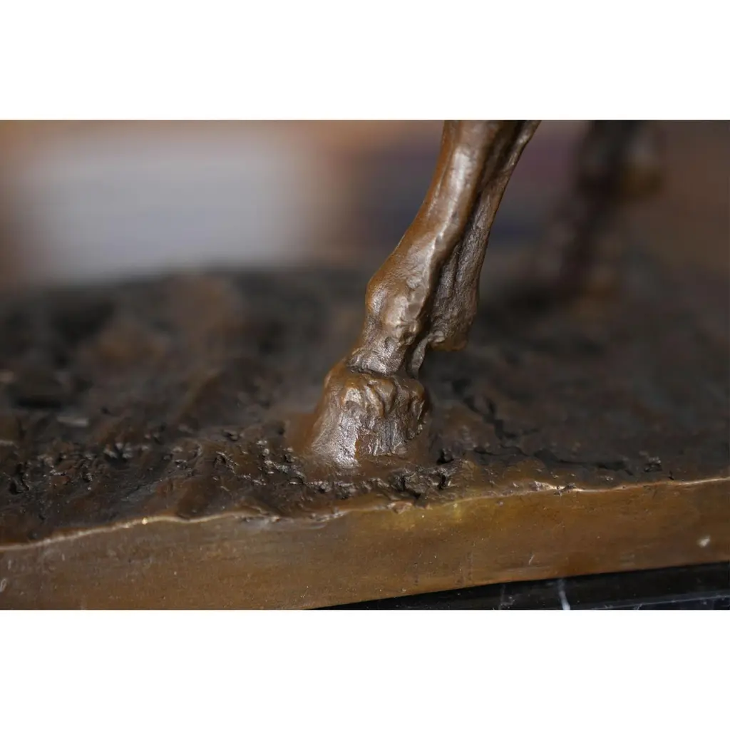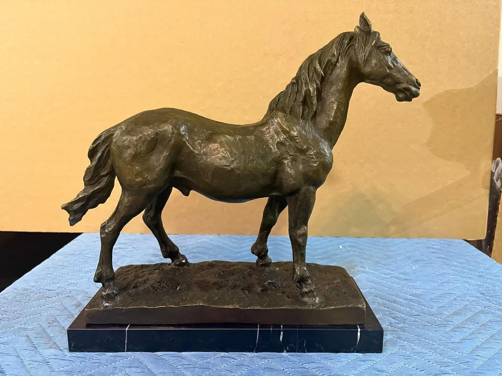 Graceful even when standing still the Bronze Horse Standing on Marble Base is a striking addition to any setting. Using traditional lost wax casting methods the horse is created in pieces and then joined together with brazing and hand chaised details are added to give a high level of detail to the figure. The horse is then mounted on a solid marble base to lend it stability as well as an enduring appearance. The Bronze Horse Standing on Marble Base is finished in a multi stage, time consuming process requiring skilled and experienced artisans. The rich and varied shades of finish lend themselves to almost any decor, they appear especially striking when displayed in a well lit area.Item Measures Approximately 17"W x 5.5"D x 15"H and weighs 25 lbs.