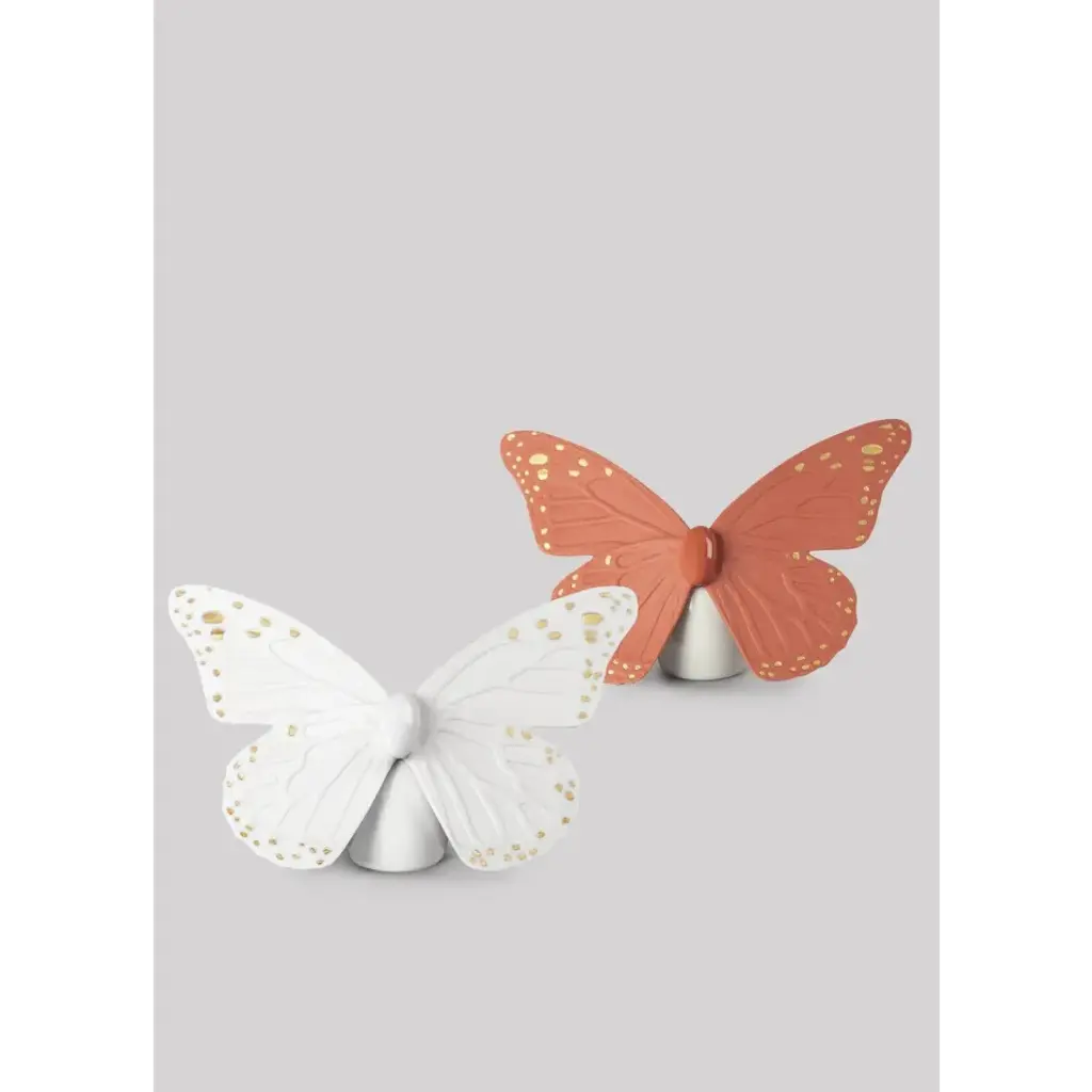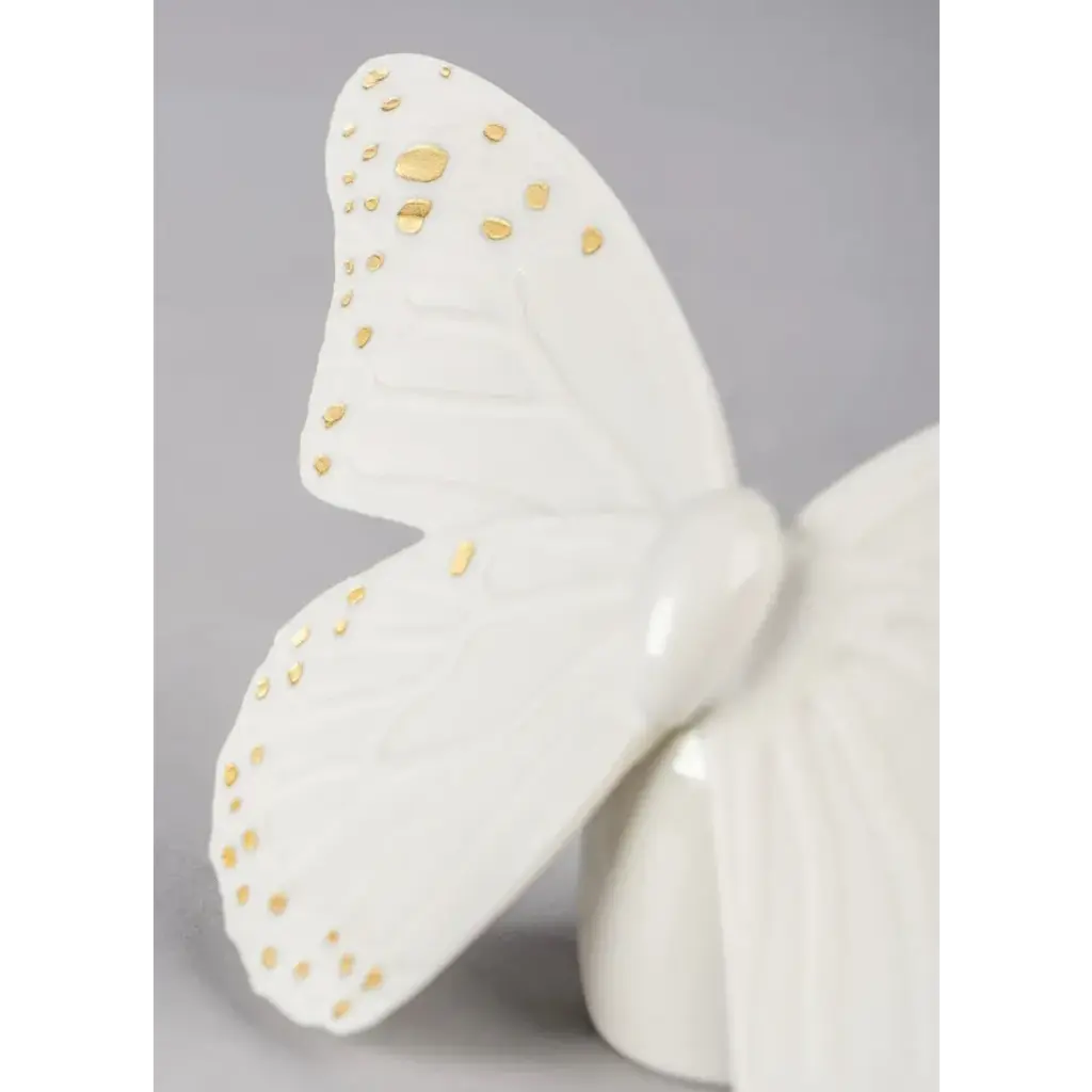 Made in glazed and matte porcelain, this delicate butterfly is decorated in white with details in golden luster. A perfect piece for decorating, as a gift for lovers of nature and animals, or for collecting. Handcrafted in the Lladró workshops in Spain. An iconic Spanish brand, Lladro is a world leader in the creation of porcelain art. Started by brothers Juan, Jose and Vicente Lladro in 1953, the ceramic figurines were initially inspired by the works of great European manufacturers like Meissen and Sevres. Over time, a unique style was forged, consisting of elongated lines, a revolutionary single-firing method, and soft pastel tones.
