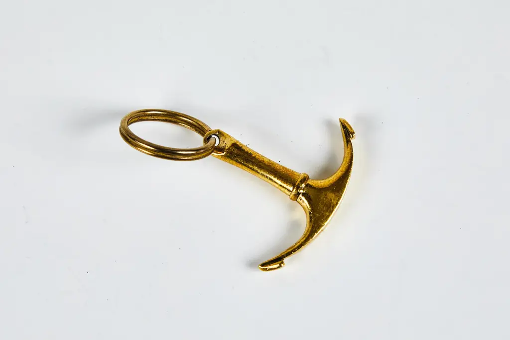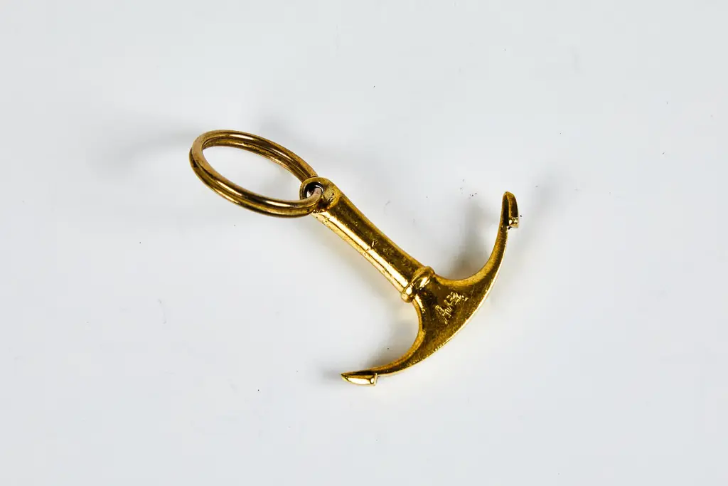 Set of four Carl Aubo¨ck brass figurine keyrings. Includes model #4500 'Pig', model #5607 'Donkey', model #5663 'Shell', model #5734 'Hand and model #7151 'Anchor'. Designed in the 1950s, these incredibly refined and sculptural objects are hand fabricated in polished brass. Price is per set of five. One sets available. Items also sold separately. One set in stock ready to ship. Available in unlimited quantities. Can take up to 8 weeks. Produced by Carl Auböck IV in the original Auböck Werkstätte in the 7th district of Vienna using the same exacting standers, high-quality materials, original molds and techniques of his legendary grandfather. Auböck's design career was long and varied, reaching its pinnacle of prestige at the Triennale di Milano in 1954, where he received four gold medals in recognition of his iconic work. 1 set in stock. Lead time can take 6 weeks or more. Finish varies from item to item due to the handmade nature of their fabrication. Available Now