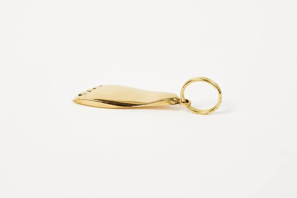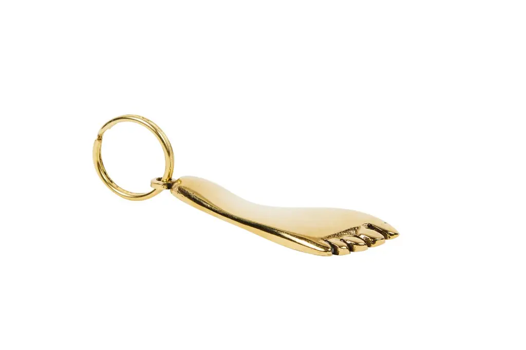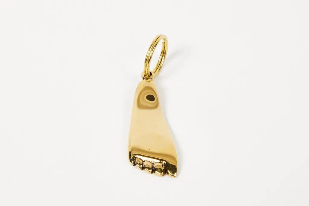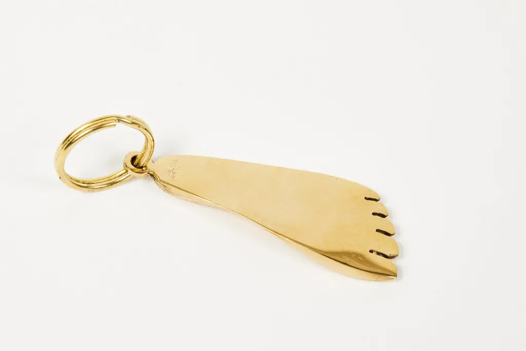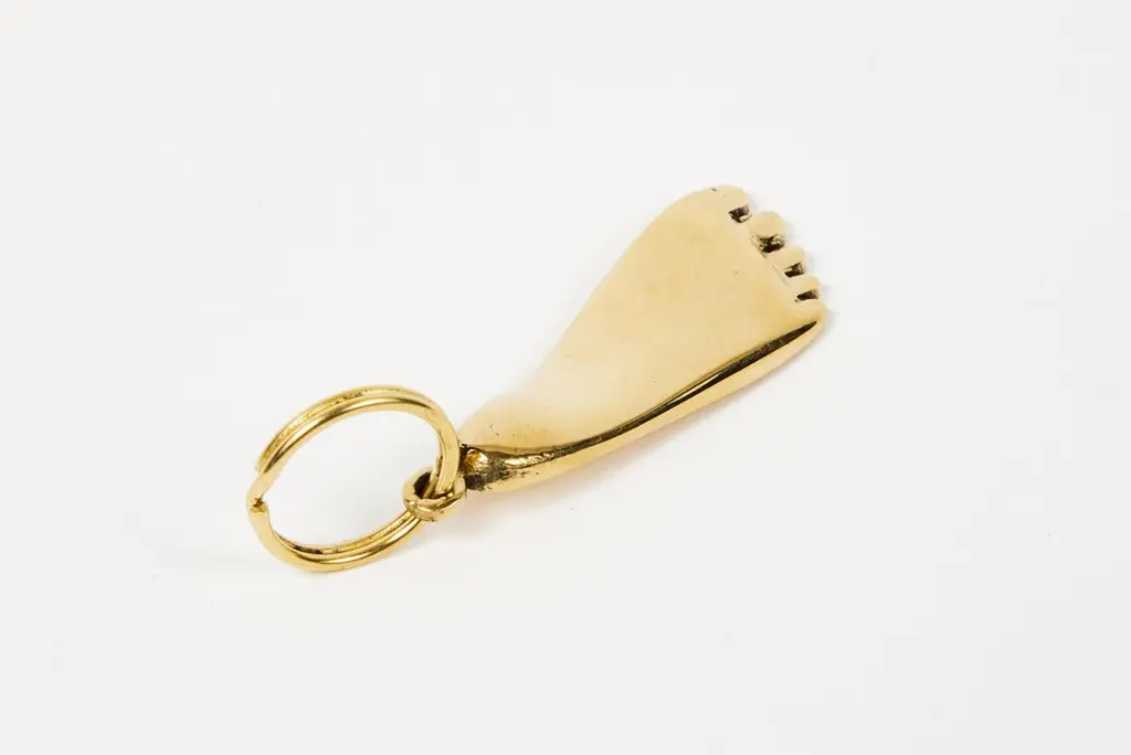 Carl Auböck model #5735 brass foot figurine keyring. Designed in the 1950s, this incredibly refined and sculptural object is hand fabricated in polished brass. Price is per item. One in stock ready to ship. Available in unlimited quantities. Please note that in-stock availability is subject to change at any time. Allow additional 3-4 weeks for items not in stock. Can take up to 8 weeks. Each piece is stamped 'Auböck' on the bottom.Produced by Carl Auböck IV in the original Auböck Werkstätte in the 7th district of Vienna using the same exacting standards, high-quality materials, original molds and techniques of his legendary grandfather. Auböck's design career was long and varied, reaching its pinnacle of prestige at the Triennale di Milano in 1954, where he received four gold medals in recognition of his iconic work.Please note that only one representative example of each item is shown in the images. Finish varies from item to item due to the handmade nature of their fabrication.