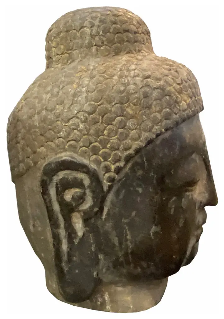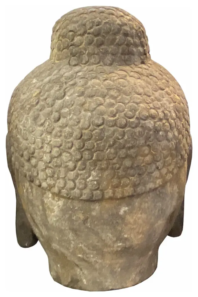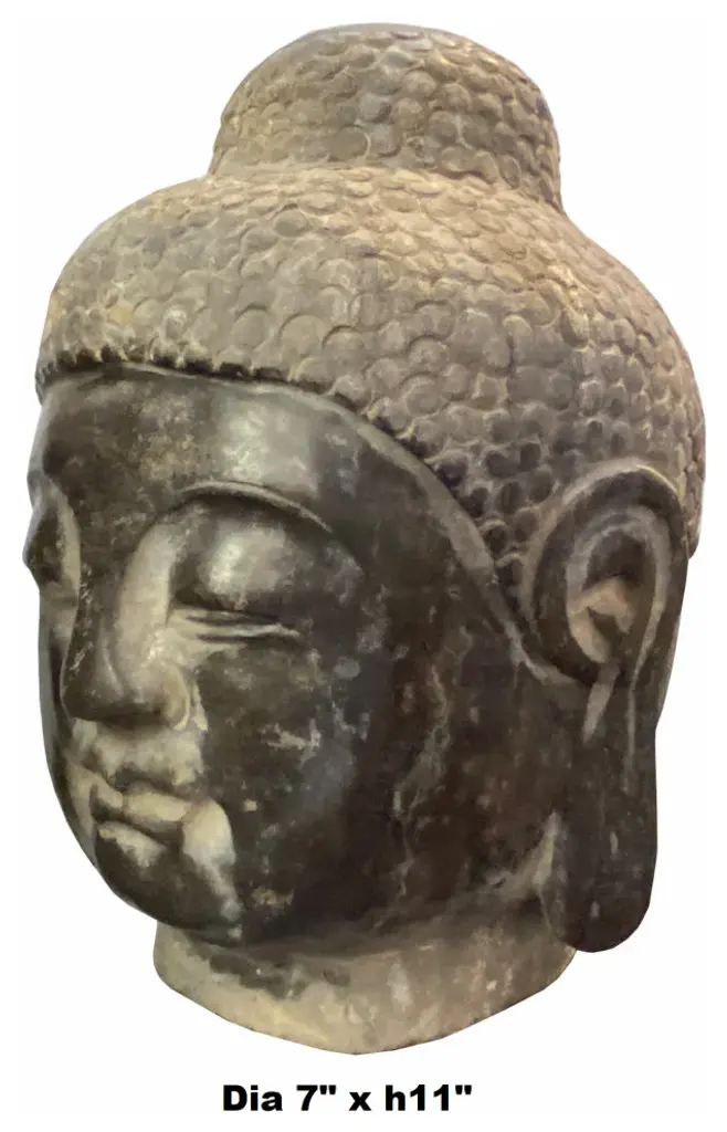 This is a Chinese decorative stone Buddha head statue. Hand-carved, it shows the draft and raw carving marks on the surface.Dimensions: Dia 7" x h11" Origin: ChinaMaterial: StoneCondition: stone chip marks, as it, variation in stone marks
