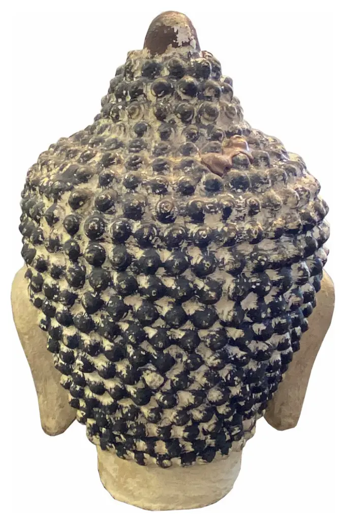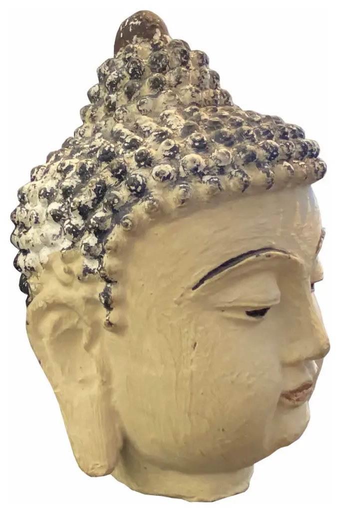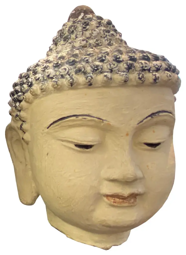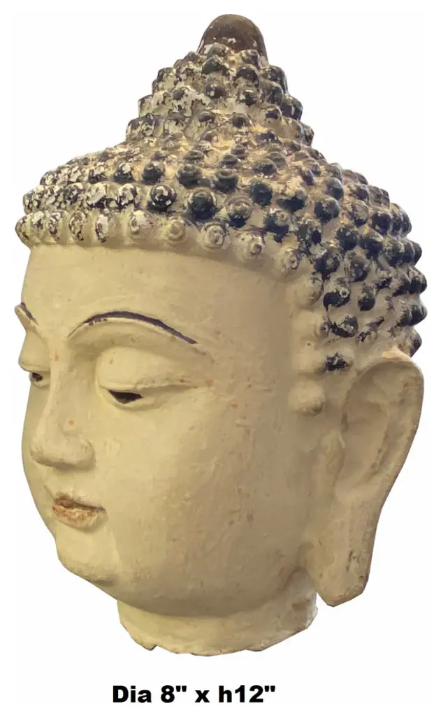 This is a Chinese decorative metal Buddha head statue. It has a layer of beige color paint for the face and distressed black marks for the head.Dimensions: Dia 8" x h12" Origin: ChinaMaterial: MetalCondition: paint chip marks, as it.