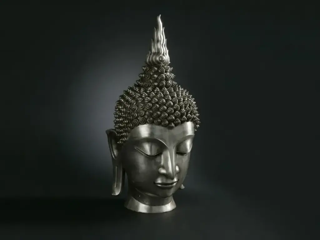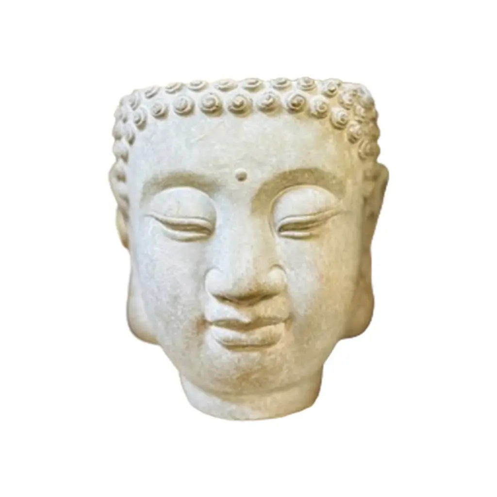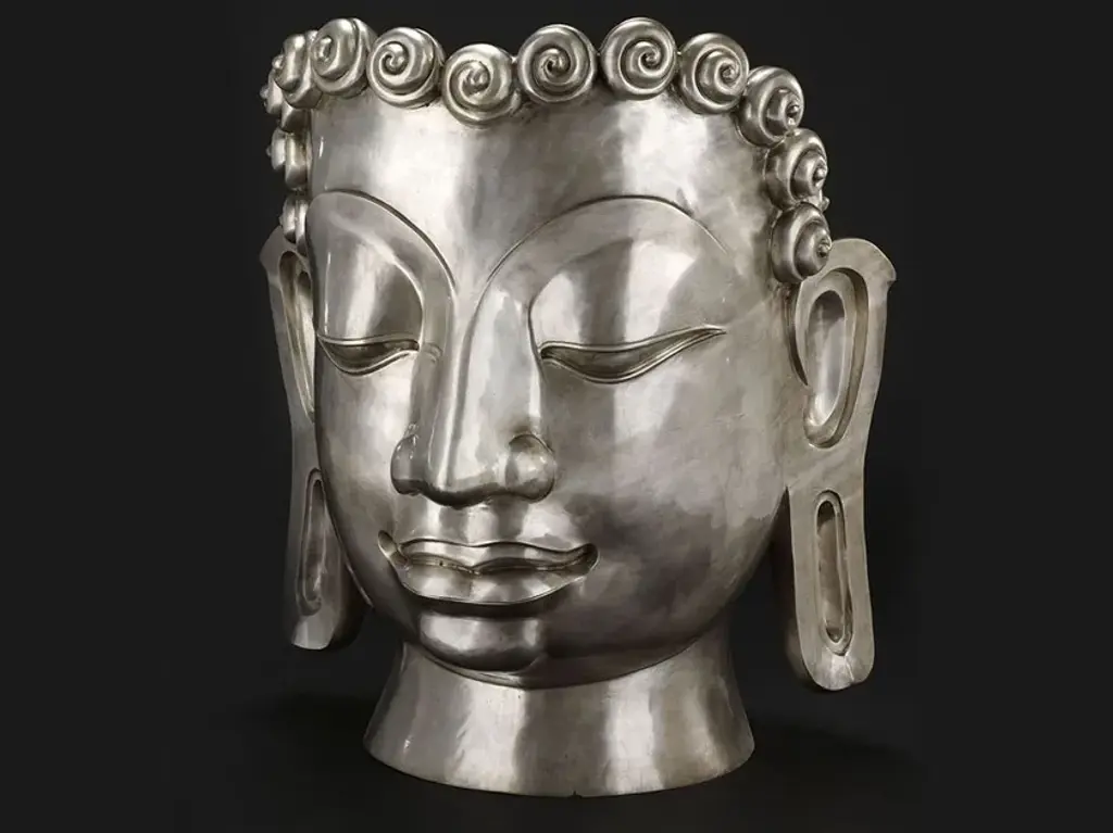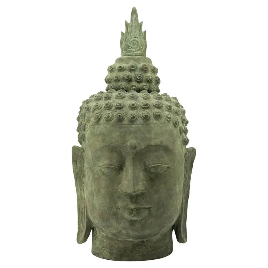 This is a Chinese decorative metal Buddha head statue. It has a layer of beige color paint for the face and distressed black marks for the head.Dimensions: Dia 8" x h12" Origin: ChinaMaterial: MetalCondition: paint chip marks, as it.